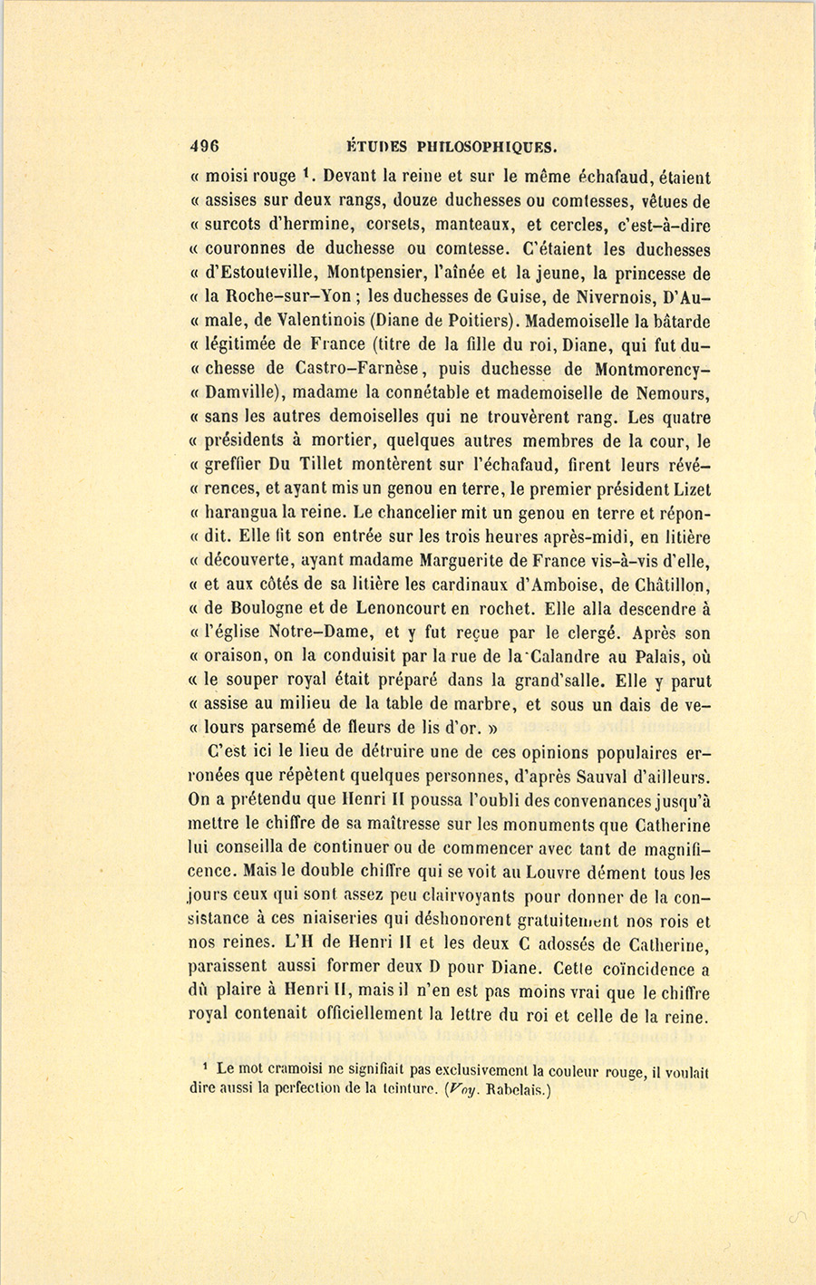 C’est ici le lieu de détruire une de ces opinions populaires erronées que répètent quelques personnes, d’après Sauval d’ailleurs. On a prétendu que Henri II poussa l’oubli des convenances jusqu’à mettre le chiffre de sa maîtresse sur les monuments que Catherine lui conseilla de continuer ou de commencer avec tant de magnificence. Mais le double chiffre qui se voit au Louvre dément tous les jours ceux qui sont assez peu clairvoyants pour donner de la consistance à ces niaiseries qui déshonorent gratuitement nos rois et nos reines. L’H de Henri II et les deux C adossés de Catherine, paraissent aussi former deux D pour Diane. Cette coïncidence a dû plaire à Henri II, mais il n’en est pas moins vrai que le chiffre royal contenait officiellement la lettre du roi et celle de la reine. {p. 497} Et cela est si vrai, que ce chiffre existe encore sur la colonne de la Halle au Blé, bâtie par Catherine seule. On peut d’ailleurs voir ce même chiffre dans les caveaux de Saint-Denis sur le tombeau que Catherine se fit élever à elle-même de son vivant à côté de celui de Henri II, et où elle est représentée d’après nature par le sculpteur pour qui elle a posé.