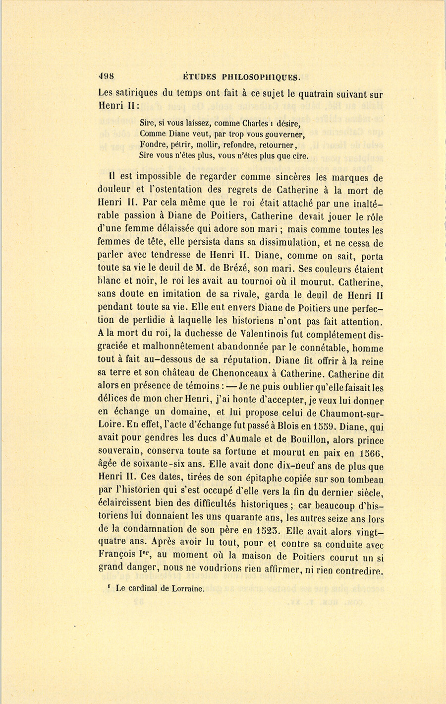 Après la tentative inutilement faite par le connétable en sa faveur, et qu’il faut reporter à l’année 1556, Catherine caressa beaucoup les Guise, et forma le projet de les détacher du parti de Diane afin de les opposer au connétable. Mais, malheureusement, Diane et le connétable étaient tout aussi animés que les Guise contre les Protestants. Il n’y eut donc pas dans leur lutte cette animosité qu’y aurait mise la question religieuse. D’ailleurs, Diane rompit en visière aux projets de la reine, en coquetant avec les Guise et donnant sa fille au duc d’Aumale. Elle alla si loin, que certains auteurs prétendent qu’elle accorda plus que ses bonnes grâces au galant cardinal de Lorraine. {p. 498} Les satiriques du temps ont fait à ce sujet le quatrain suivant sur Henri II :