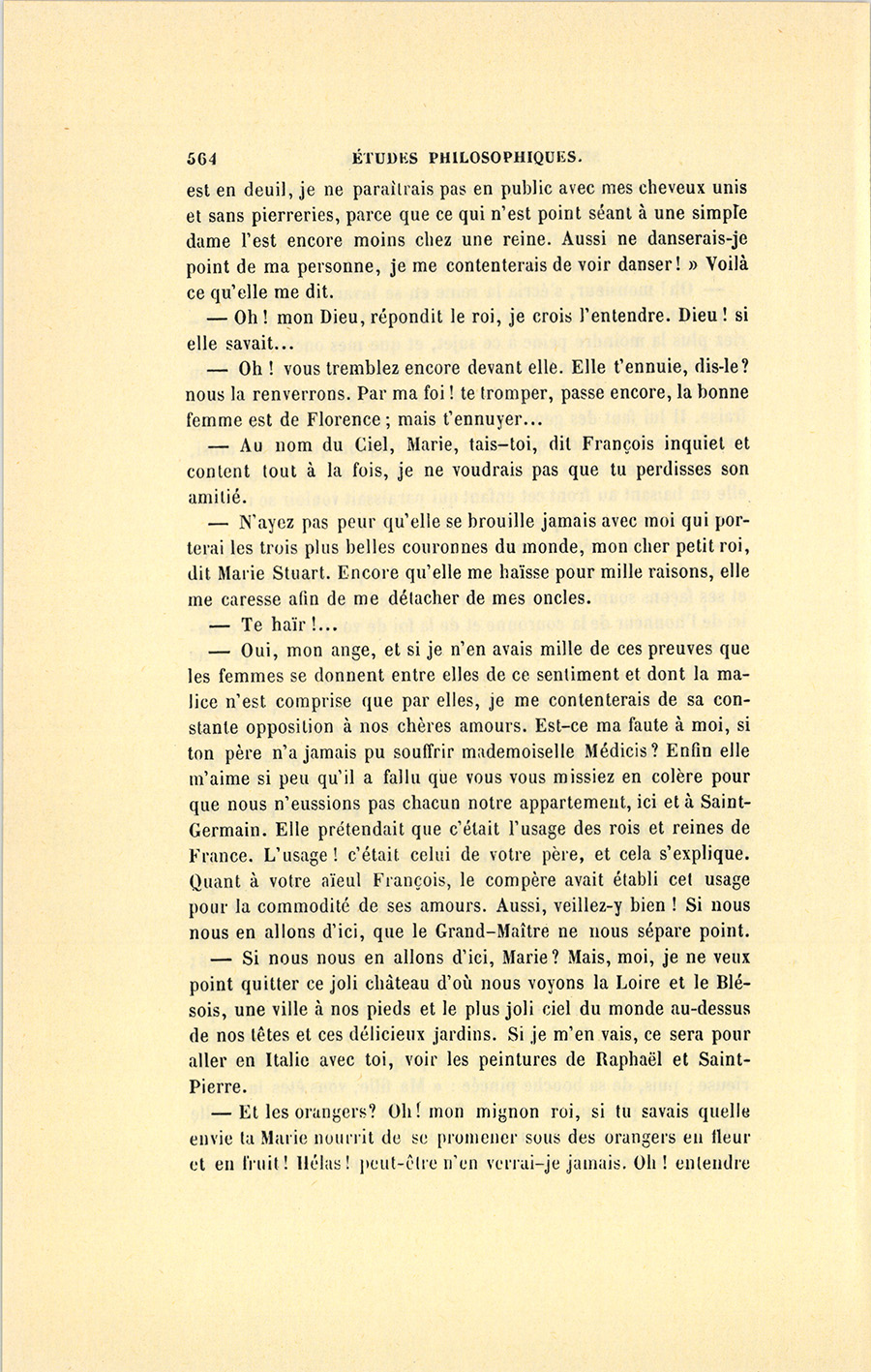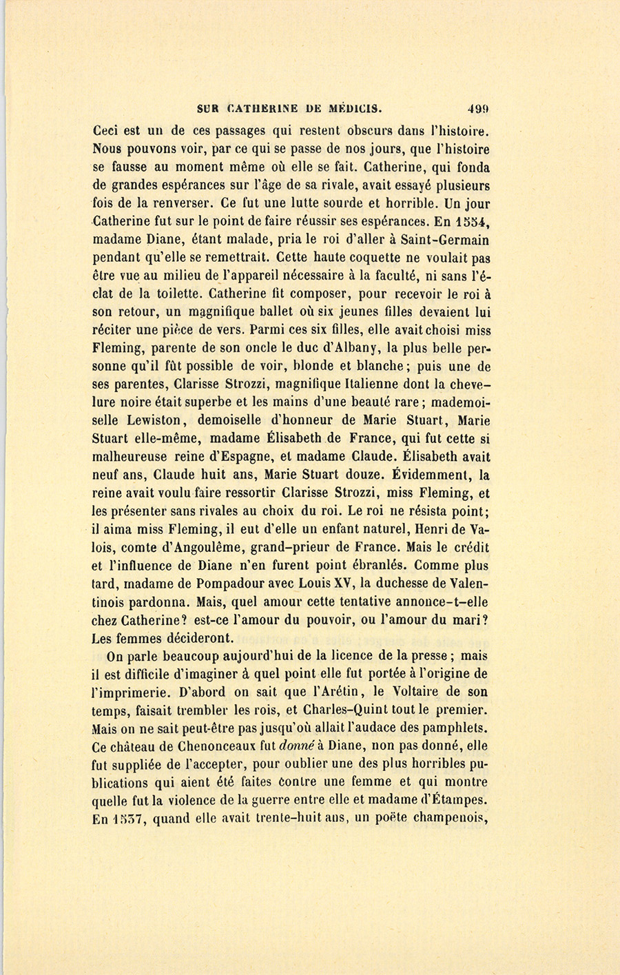Il est impossible de regarder comme sincères les marques de douleur et l’ostentation des regrets de Catherine à la mort de Henri II. Par cela même que le roi était attaché par une inaltérable passion à Diane de Poitiers, Catherine devait jouer le rôle d’une femme délaissée qui adore son mari ; mais comme toutes les femmes de tête, elle persista dans sa dissimulation, et ne cessa de parler avec tendresse de Henri II. Diane, comme on sait, porta toute sa vie le deuil de monsieur de Brézé, son mari. Ses couleurs étaient blanc et noir, le roi les avait au tournoi où il mourut. Catherine, sans doute en imitation de sa rivale, garda le deuil de Henri II pendant toute sa vie. Elle eut envers Diane de Poitiers une perfection de perfidie à laquelle les historiens n’ont pas fait attention. À la mort du roi, la duchesse de Valentinois fut complétement disgraciée et malhonnêtement abandonnée par le connétable, homme tout à fait au-dessous de sa réputation. Diane fit offrir à la reine sa terre et son château de Chenonceaux à Catherine. Catherine dit alors en présence de témoins : – Je ne puis oublier qu’elle faisait les délices de mon cher Henri, j’ai honte d’accepter, je veux lui donner en échange un domaine, et lui propose celui de Chaumont-sur-Loire. En effet, l’acte d’échange fut passé à Blois en 1559. Diane, qui avait pour gendres les ducs d’Aumale et de Bouillon, alors prince souverain, conserva toute sa fortune et mourut en paix en 1566, âgée de soixante-six ans. Elle avait donc dix-neuf ans de plus que Henri II. Ces dates, tirées de son épitaphe copiée sur son tombeau par l’historien qui s’est occupé d’elle vers la fin du dernier siècle, éclaircissent bien des difficultés historiques ; car beaucoup d’historiens lui donnaient les uns quarante ans, les autres seize ans lors de la condamnation de son père en 1523. Elle avait alors vingt-quatre ans. Après avoir lu tout, pour et contre sa conduite avec François Ier, au moment où la maison de Poitiers courut un si grand danger, nous ne voudrions rien affirmer, ni rien contredire. {p. 499} Ceci est un de ces passages qui restent obscurs dans l’histoire. Nous pouvons voir, par ce qui se passe de nos jours, que l’histoire se fausse au moment même où elle se fait. Catherine, qui fonda de grandes espérances sur l’âge de sa rivale, avait essayé plusieurs fois de la renverser. Ce fut une lutte sourde et horrible. Un jour Catherine fut sur le point de faire réussir ses espérances. En 1554, madame Diane, étant malade, pria le roi d’aller à Saint-Germain pendant qu’elle se remettrait. Cette haute coquette ne voulait pas être vue au milieu de l’appareil nécessaire à la faculté, ni sans l’éclat de la toilette. Catherine fit composer, pour recevoir le roi à son retour, un magnifique ballet où six jeunes filles devaient lui réciter une pièce de vers. Parmi ces six filles, elle avait choisi miss Fleming, parente de son oncle le duc d’Albany, la plus belle personne qu’il fût possible de voir, blonde et blanche ; puis une de ses parentes, Clarisse Strozzi, magnifique Italienne dont la chevelure noire était superbe et les mains d’une beauté rare ; mademoiselle Lewiston, demoiselle d’honneur de Marie Stuart, Marie Stuart elle-même, madame Élisabeth de France, qui fut cette si malheureuse reine d’Espagne, et madame Claude. Élisabeth avait neuf ans, Claude huit ans, Marie Stuart douze. Évidemment, la reine avait voulu faire ressortir Clarisse Strozzi, miss Fleming, et les présenter sans rivales au choix du roi. Le roi ne résista point ; il aima miss Fleming, il eut d’elle un enfant naturel, Henri de Valois, comte d’Angoulême, grand-prieur de France. Mais le crédit et l’influence de Diane n’en furent point ébranlés. Comme plus tard, madame de Pompadour avec Louis XV, la duchesse de Valentinois pardonna. Mais, quel amour cette tentative annonce-t-elle chez Catherine ? est-ce l’amour du pouvoir, ou l’amour du mari ? Les femmes décideront.
