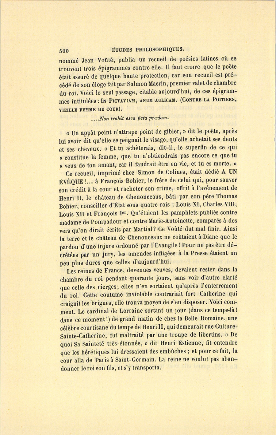 On parle beaucoup aujourd’hui de la licence de la presse ; mais il est difficile d’imaginer à quel point elle fut portée à l’origine de l’imprimerie. D’abord on sait que l’Arétin, le Voltaire de son temps, faisait trembler les rois, et Charles-Quint tout le premier. Mais on ne sait peut-être pas jusqu’où allait l’audace des pamphlets. Ce château de Chenonceaux fut donné à Diane, non pas donné, elle fut suppliée de l’accepter, pour oublier une des plus horribles publications qui aient été faites contre une femme et qui montre quelle fut la violence de la guerre entre elle et madame d’Étampes. En 1537, quand elle avait trente-huit ans, un poëte champenois, {p. 500} nommé Jean Voûté, publia un recueil de poésies latines où se trouvent trois épigrammes contre elle. Il faut croire que le poëte était assuré de quelque haute protection, car son recueil est précédé de son éloge fait par Salmon Macrin, premier valet de chambre du roi. Voici le seul passage, citable aujourd’hui, de ces épigrammes intitulées : In Pictaviam, anum aulicam. (Contre la Poitiers, vieille femme de cour.)