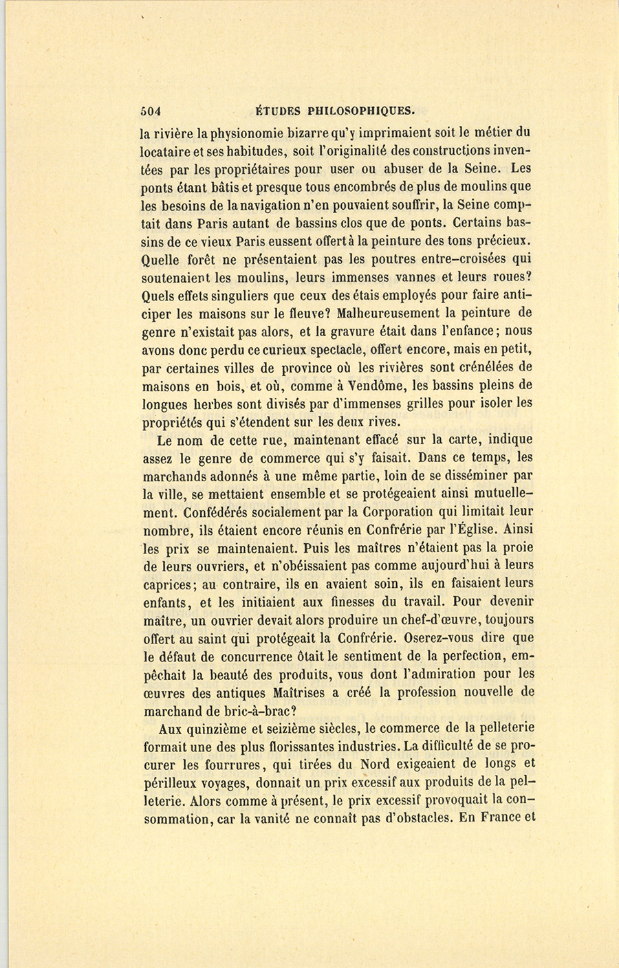 En 1560, les maisons de la rue de la Vieille-Pelleterie bordaient la rive gauche de la Seine, entre le pont Notre-Dame et le Pont-au-Change. La voie publique et les maisons occupaient l’espace pris par la seule chaussée du quai actuel. Chaque maison, assise sur la Seine même, permettait aux habitants d’y descendre par les escaliers en bois ou en pierre, que défendaient de fortes grilles en fer ou des portes en bois clouté. Ces maisons avaient, comme celles de Venise, une porte en terre ferme et une porte d’eau. Au moment où cette esquisse se publie, il n’existe plus qu’une seule maison de ce genre qui puisse rappeler le vieux Paris, encore disparaîtra-t-elle bientôt ; elle est au coin du Petit-Pont, en face du corps de garde de l’Hôtel-Dieu. Autrefois, chaque logis présentait du côté de {p. 504} la rivière la physionomie bizarre qu’y imprimaient soit le métier du locataire et ses habitudes, soit l’originalité des constructions inventées par les propriétaires pour user ou abuser de la Seine. Les ponts étant bâtis et presque tous encombrés de plus de moulins que les besoins de la navigation n’en pouvaient souffrir, la Seine comptait dans Paris autant de bassins clos que de ponts. Certains bassins de ce vieux Paris eussent offert à la peinture des tons précieux. Quelle forêt ne présentaient pas les poutres entre-croisées qui soutenaient les moulins, leurs immenses vannes et leurs roues ? Quels effets singuliers que ceux des étais employés pour faire anticiper les maisons sur le fleuve ? Malheureusement la peinture de genre n’existait pas alors, et la gravure était dans l’enfance ; nous avons donc perdu ce curieux spectacle, offert encore, mais en petit, par certaines villes de province où les rivières sont crénelées15 de maisons en bois, et où, comme à Vendôme, les bassins pleins de longues herbes sont divisés par d’immenses grilles pour isoler les propriétés qui s’étendent sur les deux rives.