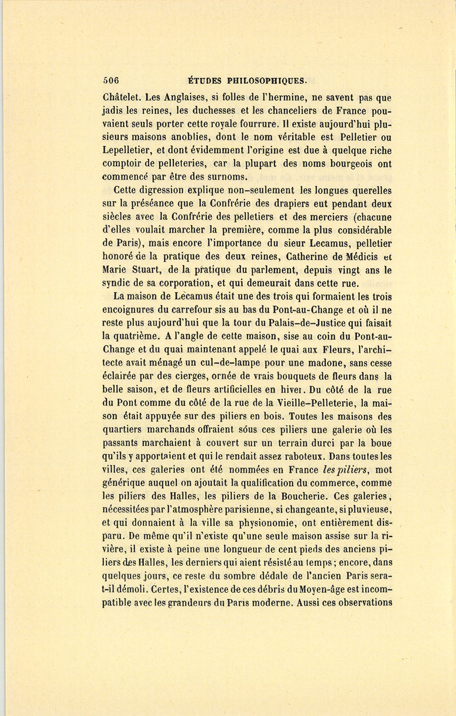 La maison de Lecamus était une des trois qui formaient les trois encoignures du carrefour sis au bas du Pont-au-Change et où il ne reste plus aujourd’hui que la tour du Palais-de-Justice qui faisait la quatrième. À l’angle de cette maison, sise au coin du Pont-au-Change et du quai maintenant appelé le quai aux Fleurs, l’architecte avait ménagé un cul-de-lampe pour une madone, sans cesse éclairée par des cierges, ornée de vrais bouquets de fleurs dans la belle saison, et de fleurs artificielles en hiver. Du côté de la rue du Pont comme du côté de la rue de la Vieille-Pelleterie, la maison était appuyée sur des piliers en bois. Toutes les maisons des quartiers marchands offraient sous ces piliers une galerie où les passants marchaient à couvert sur un terrain durci par la boue qu’ils y apportaient et qui le rendait assez raboteux. Dans toutes les villes, ces galeries ont été nommées en France les piliers, mot générique auquel on ajoutait la qualification du commerce, comme les piliers des Halles, les piliers de la Boucherie. Ces galeries, nécessitées par l’atmosphère parisienne, si changeante, si pluvieuse, et qui donnaient à la ville sa physionomie, ont entièrement disparu. De même qu’il n’existe qu’une seule maison assise sur la rivière, il existe à peine une longueur de cent pieds des anciens piliers des Halles, les derniers qui aient résisté au temps ; encore, dans quelques jours, ce reste du sombre dédale de l’ancien Paris sera-t-il démoli. Certes, l’existence de ces débris du Moyen-âge est incompatible avec les grandeurs du Paris moderne. Aussi ces observations {p. 507} tendent-elles moins à regretter ces fragments de la vieille cité qu’à consacrer leur peinture par les dernières preuves vivantes, près de tomber en poussière, et à faire absoudre des descriptions précieuses pour un avenir qui talonne le siècle actuel.
