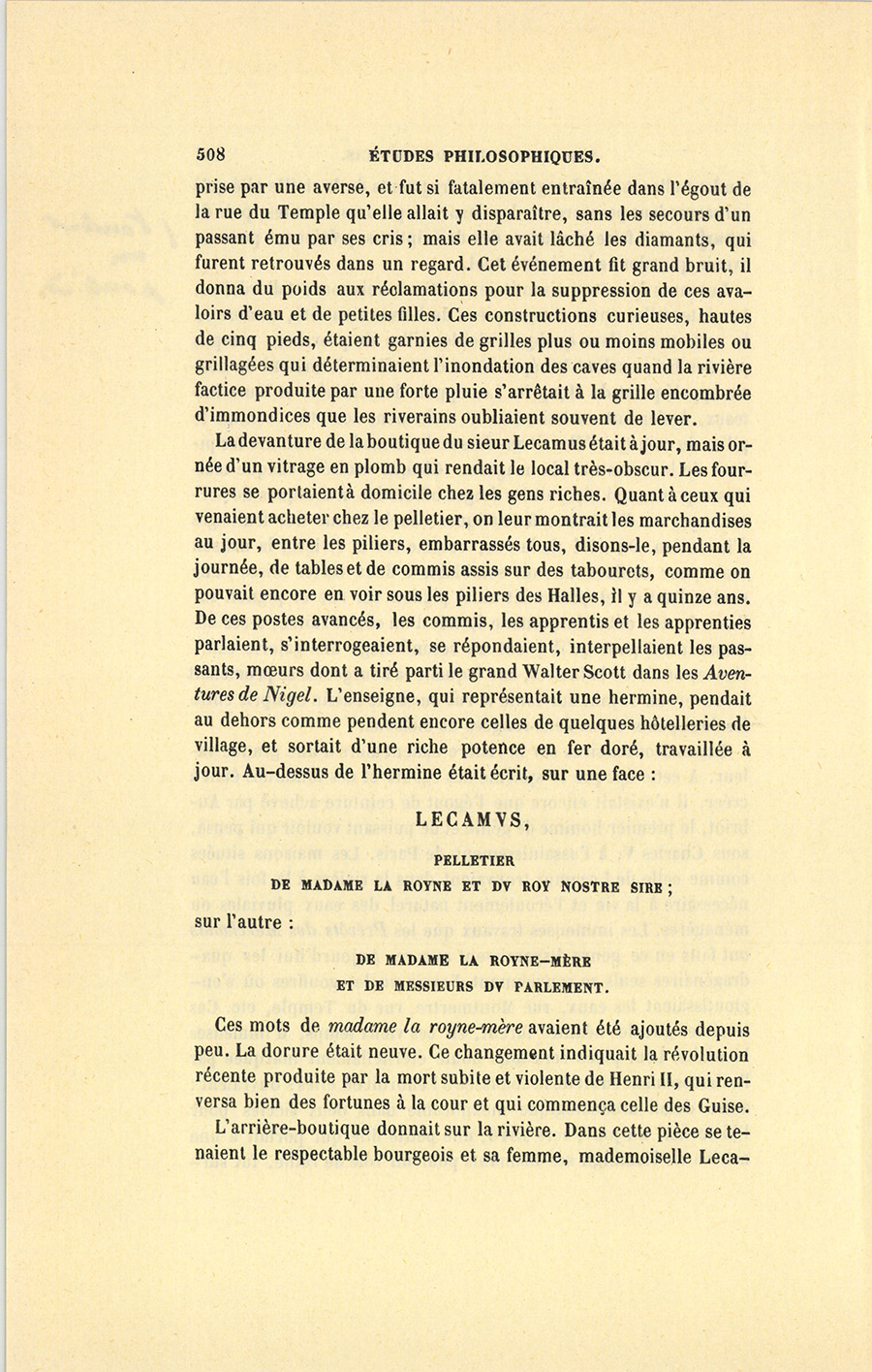 Les maisons assises sur la rivière étaient alors d’une grande valeur. À cette époque le système des égouts et des fontaines était à créer, il n’existait encore que l’égout de ceinture achevé par Aubriot, le premier homme de génie et de puissant vouloir qui pensa, sous Charles V, à l’assainissement de Paris. Les maisons situées comme celle de Lecamus trouvaient dans la rivière à la fois l’eau nécessaire à la vie et l’écoulement naturel des eaux pluviales ou ménagères. Les immenses travaux que les Prévôts des Marchands ont faits en ce genre disparaissent encore. Aujourd’hui les quadragénaires seuls se souviennent d’avoir vu les gouffres où s’engloutissaient les eaux, rue Montmartre, rue du Temple, etc. Ces terribles gueules béantes furent, en ces vieux temps, d’immenses bienfaits. Leur place sera sans doute éternellement marquée par l’exhaussement subit de la chaussée à l’endroit où elles s’ouvraient : autre détail archéologique inexplicable dans deux siècles pour l’historien. Un jour, vers 1816, une petite fille qui portait à une actrice de l’Ambigu ses diamants pour un rôle de reine, fut {p. 508} surprise par une averse, et fut si fatalement entraînée dans l’égout de la rue du Temple qu’elle allait y disparaître, sans les secours d’un passant ému par ses cris ; mais elle avait lâché les diamants, qui furent retrouvés dans un regard. Cet événement fit grand bruit, il donna du poids aux réclamations pour la suppression de ces avaloirs d’eau et de petites filles. Ces constructions curieuses, hautes de cinq pieds, étaient garnies de grilles plus ou moins mobiles ou grillagées qui déterminaient l’inondation des caves quand la rivière factice produite par une forte pluie s’arrêtait à la grille encombrée d’immondices que les riverains oubliaient souvent de lever.