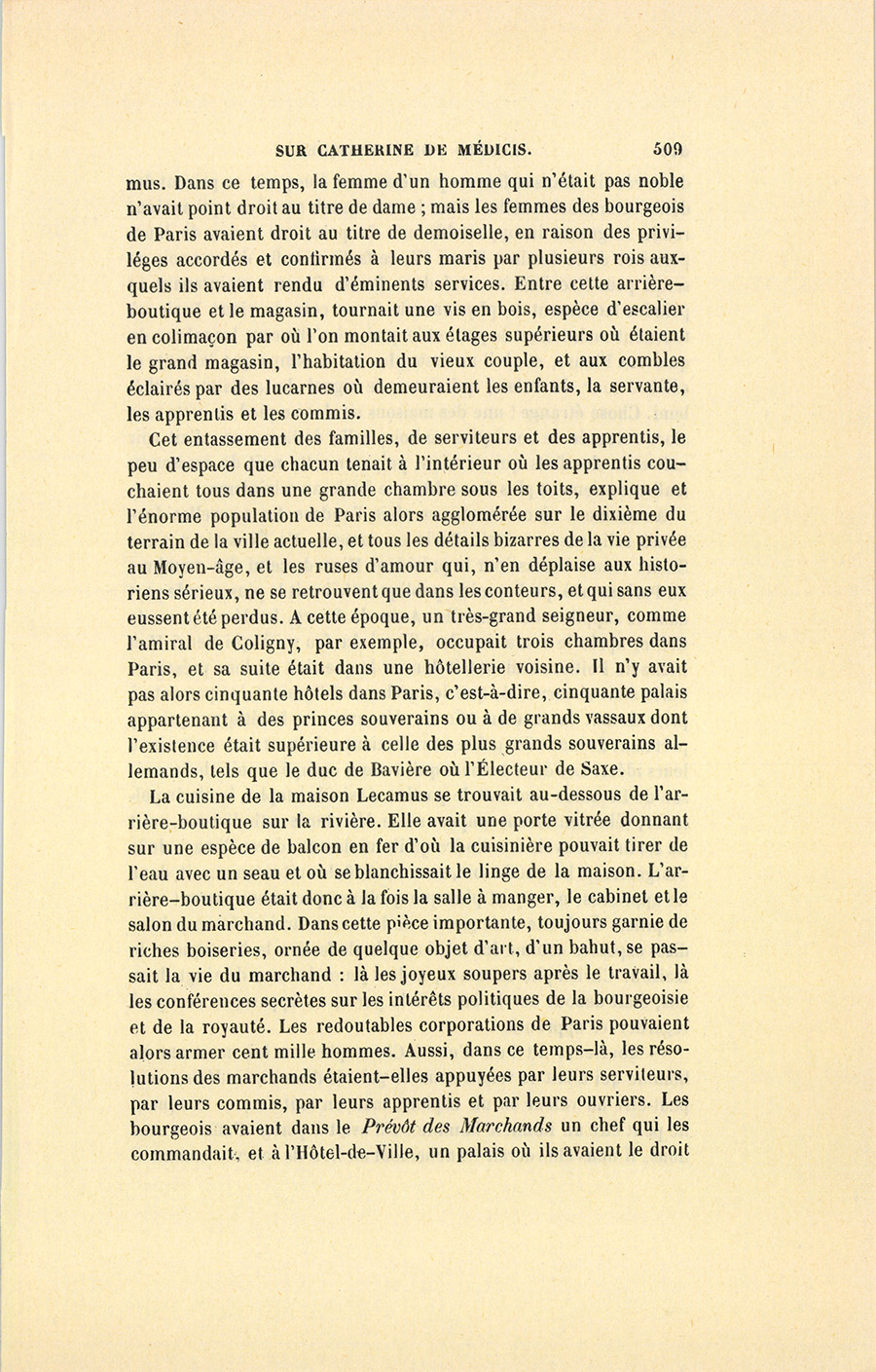 L’arrière-boutique donnait sur la rivière. Dans cette pièce se tenaient le respectable bourgeois et sa femme, mademoiselle {p. 509} Lecamus. Dans ce temps, la femme d’un homme qui n’était pas noble n’avait point droit au titre de dame ; mais les femmes des bourgeois de Paris avaient droit au titre de demoiselle, en raison des priviléges accordés et confirmés à leurs maris par plusieurs rois auxquels ils avaient rendu d’éminents services. Entre cette arrière-boutique et le magasin, tournait une vis en bois, espèce d’escalier en colimaçon par où l’on montait aux étages supérieurs où étaient le grand magasin, l’habitation du vieux couple, et aux combles éclairés par des lucarnes où demeuraient les enfants, la servante, les apprentis et les commis.
