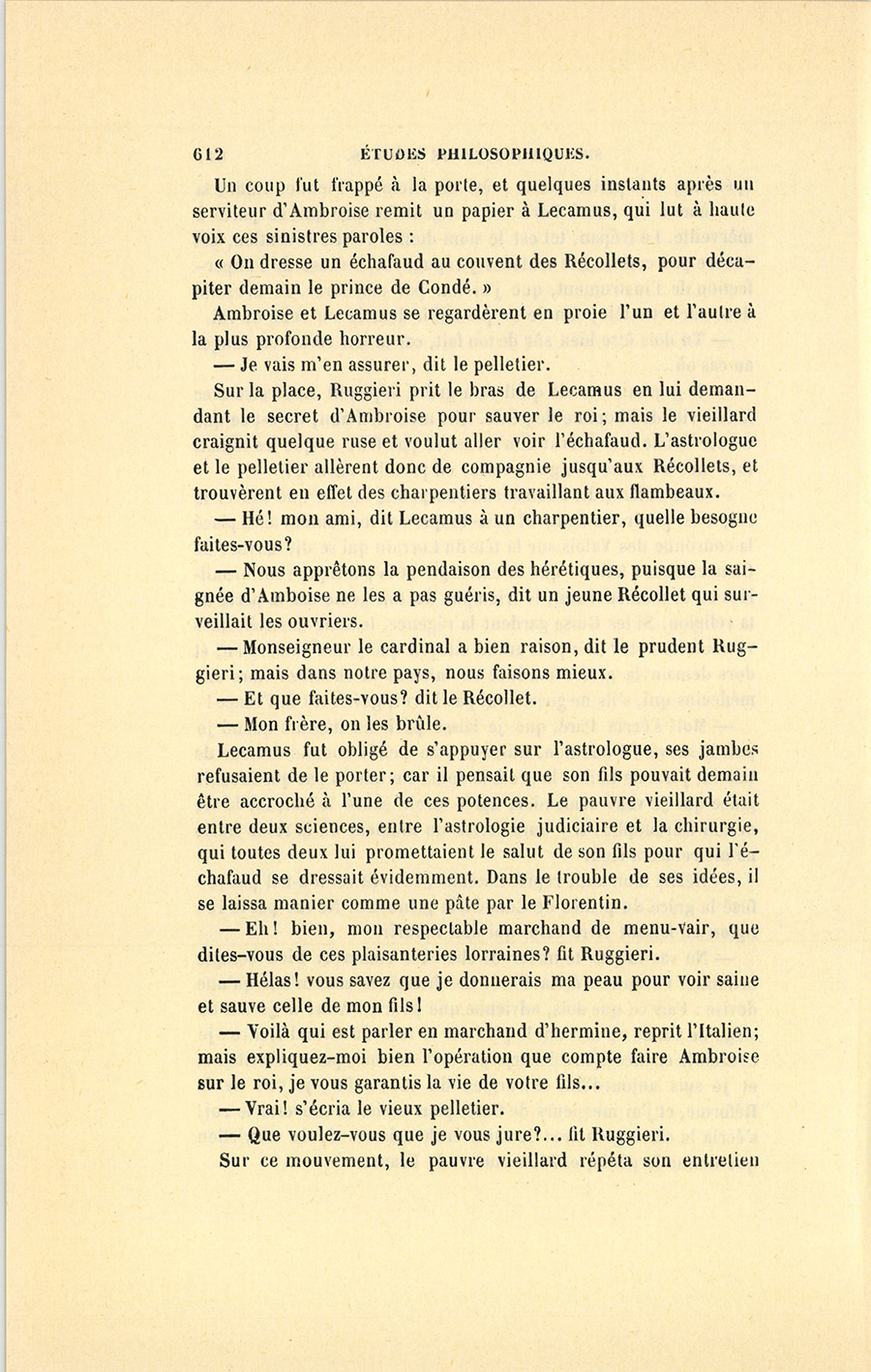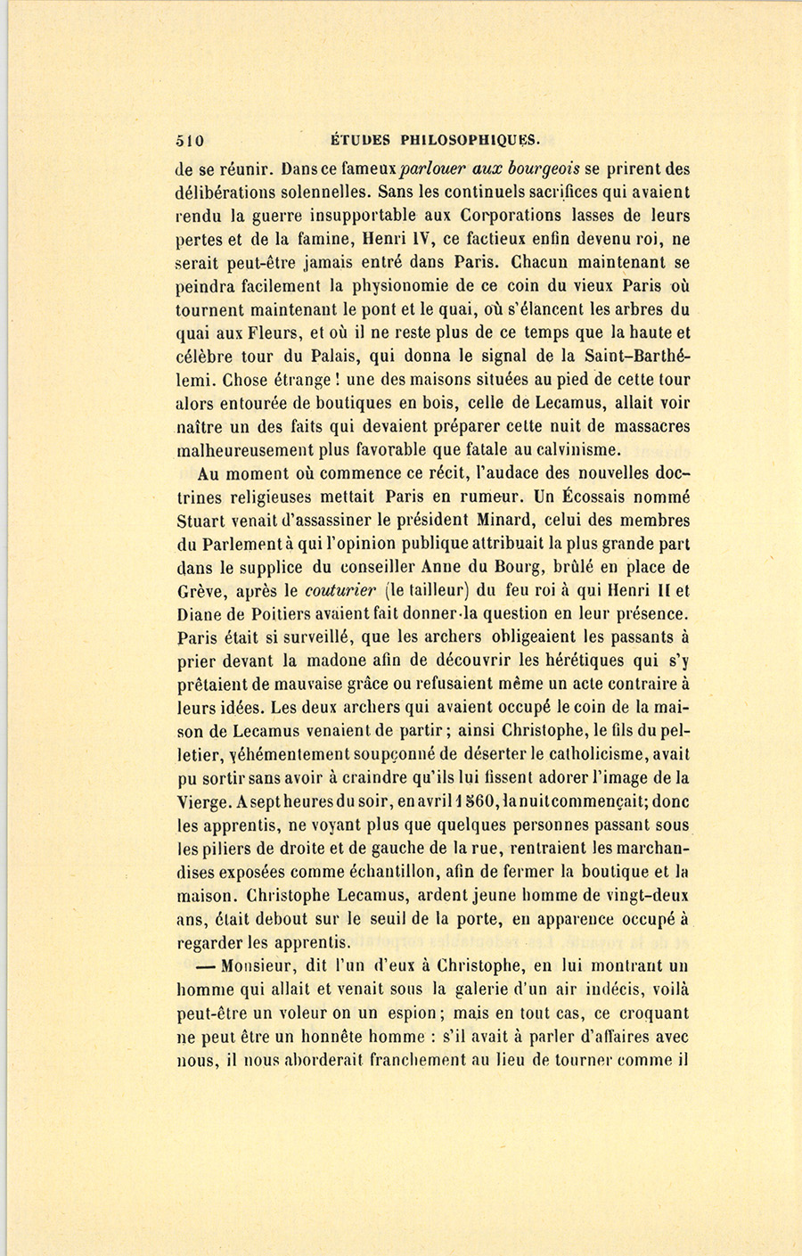 Au moment où commence ce récit, l’audace des nouvelles doctrines religieuses mettait Paris en rumeur. Un Écossais nommé Stuart venait d’assassiner le président Minard, celui des membres du Parlement à qui l’opinion publique attribuait la plus grande part dans le supplice du conseiller Anne du Bourg, brûlé en place de Grève, après le couturier (le tailleur) du feu roi à qui Henri II et Diane de Poitiers avaient fait donner la question en leur présence. Paris était si surveillé, que les archers obligeaient les passants à prier devant la madone afin de découvrir les hérétiques qui s’y prêtaient de mauvaise grâce ou refusaient même un acte contraire à leurs idées. Les deux archers qui avaient occupé le coin de la maison de Lecamus venaient de partir ; ainsi Christophe, le fils du pelletier, véhémentement soupçonné de déserter le catholicisme, avait pu sortir sans avoir à craindre qu’ils lui fissent adorer l’image de la Vierge. À sept heures du soir, en avril 1560, la nuit commençait ; donc les apprentis, ne voyant plus que quelques personnes passant sous les piliers de droite et de gauche de la rue, rentraient les marchandises exposées comme échantillon, afin de fermer la boutique et la maison. Christophe Lecamus, ardent jeune homme de vingt-deux ans, était debout sur le seuil de la porte, en apparence occupé à regarder les apprentis.