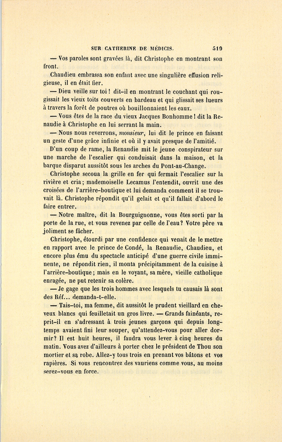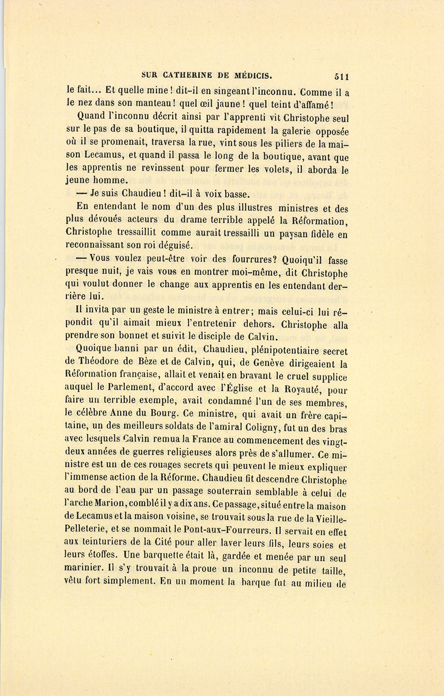 Quoique banni par un édit, Chaudieu, plénipotentiaire secret de Théodore de Bèze et de Calvin, qui, de Genève dirigeaient la Réformation française, allait et venait en bravant le cruel supplice auquel le Parlement, d’accord avec l’Église et la Royauté, pour faire un terrible exemple, avait condamné l’un de ses membres, le célèbre Anne du Bourg. Ce ministre, qui avait un frère capitaine, un des meilleurs soldats de l’amiral Coligny, fut un des bras avec lesquels Calvin remua la France au commencement des vingt-deux années de guerres religieuses alors près de s’allumer. Ce ministre est un de ces rouages secrets qui peuvent le mieux expliquer l’immense action de la Réforme. Chaudieu fit descendre Christophe au bord de l’eau par un passage souterrain semblable à celui de l’arche Marion, comblé il y a dix ans. Ce passage, situé entre la maison de Lecamus et la maison voisine, se trouvait sous la rue de la Vieille-Pelleterie, et se nommait le Pont-aux-Fourreurs. Il servait en effet aux teinturiers de la Cité pour aller laver leurs fils, leurs soies et leurs étoffes. Une barquette était là, gardée et menée par un seul marinier. Il s’y trouvait à la proue un inconnu de petite taille, vêtu fort simplement. En un moment la barque fut au milieu de {p. 512} la Seine, le marinier la dirigea sous une des arches en bois du Pont-au-Change, où il l’attacha lestement à un anneau de fer. Personne n’avait encore rien dit.