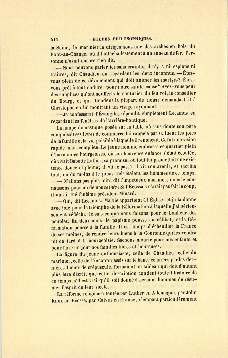 La figure du jeune enthousiaste, celle de Chaudieu, celle du marinier, celle de l’inconnu assis sur le banc, éclairées par les dernières lueurs de crépuscule, formaient un tableau qui doit d’autant plus être décrit, que cette description contient toute l’histoire de ce temps, s’il est vrai qu’il soit donné à certains hommes de résumer l’esprit de leur siècle.