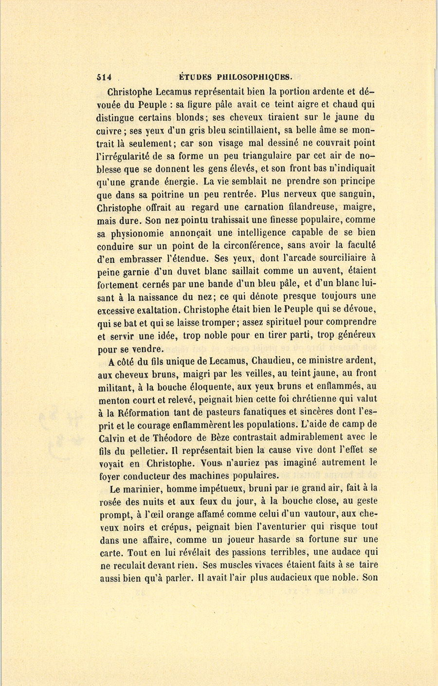 {p. 514} Christophe Lecamus représentait bien la portion ardente et dévouée du Peuple : sa figure pâle avait ce teint aigre et chaud qui distingue certains blonds ; ses cheveux tiraient sur le jaune du cuivre ; ses yeux d’un gris bleu scintillaient, sa belle âme se montrait là seulement ; car son visage mal dessiné ne couvrait point l’irrégularité de sa forme un peu triangulaire par cet air de noblesse que se donnent les gens élevés, et son front bas n’indiquait qu’une grande énergie. La vie semblait ne prendre son principe que dans sa poitrine un peu rentrée. Plus nerveux que sanguin, Christophe offrait au regard une carnation filandreuse, maigre, mais dure. Son nez pointu trahissait une finesse populaire, comme sa physionomie annonçait une intelligence capable de se bien conduire sur un point de la circonférence, sans avoir la faculté d’en embrasser l’étendue. Ses yeux, dont l’arcade sourcilière18 à peine garnie d’un duvet blanc saillait comme un auvent, étaient fortement cernés par une bande d’un bleu pâle, et d’un blanc luisant à la naissance du nez ; ce qui dénote presque toujours une excessive exaltation. Christophe était bien le Peuple qui se dévoue, qui se bat et qui se laisse tromper ; assez spirituel pour comprendre et servir une idée, trop noble pour en tirer parti, trop généreux pour se vendre. [ill.]