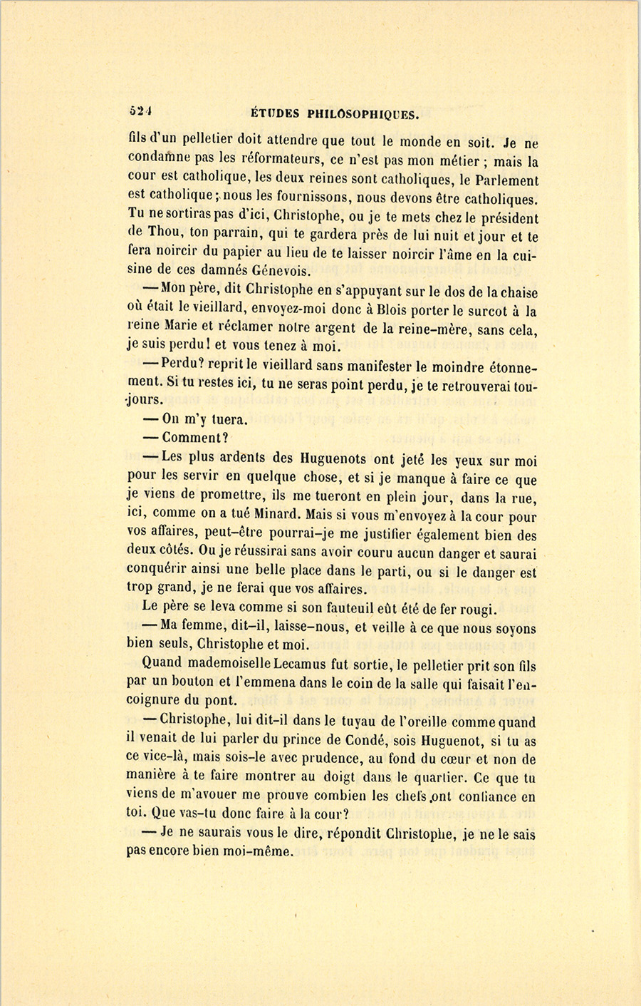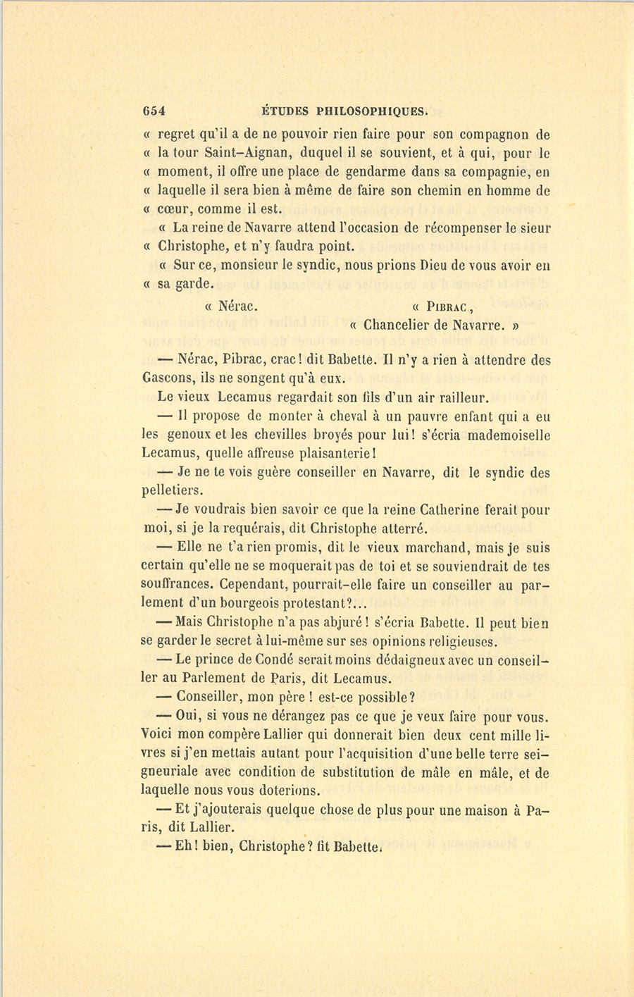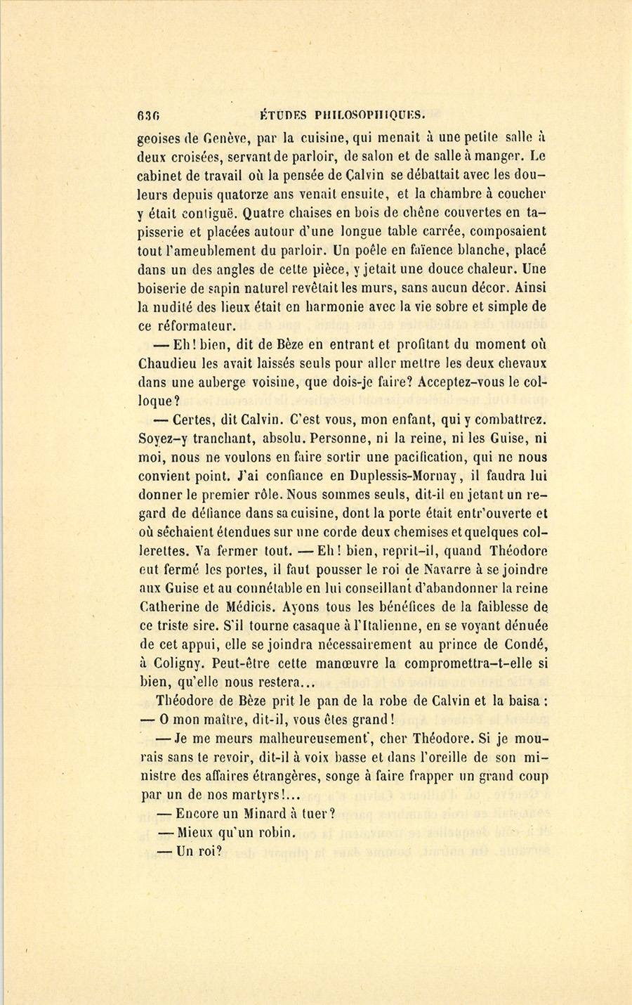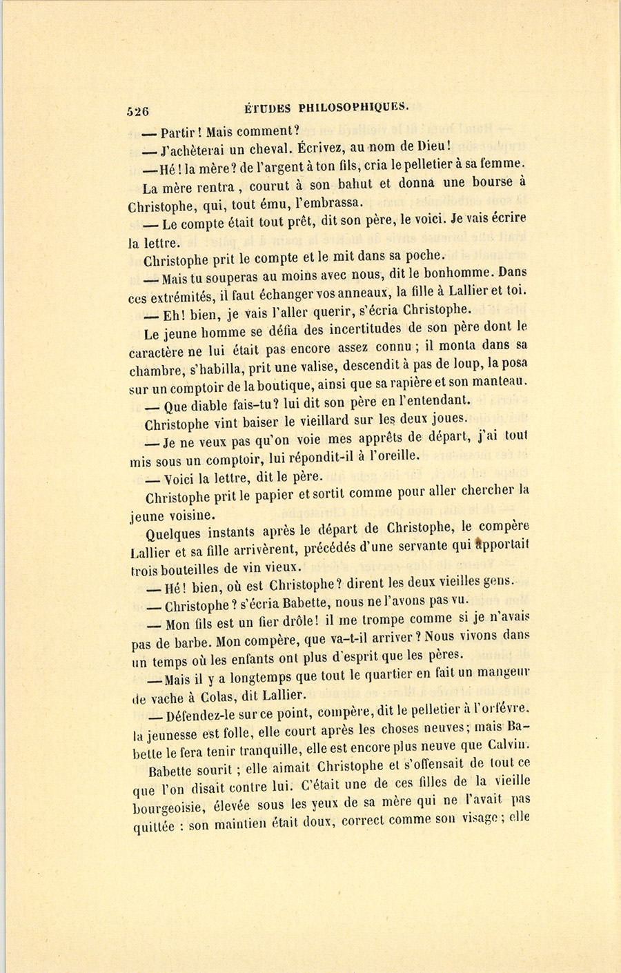 Il invita par un geste le ministre à entrer ; mais celui-ci lui répondit qu’il aimait mieux l’entretenir dehors. Christophe alla prendre son bonnet et suivit le disciple de Calvin.