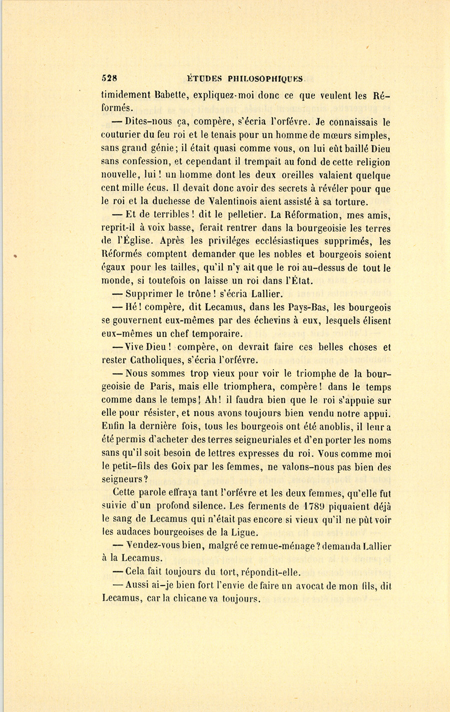 La cuisine de la maison Lecamus se trouvait au-dessous de l’arrière-boutique sur la rivière. Elle avait une porte vitrée donnant sur une espèce de balcon en fer d’où la cuisinière pouvait tirer de l’eau avec un seau et où se blanchissait le linge de la maison. L’arrière-boutique était donc à la fois la salle à manger, le cabinet et le salon du marchand. Dans cette pièce importante, toujours garnie de riches boiseries, ornée de quelque objet d’art, d’un bahut, se passait la vie du marchand : là les joyeux soupers après le travail, là les conférences secrètes sur les intérêts politiques de la bourgeoisie et de la royauté. Les redoutables corporations de Paris pouvaient alors armer cent mille hommes. Aussi, dans ce temps-là, les résolutions des marchands étaient-elles appuyées par leurs serviteurs, par leurs commis, par leurs apprentis et par leurs ouvriers. Les bourgeois avaient dans le Prévôt des Marchands un chef qui les commandait, et à l’Hôtel-de-Ville, un palais où ils avaient le droit {p. 510} de se réunir. Dans ce fameux parlouer aux bourgeois se prirent des délibérations solennelles. Sans les continuels sacrifices qui avaient rendu la guerre insupportable aux Corporations lasses de leurs pertes et de la famine, Henri IV, ce factieux enfin devenu roi, ne serait peut-être jamais entré dans Paris. Chacun maintenant se peindra facilement la physionomie de ce coin du vieux Paris où tournent maintenant le pont et le quai, où s’élancent les arbres du quai aux Fleurs, et où il ne reste plus de ce temps que la haute et célèbre tour du Palais, qui donna le signal de la Saint-Barthélemi. Chose étrange ! une des maisons situées au pied de cette tour alors entourée de boutiques en bois, celle de Lecamus, allait voir naître un des faits qui devaient préparer cette nuit de massacres malheureusement plus favorable que fatale au calvinisme.