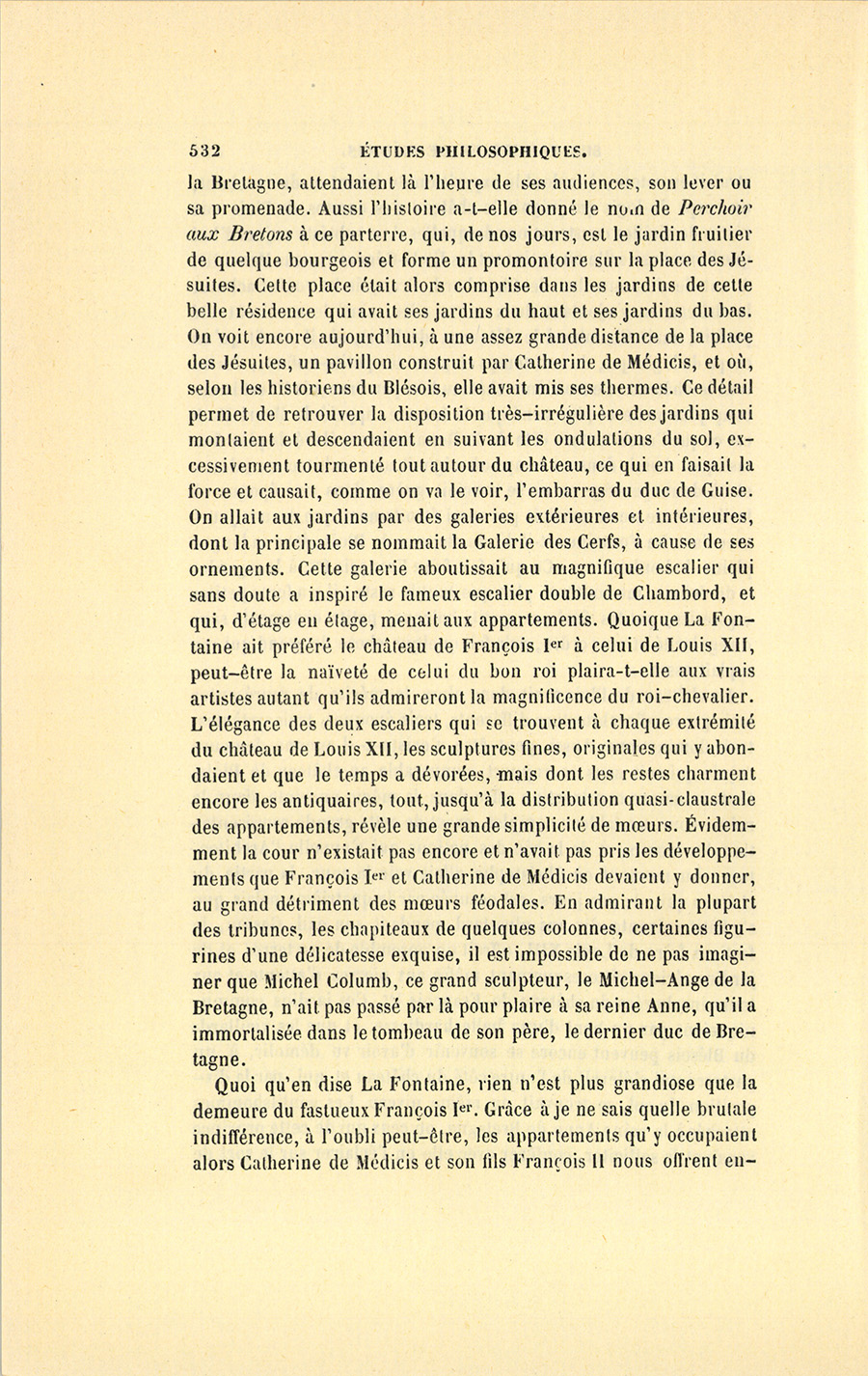 Ce recueil, imprimé chez Simon de Colines, était dédié À UN ÉVÊQUE !… à François Bohier, le frère de celui qui, pour sauver son crédit à la cour et racheter son crime, offrit à l’avénement de Henri II, le château de Chenonceaux, bâti par son père Thomas Bohier, conseiller d’État sous quatre rois : Louis XI, Charles VIII, Louis XII et François Ier. Qu’étaient les pamphlets publiés contre madame de Pompadour et contre Marie-Antoinette, comparés à des vers qu’on dirait écrits par Martial ? Ce Voûté dut mal finir. Ainsi la terre et le château de Chenonceaux ne coûtaient à Diane que le pardon d’une injure ordonné par l’Évangile ! Pour ne pas être décrétées par un jury, les amendes infligées à la Presse étaient un peu plus dures que celles d’aujourd’hui.