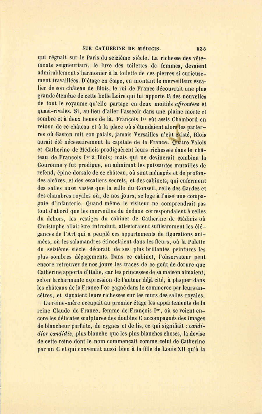 Ces mots de madame la royne-mère avaient été ajoutés depuis peu. La dorure était neuve. Ce changement indiquait la révolution récente produite par la mort subite et violente de Henri II, qui renversa bien des fortunes à la cour et qui commença celle des Guise.