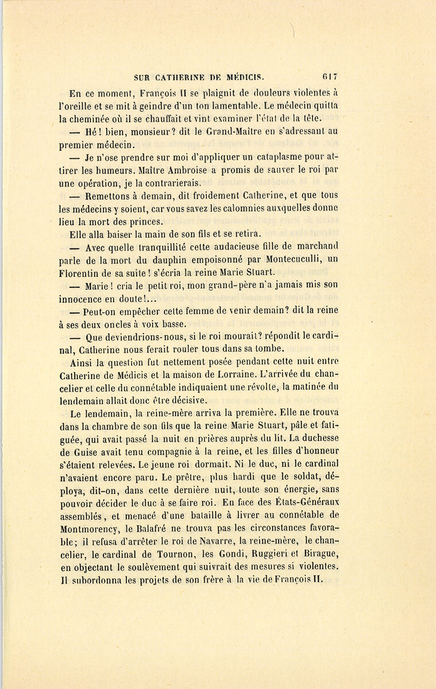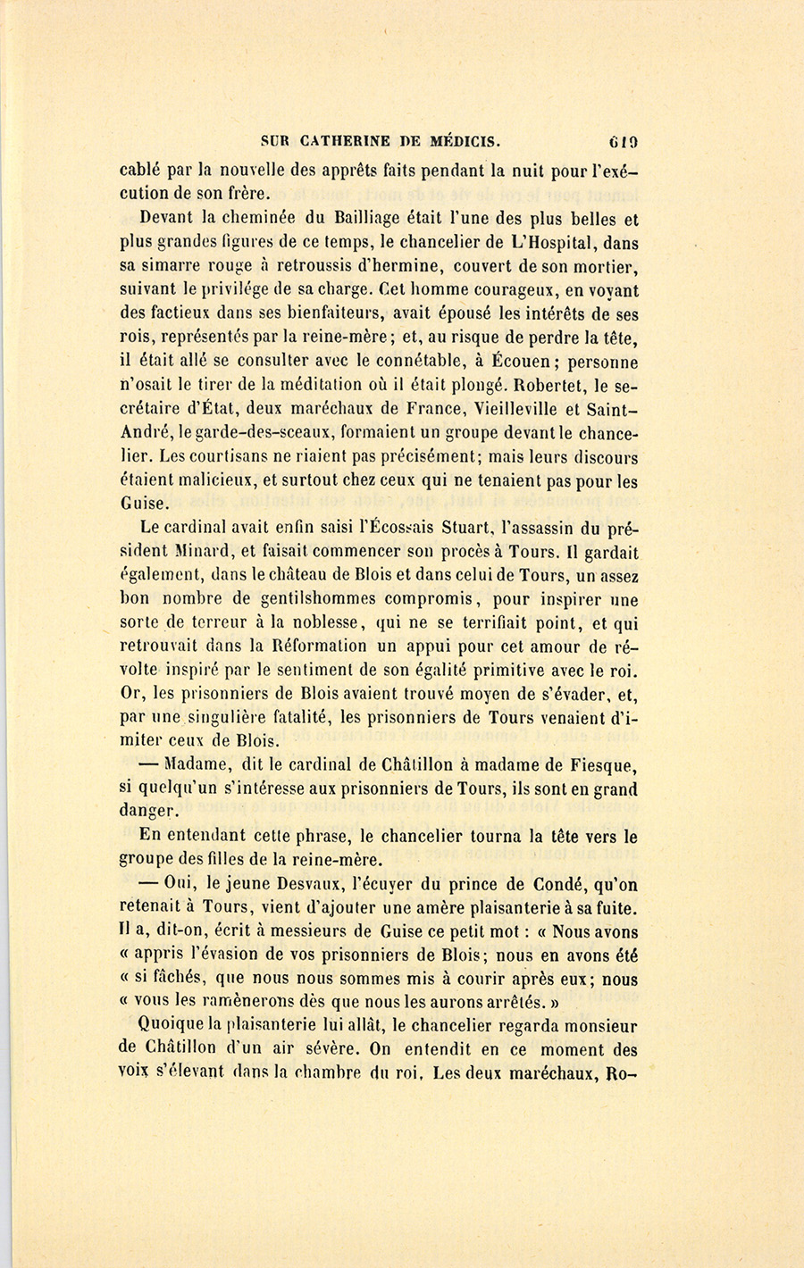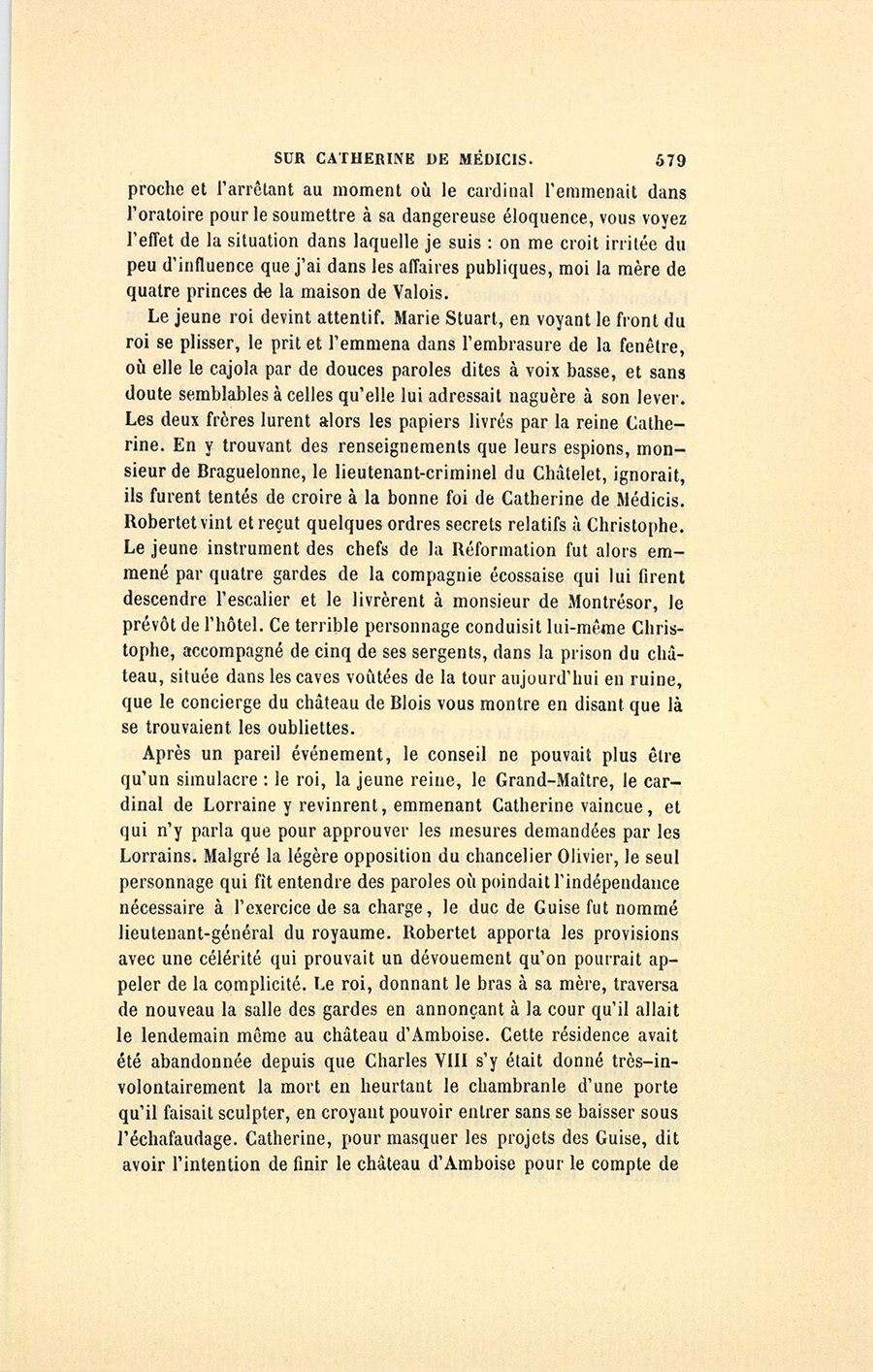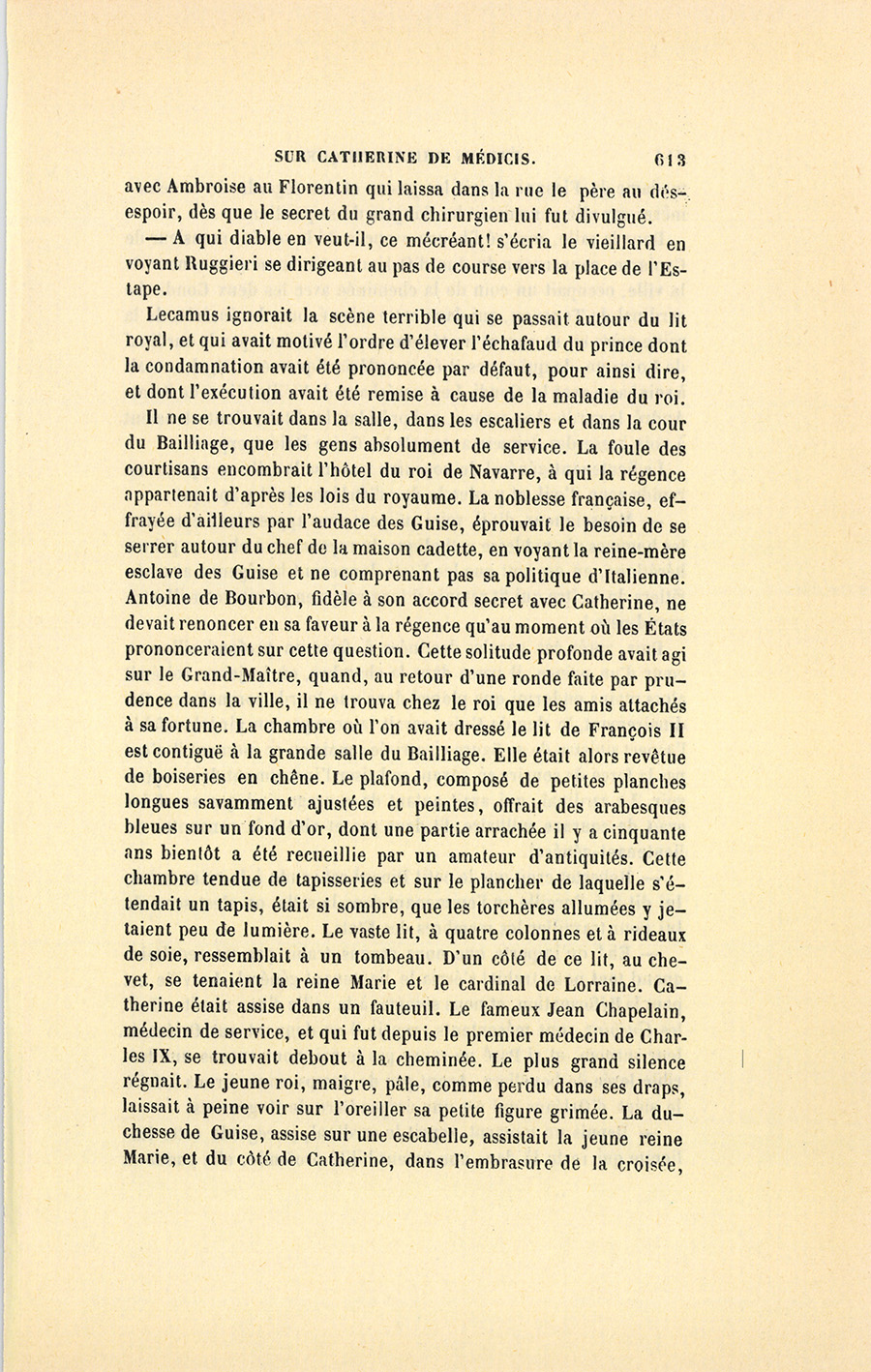 À la mort de Henri II, pendant les vingt premiers jours de deuil, la situation du Vidame changea donc tout à coup. Objet des attentions de la reine mère et lui faisant la cour comme on pouvait la faire à la reine, très-secrètement, il parut destiné à jouer un rôle, et Catherine résolut en effet de se servir de lui. Ce prince reçut d’elle des lettres pour le prince de Condé, dans lesquelles elle démontrait la nécessité de s’allier contre les Guise. Instruits de cette {p. 503} intrigue, les Guise entrèrent dans la chambre de la reine, pour lui arracher l’ordre de mettre le Vidame à la Bastille, et Catherine se trouva dans la dure nécessité d’obéir. Le Vidame mourut après quelques mois de captivité, le jour où il sortit de prison, quelque temps avant la conspiration d’Amboise. Tel fut le dénoûment du premier et du seul amour qu’ait eu Catherine de Médicis. Les écrivains protestants ont dit que la reine fit empoisonner le Vidame pour confier à la tombe le secret de ses galanteries !… Voilà quel fut pour cette femme l’apprentissage du pouvoir royal ?