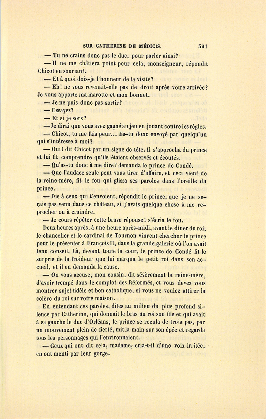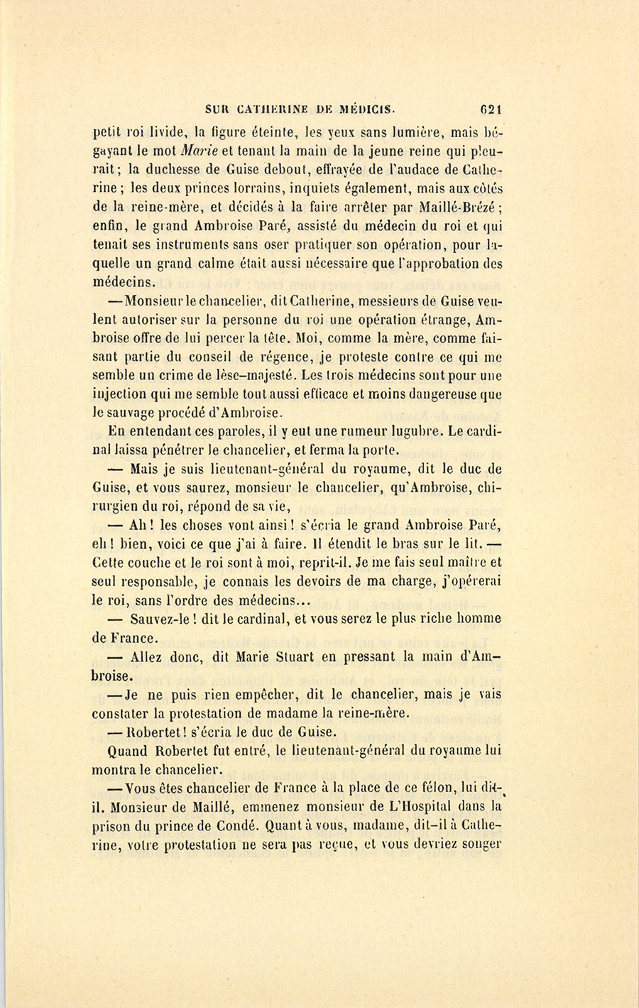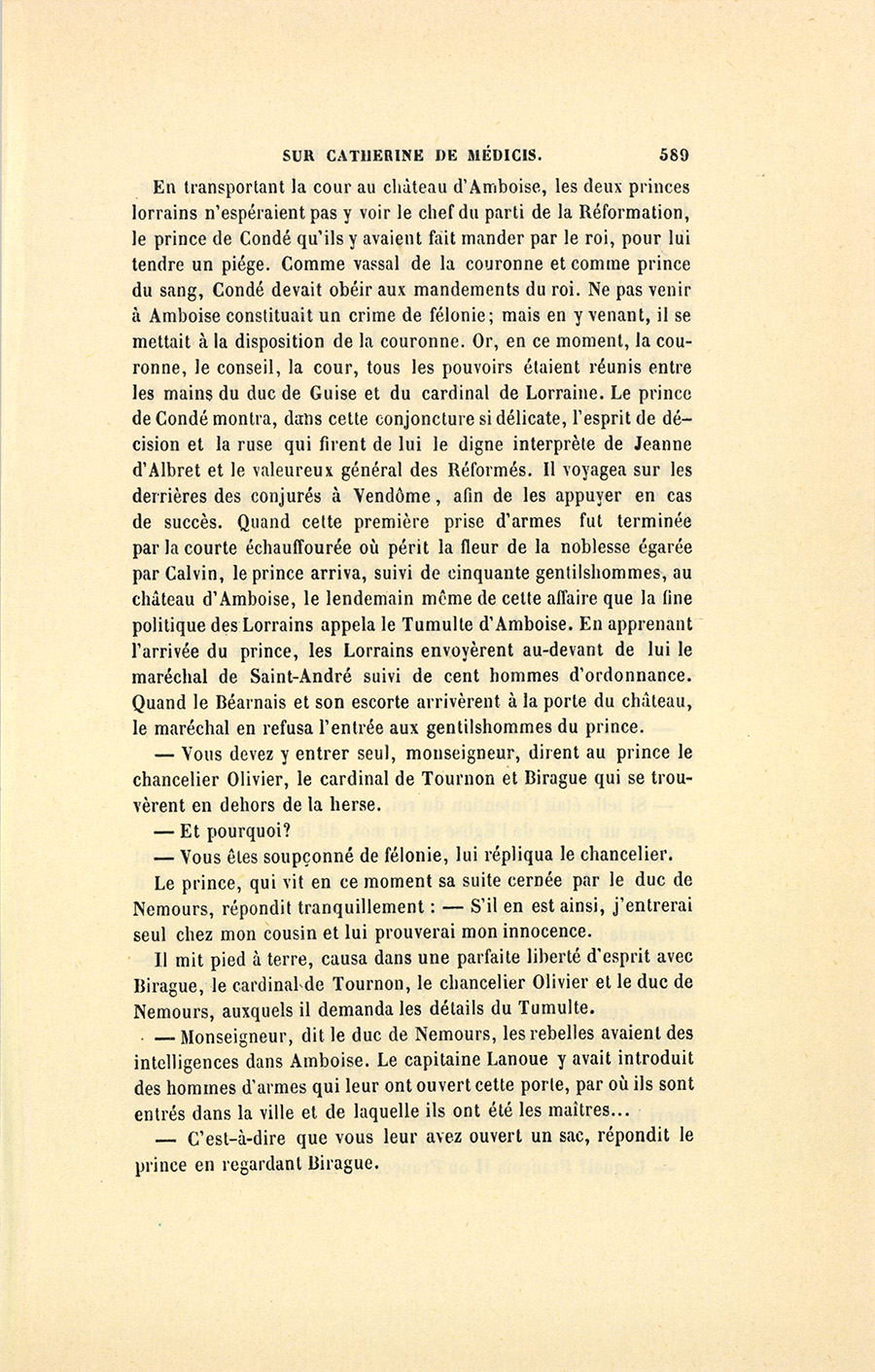 À la mort de Henri II, pendant les vingt premiers jours de deuil, la situation du Vidame changea donc tout à coup. Objet des attentions de la reine mère et lui faisant la cour comme on pouvait la faire à la reine, très-secrètement, il parut destiné à jouer un rôle, et Catherine résolut en effet de se servir de lui. Ce prince reçut d’elle des lettres pour le prince de Condé, dans lesquelles elle démontrait la nécessité de s’allier contre les Guise. Instruits de cette {p. 503} intrigue, les Guise entrèrent dans la chambre de la reine, pour lui arracher l’ordre de mettre le Vidame à la Bastille, et Catherine se trouva dans la dure nécessité d’obéir. Le Vidame mourut après quelques mois de captivité, le jour où il sortit de prison, quelque temps avant la conspiration d’Amboise. Tel fut le dénoûment du premier et du seul amour qu’ait eu Catherine de Médicis. Les écrivains protestants ont dit que la reine fit empoisonner le Vidame pour confier à la tombe le secret de ses galanteries !… Voilà quel fut pour cette femme l’apprentissage du pouvoir royal ?