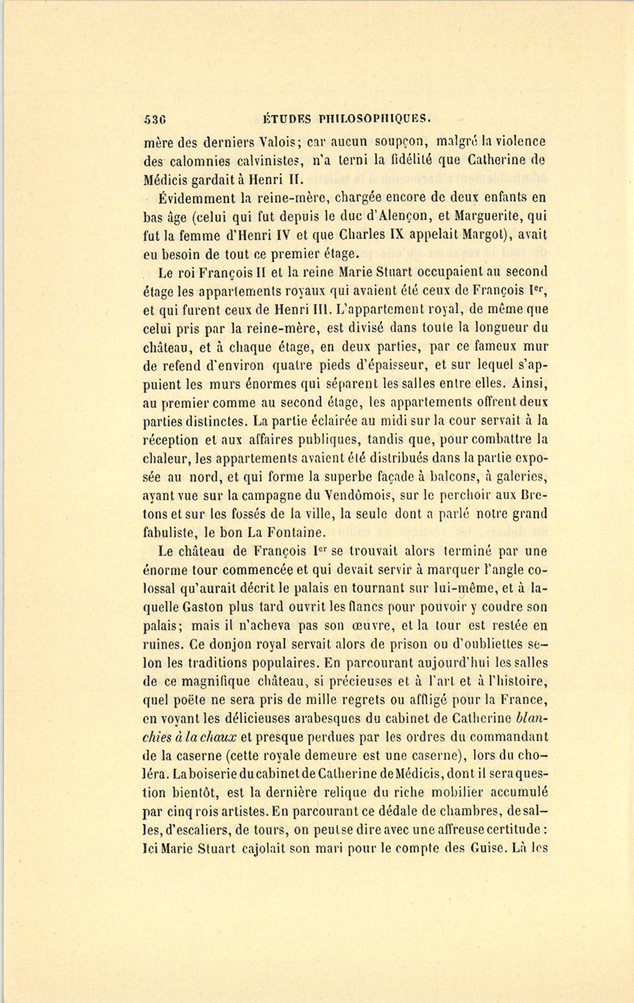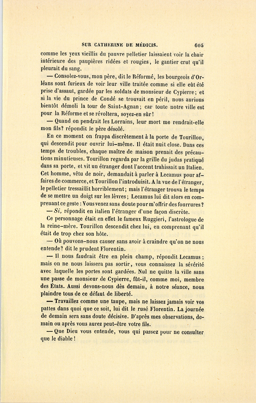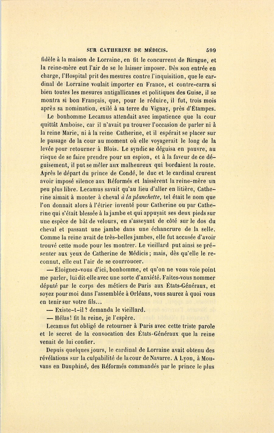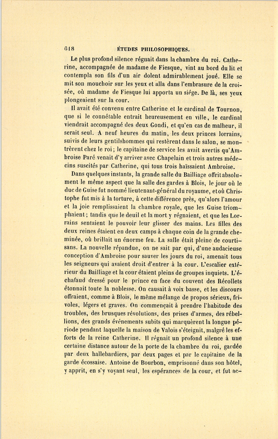 À la mort de Henri II, pendant les vingt premiers jours de deuil, la situation du Vidame changea donc tout à coup. Objet des attentions de la reine mère et lui faisant la cour comme on pouvait la faire à la reine, très-secrètement, il parut destiné à jouer un rôle, et Catherine résolut en effet de se servir de lui. Ce prince reçut d’elle des lettres pour le prince de Condé, dans lesquelles elle démontrait la nécessité de s’allier contre les Guise. Instruits de cette {p. 503} intrigue, les Guise entrèrent dans la chambre de la reine, pour lui arracher l’ordre de mettre le Vidame à la Bastille, et Catherine se trouva dans la dure nécessité d’obéir. Le Vidame mourut après quelques mois de captivité, le jour où il sortit de prison, quelque temps avant la conspiration d’Amboise. Tel fut le dénoûment du premier et du seul amour qu’ait eu Catherine de Médicis. Les écrivains protestants ont dit que la reine fit empoisonner le Vidame pour confier à la tombe le secret de ses galanteries !… Voilà quel fut pour cette femme l’apprentissage du pouvoir royal ?