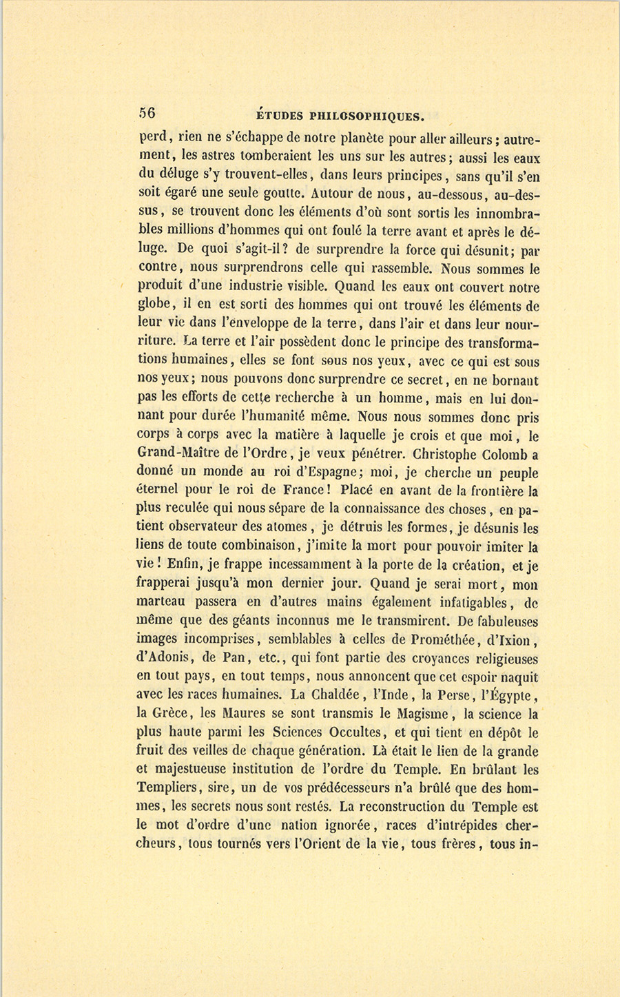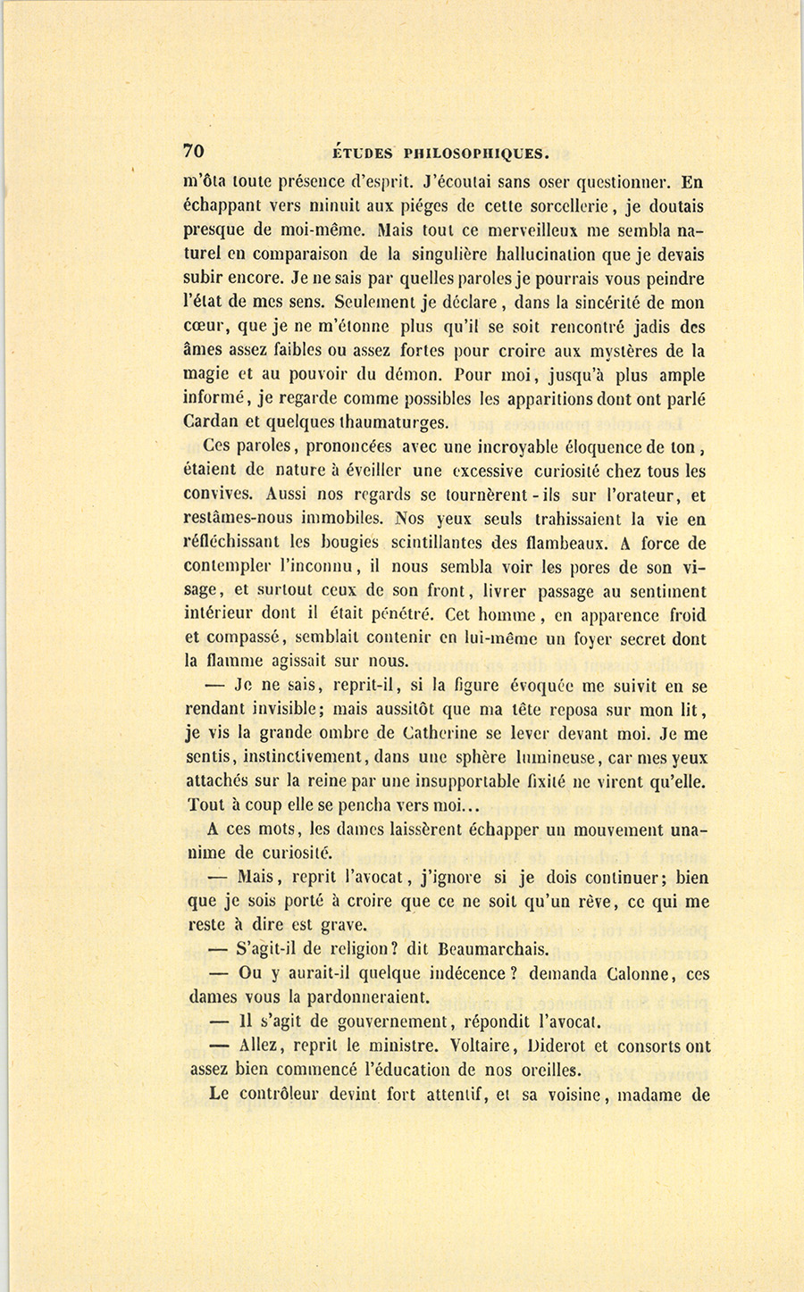 Lorsque l’inconnu cessa de parler, les dames se turent. Monsieur Bodard dormait. Le chirurgien à moitié gris, Lavoisier, Beaumarchais et moi nous avions été seuls attentifs, monsieur de Calonne jouait avec sa voisine. En ce moment le silence eut quelque chose de solennel. La lueur des bougies me paraissait avoir une couleur magique. Un même sentiment nous avait attachés par des liens mystérieux à cet homme, qui, pour ma part, me fit concevoir les inexplicables effets du fanatisme. Il ne fallut rien moins que la voix sourde et caverneuse du compagnon de Beaumarchais pour nous réveiller.