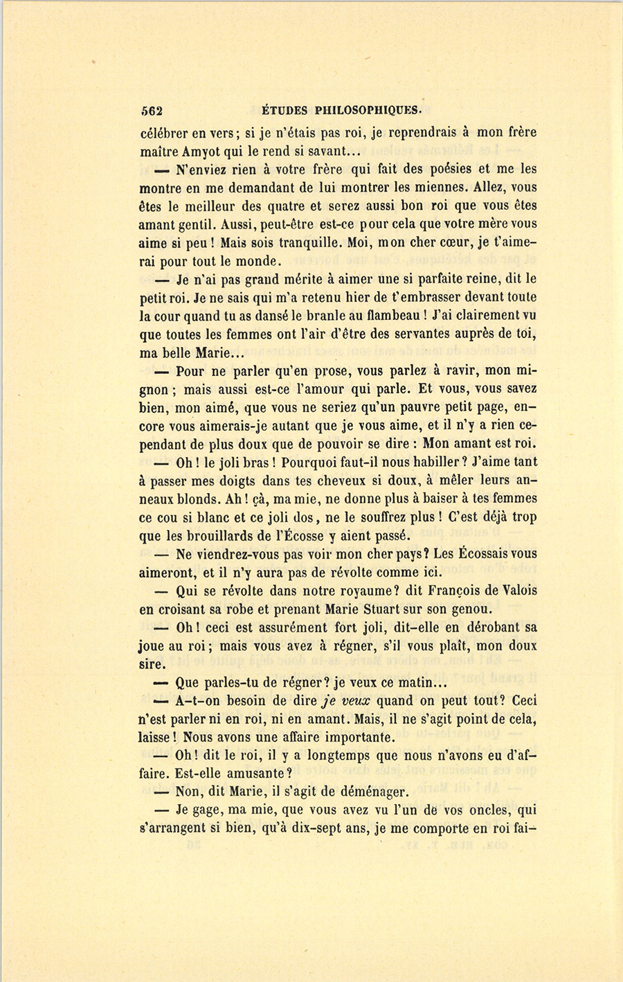 À la mort du roi, la reine Catherine se trouva donc en commerce de galanterie avec le Vidame, situation qui n’avait rien que de conforme aux mœurs du temps, où l’amour fut à la fois si chevaleresque et si licencieux, que les plus belles actions y étaient aussi naturelles que les plus blâmables ; seulement, comme toujours, les historiens ont commis la faute de prendre l’exception pour la règle. Les quatre fils de Henri II rendaient nulle la position des Bourbons, tous excessivement pauvres, et accablés par le mépris que la trahison du Connétable jetait sur eux, malgré les raisons qui contraignirent le Connétable à sortir du royaume. Le Vidame de Chartres, qui fut au premier prince de Condé ce que Richelieu fut à Mazarin, son père en politique, son modèle, et de plus, son maître en galanterie, cacha l’excessive ambition de sa maison sous les dehors de la légèreté. Hors d’état de lutter avec les Guise, avec les Montmorency, les princes d’Écosse, les cardinaux, les Bouillon, il se fit distinguer par sa bonne grâce, par ses manières, par son esprit qui lui valurent les faveurs des plus charmantes femmes, et le cœur de celles auxquelles il ne songeait point. Ce fut un de ces hommes privilégiés, dont les séductions étaient irrésistibles et qui dut à l’amour les moyens de tenir son rang. Les Bourbons ne se seraient pas fâchés comme Jarnac de la médisance de la Châtaigneraie : ils acceptaient très-bien des terres et des châteaux de leurs maîtresses, témoin le prince de Condé qui accepta la terre de Saint-Valery de madame la maréchale de Saint-André.