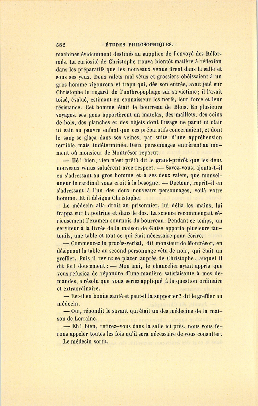 – Nous pouvons parler ici sans crainte, il n’y a ni espions ni traîtres, dit Chaudieu en regardant les deux inconnus. – Êtes-vous plein de ce dévouement qui doit animer les martyrs ? Êtes-vous prêt à tout endurer pour notre sainte cause ? Avez-vous peur des supplices qu’ont soufferts le couturier du feu roi, le conseiller du Bourg, et qui attendent la plupart de nous ? demanda-t-il à Christophe en lui montrant un visage rayonnant.