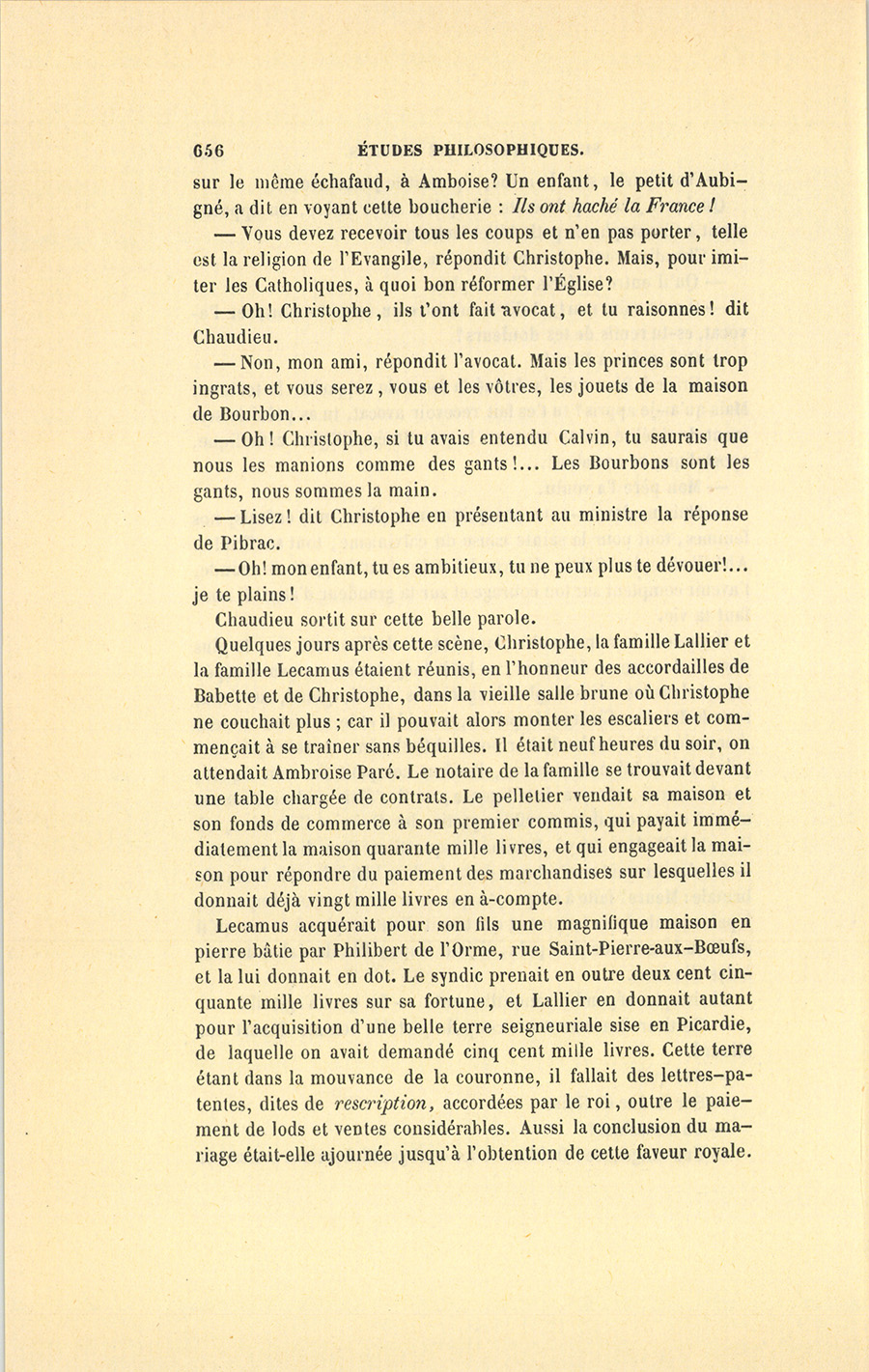 – Oui, dit Lecamus. Ma vie appartient à l’Église, et je la donne avec joie pour le triomphe de la Réformation à laquelle j’ai sérieusement réfléchi. Je sais ce que nous faisons pour le bonheur des peuples. En deux mots, le papisme pousse au célibat, et la Réformation pousse à la famille. Il est temps d’écheniller la France de ses moines, de rendre leurs biens à la Couronne qui les vendra tôt ou tard à la bourgeoisie. Sachons mourir pour nos enfants et pour faire un jour nos familles libres et heureuses.