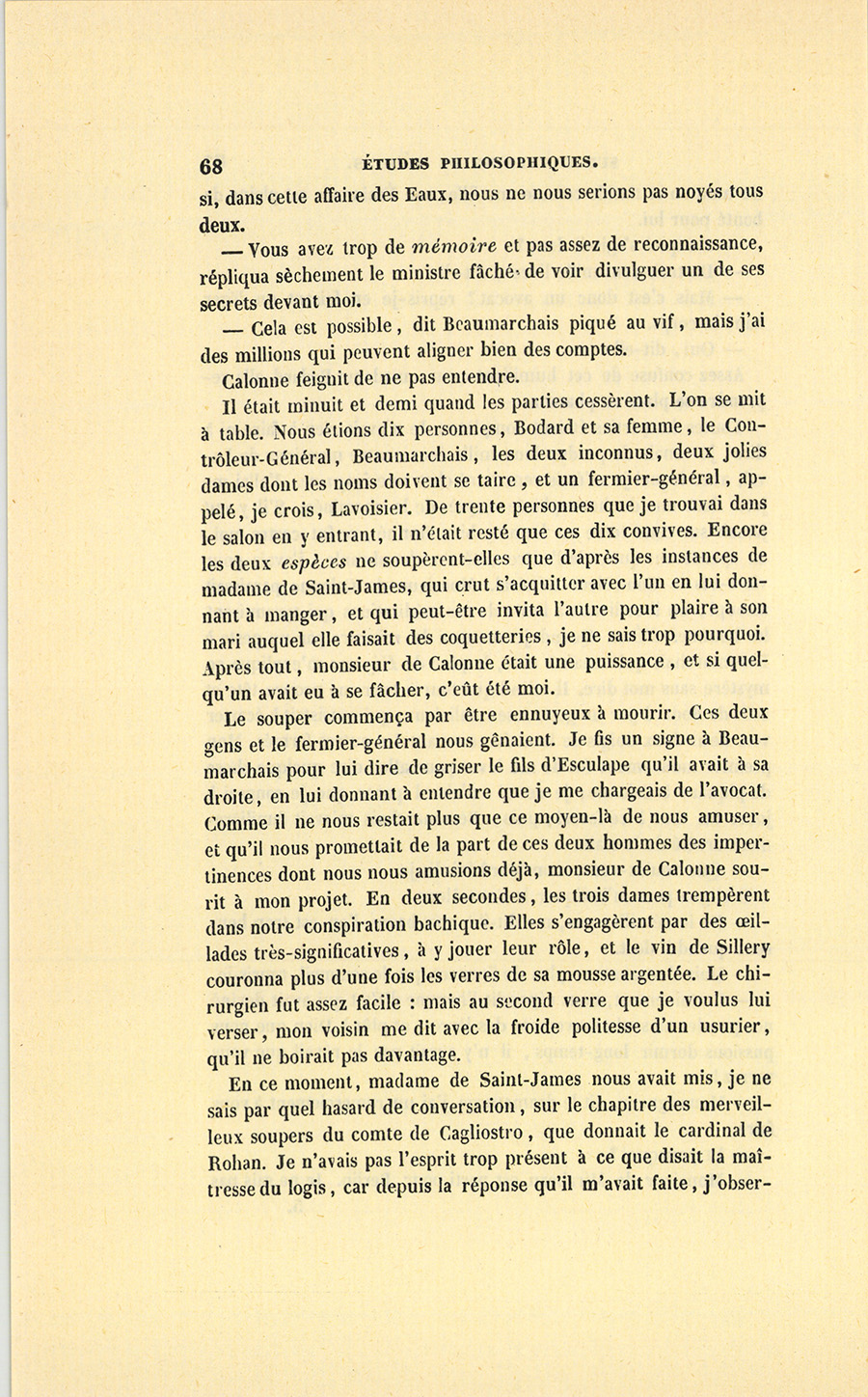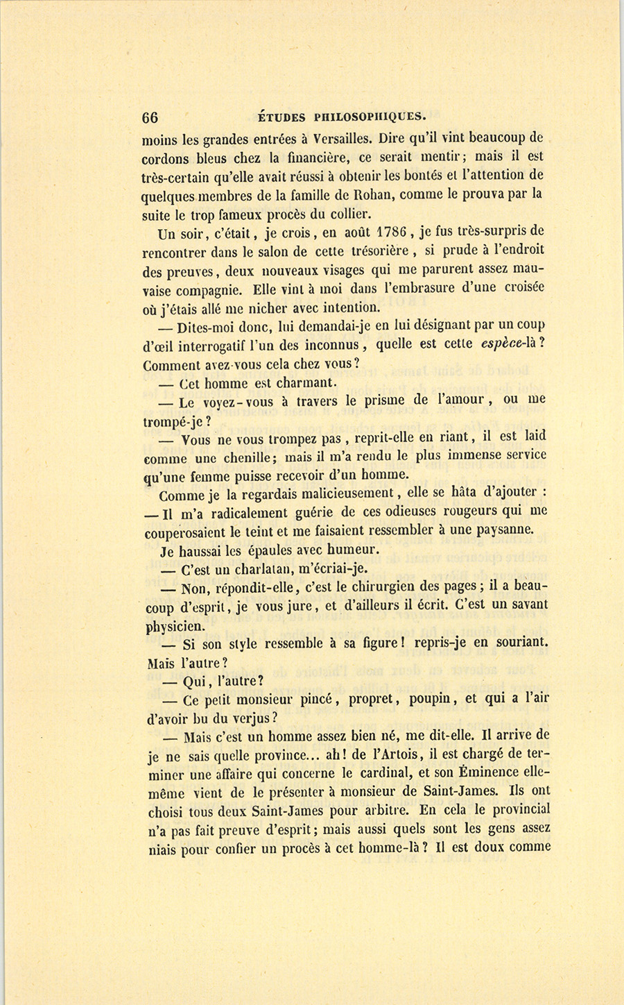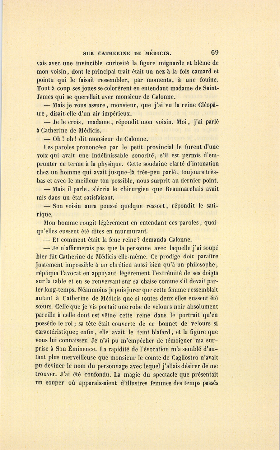 En ce moment, madame de Saint-James nous avait mis, je ne sais par quel hasard de conversation, sur le chapitre des merveilleux soupers du comte de Cagliostro, que donnait le cardinal de Rohan. Je n’avais pas l’esprit trop présent à ce que disait la maîtresse du logis, car depuis la réponse qu’il m’avait faite, {p. 69} j’observais avec une invincible curiosité la figure mignarde et blême de mon voisin, dont le principal trait était un nez à la fois camard et pointu qui le faisait ressembler, par moments, à une fouine. Tout à coup ses joues se colorèrent en entendant madame de Saint-James qui se querellait avec monsieur de Calonne.