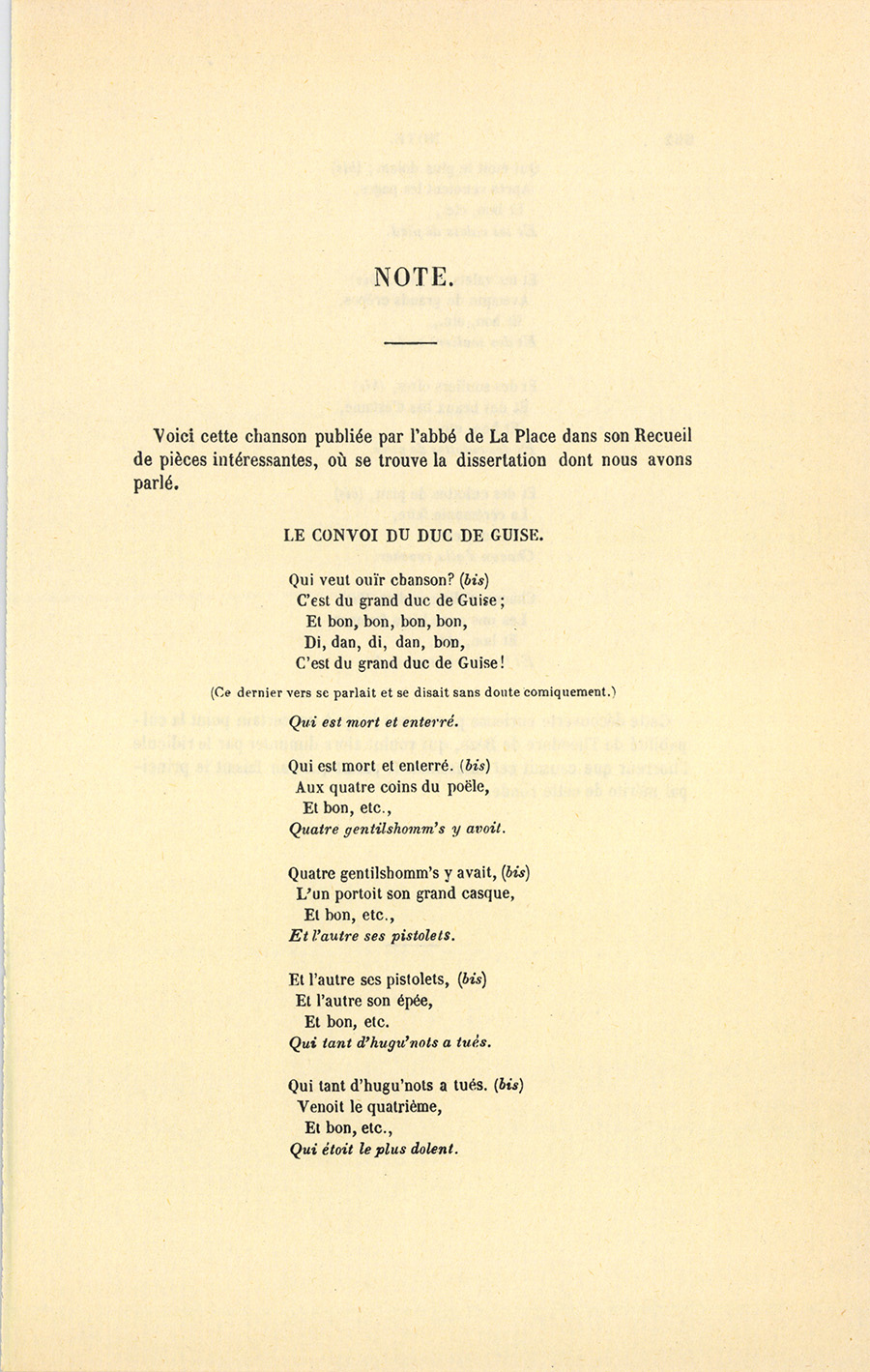Qui veut ouïr chanson ? (bis)C’est du grand duc de Guise ;Et bon, bon, bon, bon,Di, dan, di, dan, bon,C’est du grand duc de Guise65 !Qui est mort et enterré.Qui est mort et enterré. (bis)Aux quatre coins du poële,Et bon, etc.,Quatre gentilshomm’s y avoit.Quatre gentilshomm’s y avait, (bis)L’un portoit son grand casque,Et bon, etc.,Et l’autre ses pistolets.Et l’autre ses pistolets, (bis)Et l’autre son épée,Et bon, etc.,Qui tant d’hugu’nots a tués.Qui tant d’hugu’nots a tués. (bis)Venoit le quatrième,Et bon, etc.,Qui étoit le plus dolent.{p. 662}Qui étoit le plus dolent ; (bis)Après venoient les pages,Et bon, etc.,Et les valets de pied.Et les valets de pied, (bis)Avecque de grands crêpes,Et bon, etc.,Et des souliers cirés.Et des souliers cirés, (bis)Et des beaux bas d’estame,Et bon, etc.,Et des culottes de piau.Et des culottes de piau, (bis)La cérémonie faite,Et bon, etc.,Chacun s’alla coucher.