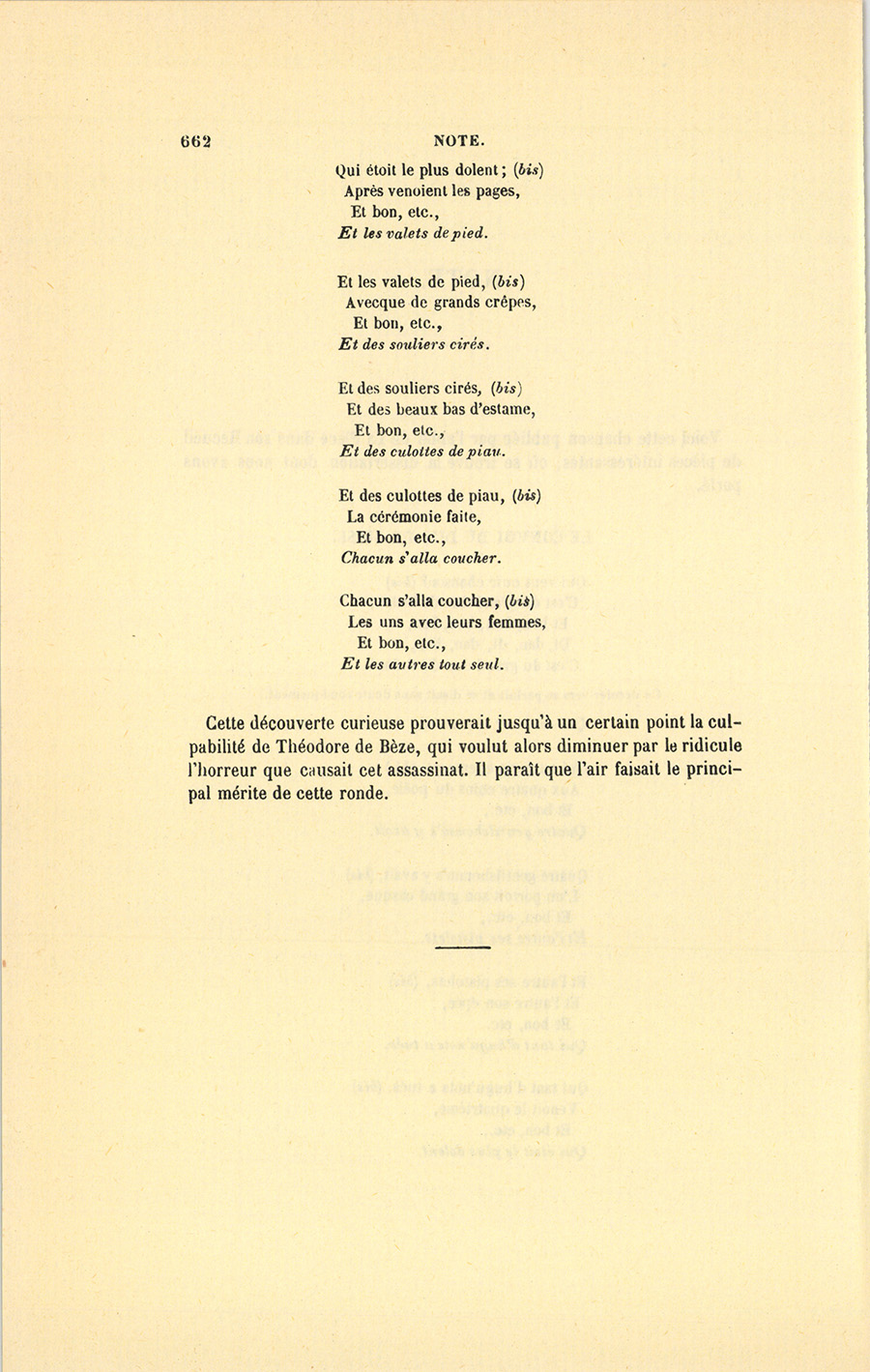 Cette découverte curieuse prouverait jusqu’à un certain point la culpabilité de Théodore de Bèze, qui voulut alors diminuer par le ridicule l’horreur que causait cet assassinat. Il paraît que l’air faisait le principal mérite de cette ronde.