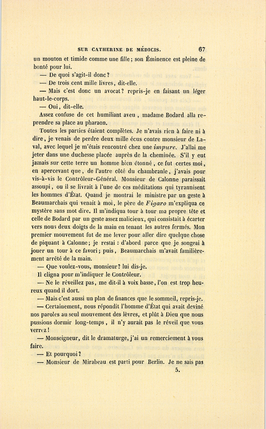 Le contrôleur devint fort attentif, et sa voisine, madame de {p. 71} Genlis, fort occupée. Le provincial hésitait encore. Beaumarchais lui dit alors avec vivacité : – Mais allez donc, maître ! Ne savez-vous pas que quand les lois laissent si peu de liberté, les peuples prennent leur revanche dans les mœurs ?…