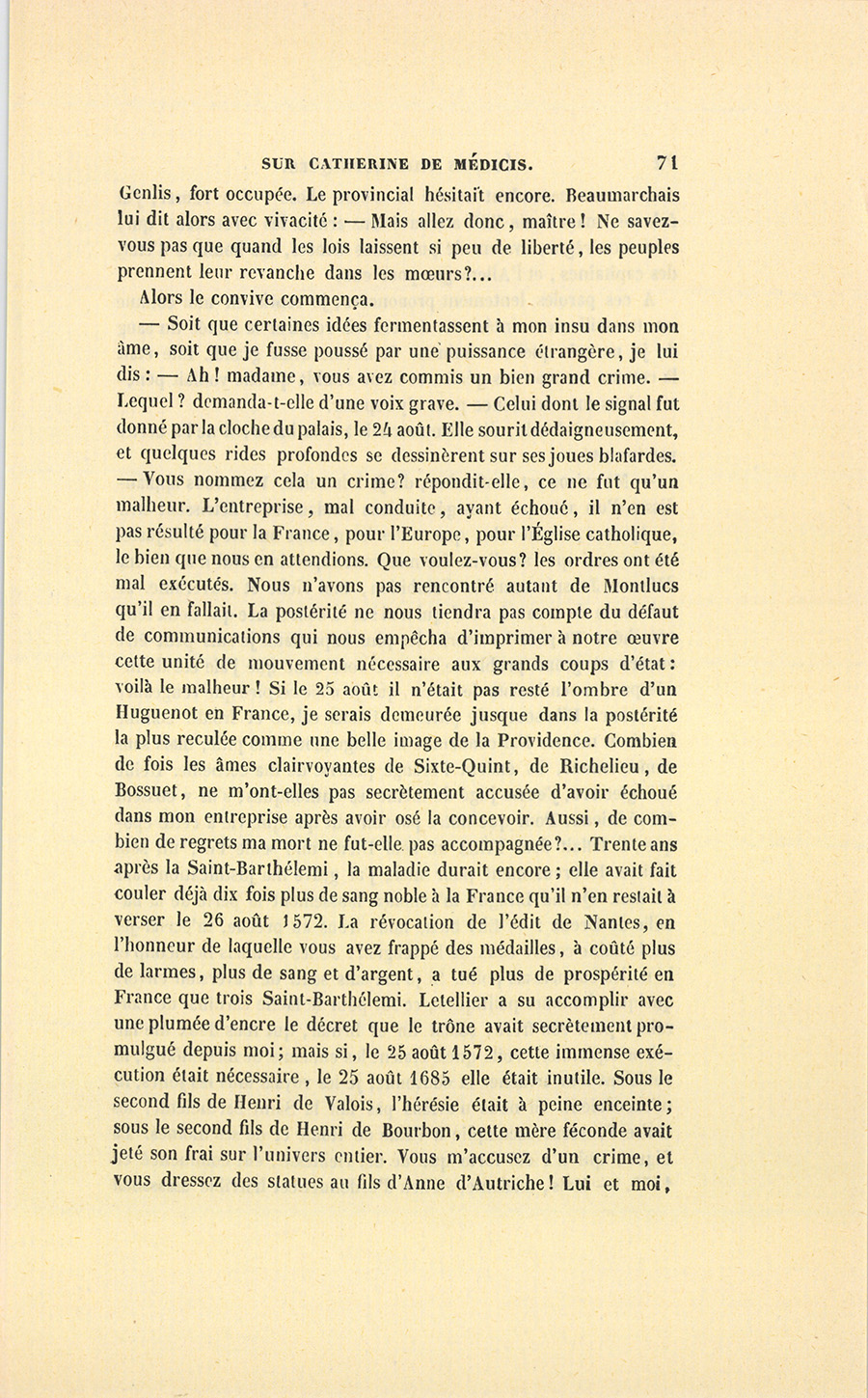 – Soit que certaines idées fermentassent à mon insu dans mon âme, soit que je fusse poussé par une puissance étrangère, je lui dis : – Ah ! madame, vous avez commis un bien grand crime. – Lequel ? demanda-t-elle d’une voix grave. – Celui dont le signal fut donné par la cloche du palais, le 24 août. Elle sourit dédaigneusement, et quelques rides profondes se dessinèrent sur ses joues blafardes. – Vous nommez cela un crime ? répondit-elle, ce ne fut qu’un malheur. L’entreprise, mal conduite, ayant échoué, il n’en est pas résulté pour la France, pour l’Europe, pour l’Église catholique, le bien que nous en attendions. Que voulez-vous ? les ordres ont été mal exécutés. Nous n’avons pas rencontré autant de Montlucs qu’il en fallait. La postérité ne nous tiendra pas compte du défaut de communications qui nous empêcha d’imprimer à notre œuvre cette unité de mouvement nécessaire aux grands coups d’État58 : voilà le malheur ! Si le 25 août il n’était pas resté l’ombre d’un Huguenot en France, je serais demeurée jusque dans la postérité la plus reculée comme une belle image de la Providence. Combien de fois les âmes clairvoyantes de Sixte-Quint, de Richelieu, de Bossuet, ne m’ont-elles pas secrètement accusée d’avoir échoué dans mon entreprise après avoir osé la concevoir. Aussi, de combien de regrets ma mort ne fut-elle pas accompagnée ?… Trente ans après la Saint-Barthélemi, la maladie durait encore ; elle avait fait couler déjà dix fois plus de sang noble à la France qu’il n’en restait à verser le 26 août 1572. La révocation de l’édit de Nantes, en l’honneur de laquelle vous avez frappé des médailles, a59 coûté plus de larmes, plus de sang et d’argent, a tué plus de prospérité en France que trois Saint-Barthélemi. Letellier a su accomplir avec une plumée d’encre le décret que le trône avait secrètement promulgué depuis moi ; mais si, le 25 août 1572, cette immense exécution était nécessaire, le 25 août 1685 elle était inutile. Sous le second fils de Henri de Valois, l’hérésie était à peine enceinte ; sous le second fils de Henri de Bourbon, cette mère féconde avait jeté son frai sur l’univers entier. Vous m’accusez d’un crime, et vous dressez des statues au fils d’Anne d’Autriche ! Lui et moi, {p. 72} nous avons cependant essayé la même chose : il a réussi, j’ai échoué ; mais Louis XIV a trouvé sans armes les Protestants qui, sous mon règne, avaient de puissantes armées, des hommes d’État60, des capitaines, et l’Allemagne pour eux.