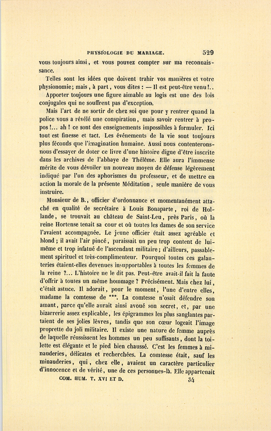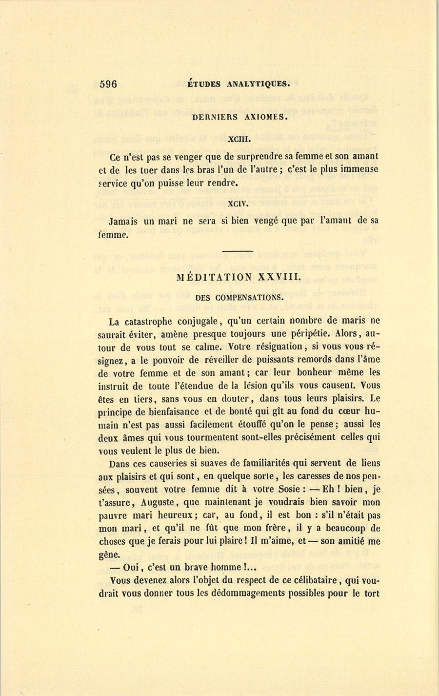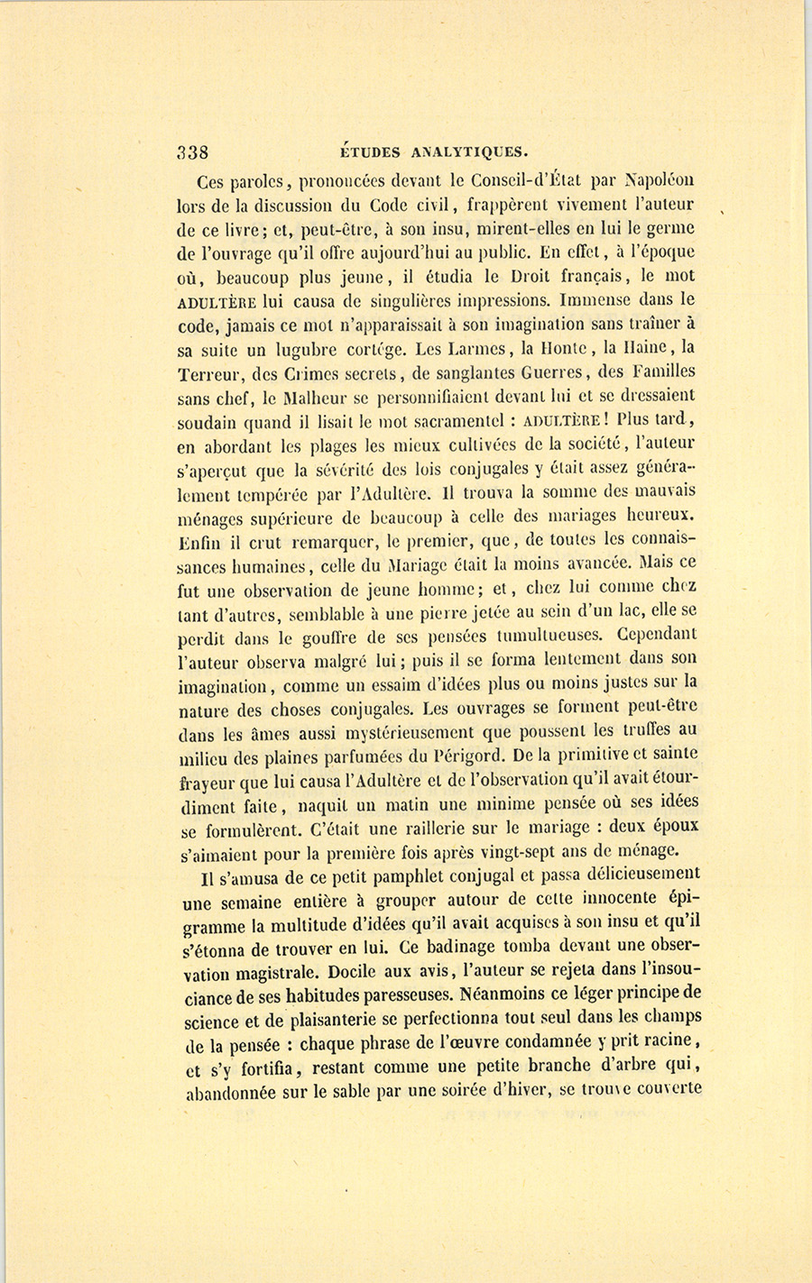 {p. 338} Ces paroles, prononcées devant le Conseil-d’État par Napoléon lors de la discussion du Code civil, frappèrent vivement l’auteur de ce livre ; et, peut-être, à son insu, mirent-elles en lui le germe de l’ouvrage qu’il offre aujourd’hui au public. En effet, à l’époque où, beaucoup plus jeune, il étudia le Droit français, le mot adultère lui causa de singulières impressions. Immense dans le code, jamais ce mot n’apparaissait à son imagination sans traîner à sa suite un lugubre cortége. Les Larmes, la Honte, la Haine, la Terreur, des Crimes secrets, de sanglantes Guerres, des Familles sans chef, le Malheur se personnifiaient devant lui et se dressaient soudain quand il lisait le mot sacramentel : adultère ! Plus tard, en abordant les plages les mieux cultivées de la société, l’auteur s’aperçut que la sévérité des lois conjugales y était assez généralement tempérée par l’Adultère. Il trouva la somme des mauvais ménages supérieure de beaucoup à celle des mariages heureux. Enfin il crut remarquer, le premier, que, de toutes les connaissances humaines, celle du Mariage était la moins avancée. Mais ce fut une observation de jeune homme ; et, chez lui comme chez tant d’autres, semblable à une pierre jetée au sein d’un lac, elle se perdit dans le gouffre de ses pensées tumultueuses. Cependant l’auteur observa malgré lui ; puis il se forma lentement dans son imagination, comme un essaim d’idées plus ou moins justes sur la nature des choses conjugales. Les ouvrages se forment peut-être dans les âmes aussi mystérieusement que poussent les truffes au milieu des plaines parfumées du Périgord. De la primitive et sainte frayeur que lui causa l’Adultère et de l’observation qu’il avait étourdiment faite, naquit un matin une minime pensée où ses idées se formulèrent. C’était une raillerie sur le mariage : deux époux s’aimaient pour la première fois après vingt-sept ans de ménage.