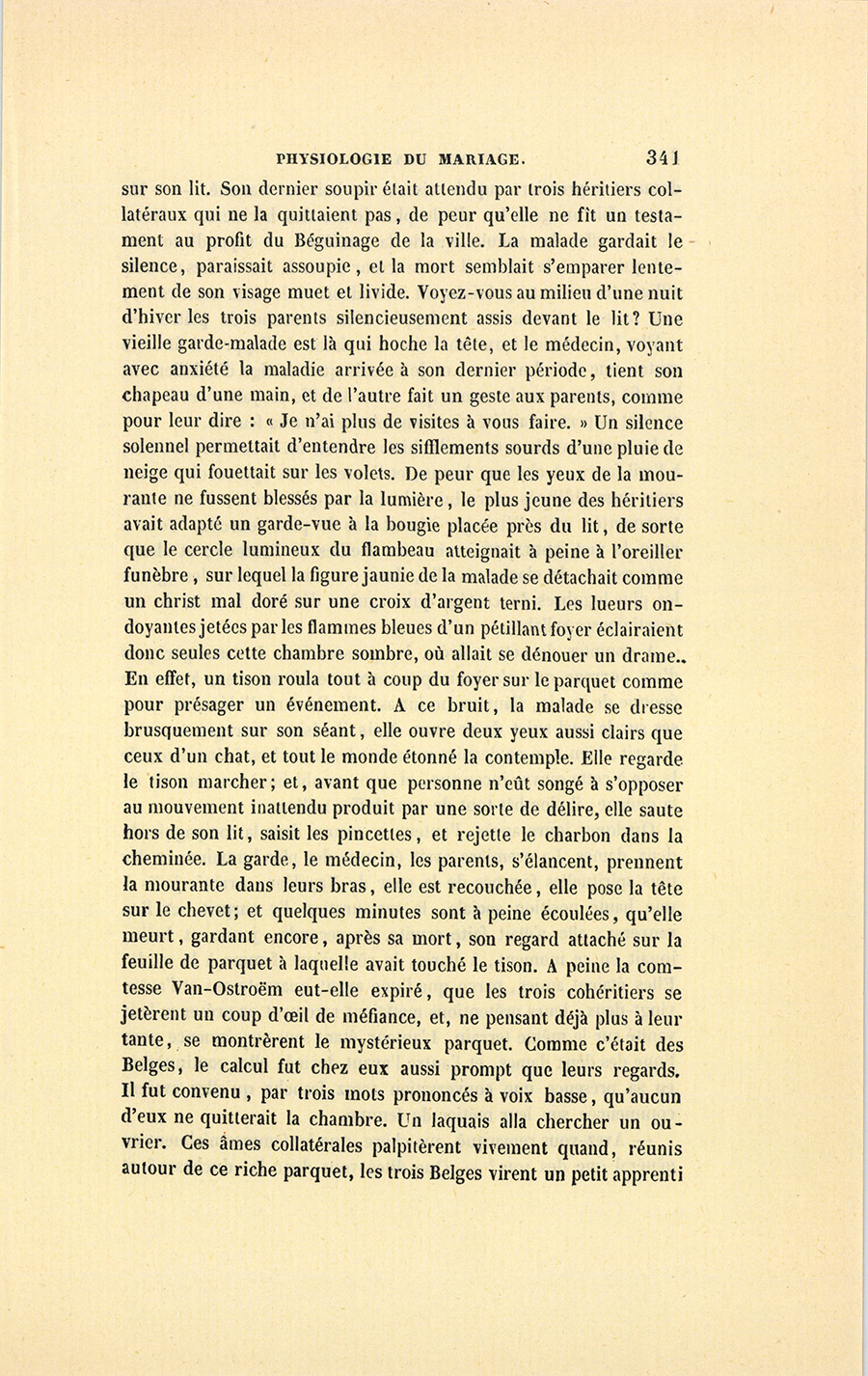 – Un fait eut lieu à Gand au moment où j’y étais. Attaquée d’une maladie mortelle, une dame, veuve depuis dix ans, gisait {p. 341} sur son lit. Son dernier soupir était attendu par trois héritiers collatéraux qui ne la quittaient pas, de peur qu’elle ne fît un testament au profit du Béguinage de la ville. La malade gardait le silence, paraissait assoupie, et la mort semblait s’emparer lentement de son visage muet et livide. Voyez-vous au milieu d’une nuit d’hiver les trois parents silencieusement assis devant le lit ? Une vieille garde-malade est là qui hoche la tête, et le médecin, voyant avec anxiété la maladie arrivée à son dernier période, tient son chapeau d’une main, et de l’autre fait un geste aux parents, comme pour leur dire : « Je n’ai plus de visites à vous faire. » Un silence solennel permettait d’entendre les sifflements sourds d’une pluie de neige qui fouettait sur les volets. De peur que les yeux de la mourante ne fussent blessés par la lumière, le plus jeune des héritiers avait adapté un garde-vue à la bougie placée près du lit, de sorte que le cercle lumineux du flambeau atteignait à peine à l’oreiller funèbre, sur lequel la figure jaunie de la malade se détachait comme un christ mal doré sur une croix d’argent terni. Les lueurs ondoyantes jetées par les flammes bleues d’un pétillant foyer éclairaient donc seules cette chambre sombre, où allait se dénouer un drame… En effet, un tison roula tout à coup du foyer sur le parquet comme pour présager un événement. À ce bruit, la malade se dresse brusquement sur son séant, elle ouvre deux yeux aussi clairs que ceux d’un chat, et tout le monde étonné la contemple. Elle regarde le tison marcher ; et, avant que personne n’eût songé à s’opposer au mouvement inattendu produit par une sorte de délire, elle saute hors de son lit, saisit les pincettes, et rejette le charbon dans la cheminée. La garde, le médecin, les parents, s’élancent, prennent la mourante dans leurs bras, elle est recouchée, elle pose la tête sur le chevet ; et quelques minutes sont à peine écoulées, qu’elle meurt, gardant encore, après sa mort, son regard attaché sur la feuille de parquet à laquelle avait touché le tison. À peine la comtesse Van-Ostroëm eut-elle expiré, que les trois cohéritiers se jetèrent un coup d’œil de méfiance, et, ne pensant déjà plus à leur tante, se montrèrent le mystérieux parquet. Comme c’était des Belges, le calcul fut chez eux aussi prompt que leurs regards. Il fut convenu, par trois mots prononcés à voix basse, qu’aucun d’eux ne quitterait la chambre. Un laquais alla chercher un ouvrier. Ces âmes collatérales palpitèrent vivement quand, réunis autour de ce riche parquet, les trois Belges virent un petit apprenti {p. 342} donnant le premier coup de ciseau. Le bois est tranché. – « Ma tante a fait un geste !… dit le plus jeune des héritiers. – Non, c’est un effet des ondulations de la lumière !… » répondit le plus âgé qui avait à la fois l’œil sur le trésor et sur la morte. Les parents affligés trouvèrent, précisément à l’endroit où le tison avait roulé, une masse artistement enveloppée d’une couche de plâtre. – « Allez !… » dit le vieux cohéritier. Le ciseau de l’apprenti fit alors sauter une tête humaine, et je ne sais quel vestige d’habillement leur fit reconnaître le comte que toute la ville croyait mort à Java et dont la perte avait été vivement pleurée par sa femme.