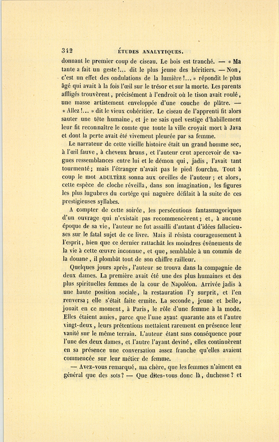 Le narrateur de cette vieille histoire était un grand homme sec, à l’œil fauve, à cheveux bruns, et l’auteur crut apercevoir de vagues ressemblances entre lui et le démon qui, jadis, l’avait tant tourmenté ; mais l’étranger n’avait pas le pied fourchu. Tout à coup le mot adultère sonna aux oreilles de l’auteur ; et alors, cette espèce de cloche réveilla, dans son imagination, les figures les plus lugubres du cortége qui naguère défilait à la suite de ces prestigieuses syllabes.