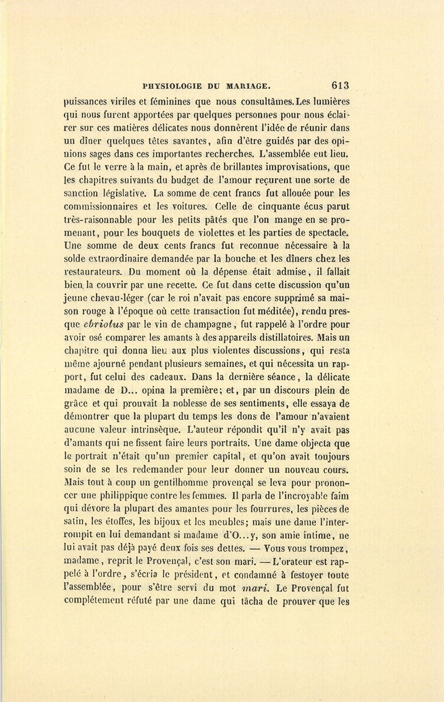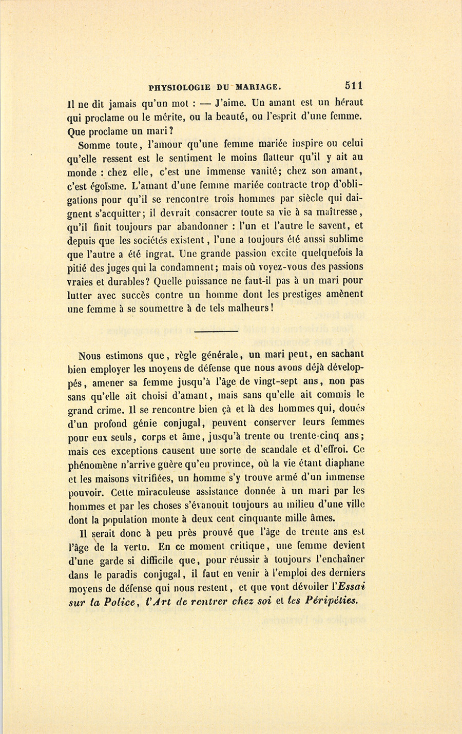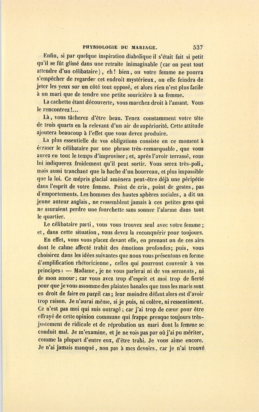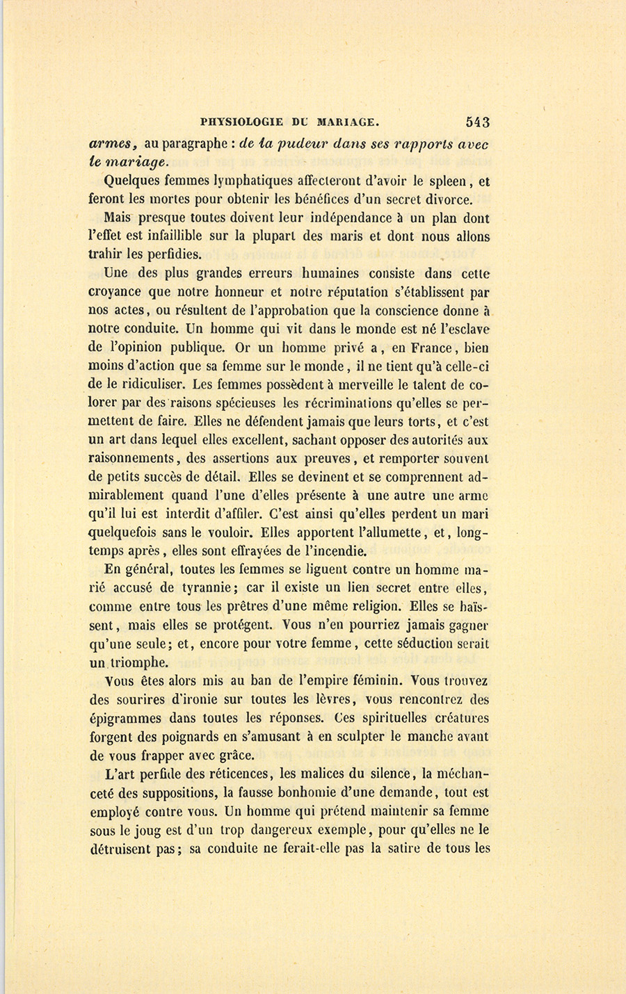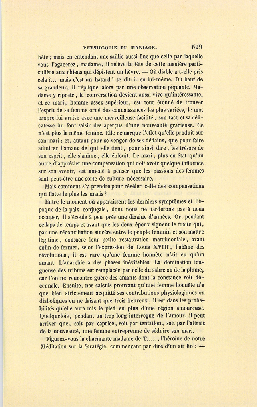 {p. 610} – Monsieur, lui dis-je, ce serait pousser loin le dévouement pour la philosophie éclectique que de consigner vos idées dans mon ouvrage ; car c’est le détruire. Tout y est basé sur l’amour platonique ou sensuel. Dieu me garde de finir mon livre par de tels blasphèmes sociaux ! J’essaierai plutôt de retourner par quelque subtilité pantagruélique à mon troupeau de célibataires et de femmes honnêtes, en m’ingéniant à trouver quelque utilité sociale et raisonnable à leurs passions et à leurs folies. Oh ! oh ! si la paix conjugale nous conduit à des raisonnements si désenchanteurs, si sombres, je connais bien des maris qui préféreraient la guerre.
