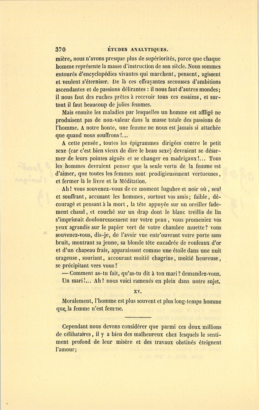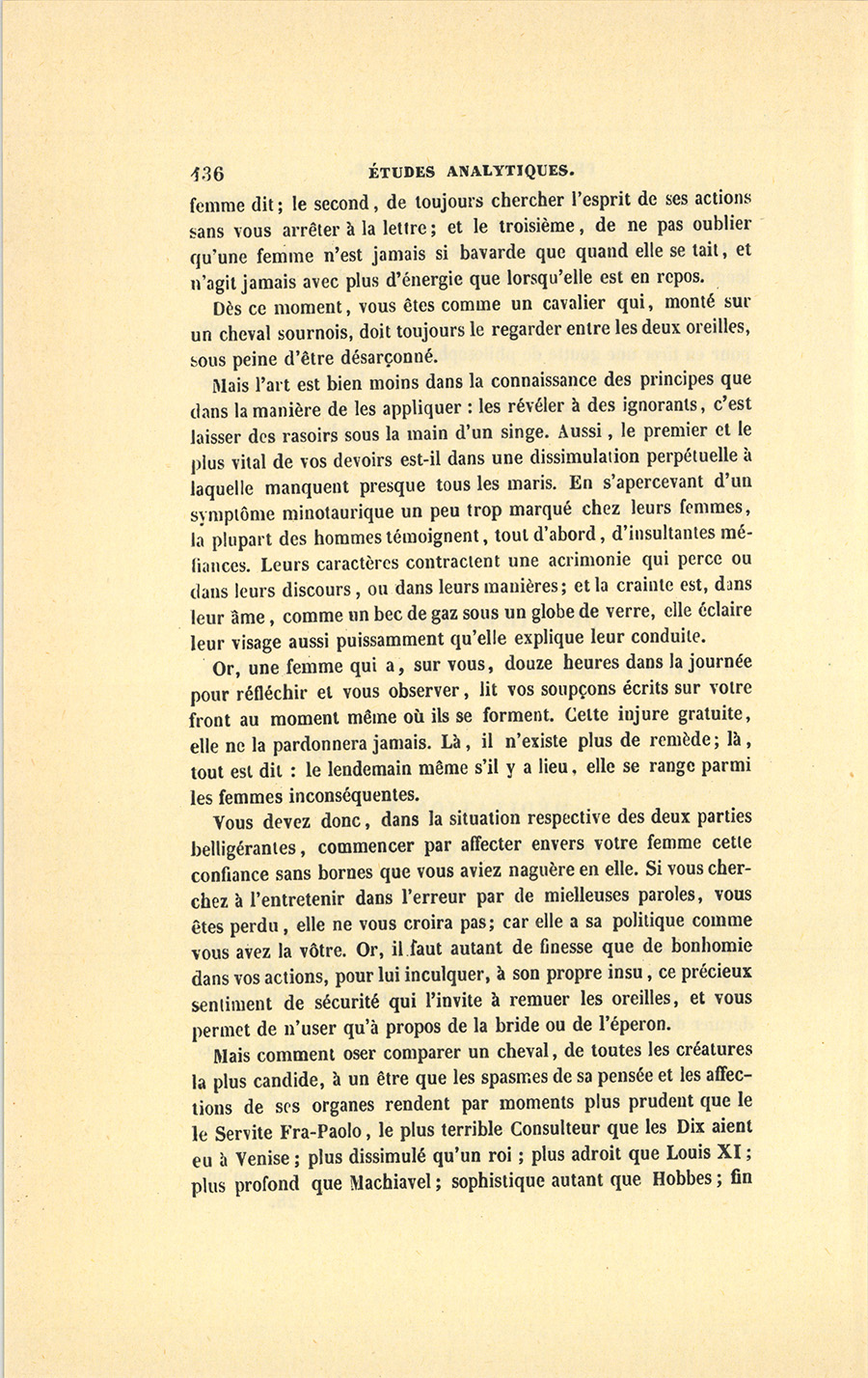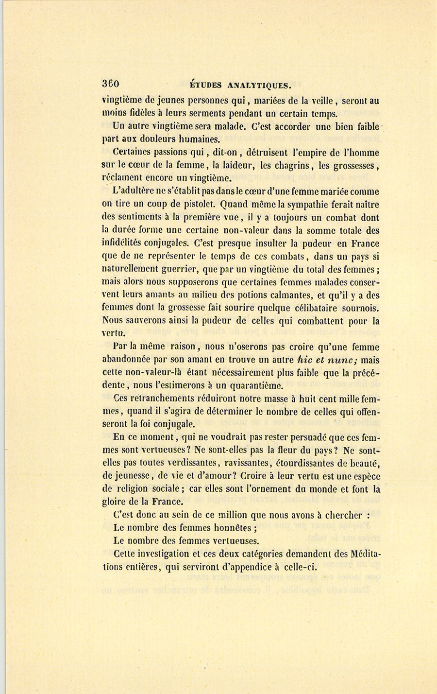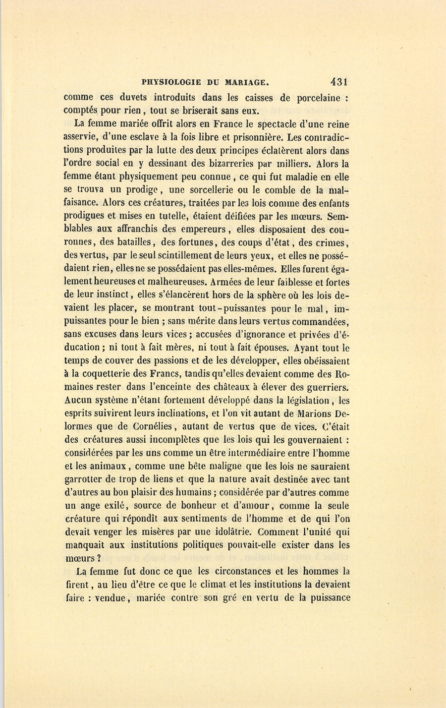 {p. 610} – Monsieur, lui dis-je, ce serait pousser loin le dévouement pour la philosophie éclectique que de consigner vos idées dans mon ouvrage ; car c’est le détruire. Tout y est basé sur l’amour platonique ou sensuel. Dieu me garde de finir mon livre par de tels blasphèmes sociaux ! J’essaierai plutôt de retourner par quelque subtilité pantagruélique à mon troupeau de célibataires et de femmes honnêtes, en m’ingéniant à trouver quelque utilité sociale et raisonnable à leurs passions et à leurs folies. Oh ! oh ! si la paix conjugale nous conduit à des raisonnements si désenchanteurs, si sombres, je connais bien des maris qui préféreraient la guerre.