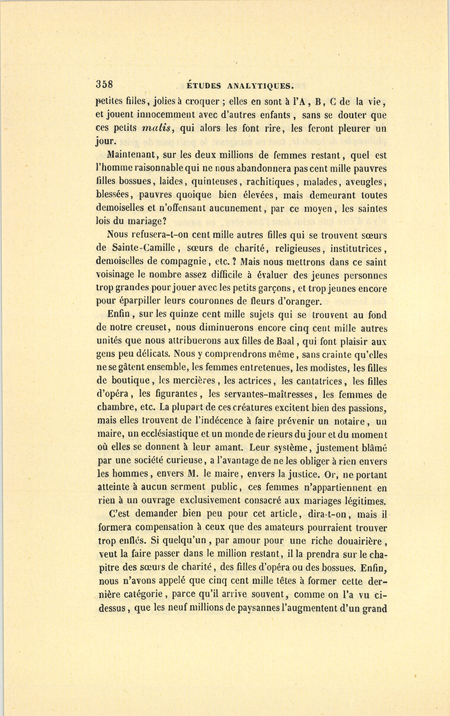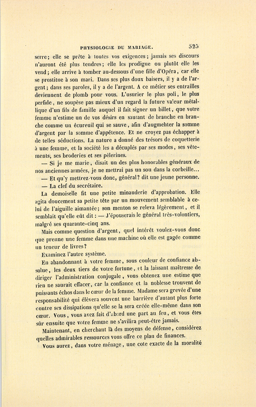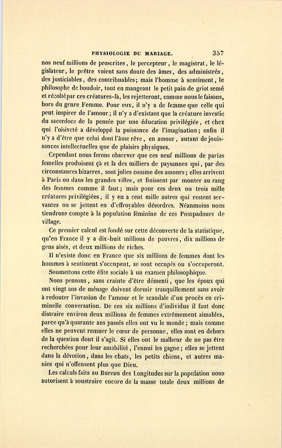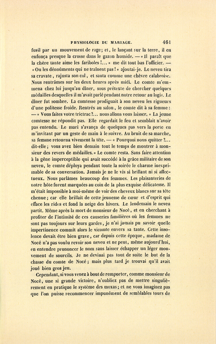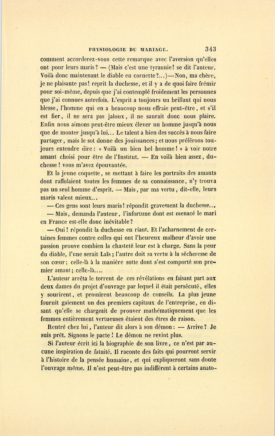 {p. 610} – Monsieur, lui dis-je, ce serait pousser loin le dévouement pour la philosophie éclectique que de consigner vos idées dans mon ouvrage ; car c’est le détruire. Tout y est basé sur l’amour platonique ou sensuel. Dieu me garde de finir mon livre par de tels blasphèmes sociaux ! J’essaierai plutôt de retourner par quelque subtilité pantagruélique à mon troupeau de célibataires et de femmes honnêtes, en m’ingéniant à trouver quelque utilité sociale et raisonnable à leurs passions et à leurs folies. Oh ! oh ! si la paix conjugale nous conduit à des raisonnements si désenchanteurs, si sombres, je connais bien des maris qui préféreraient la guerre.