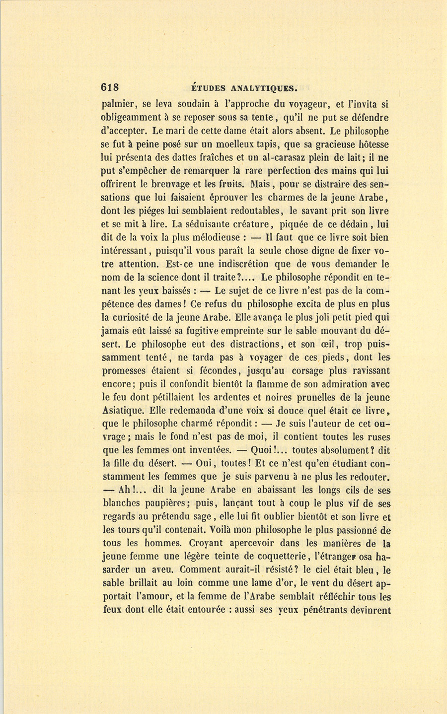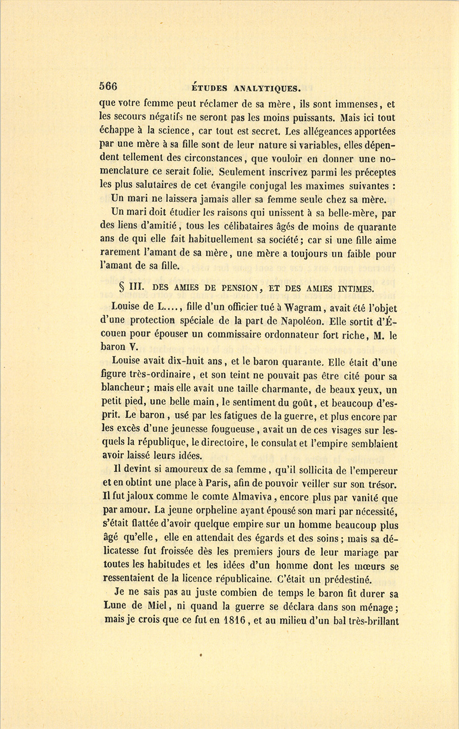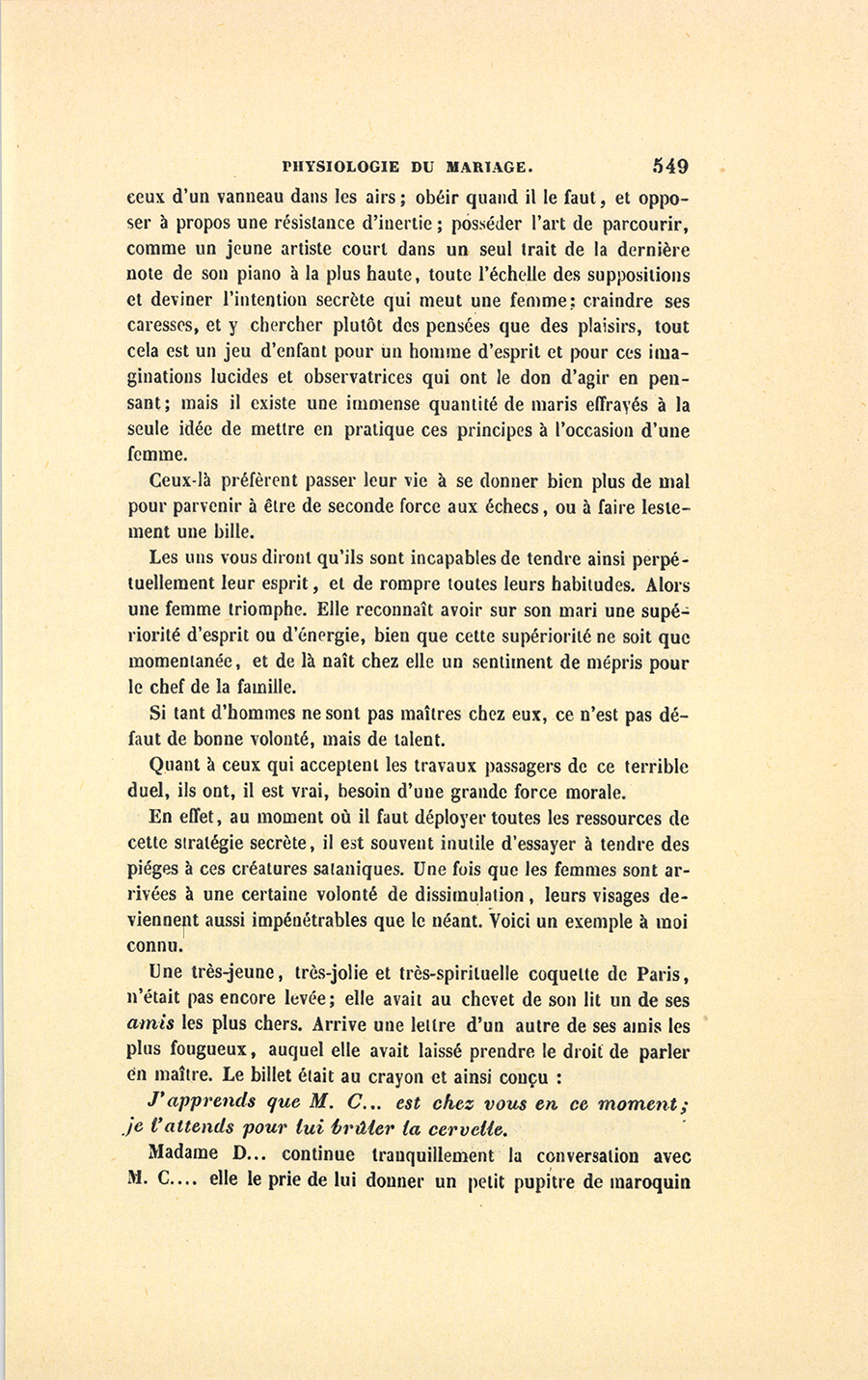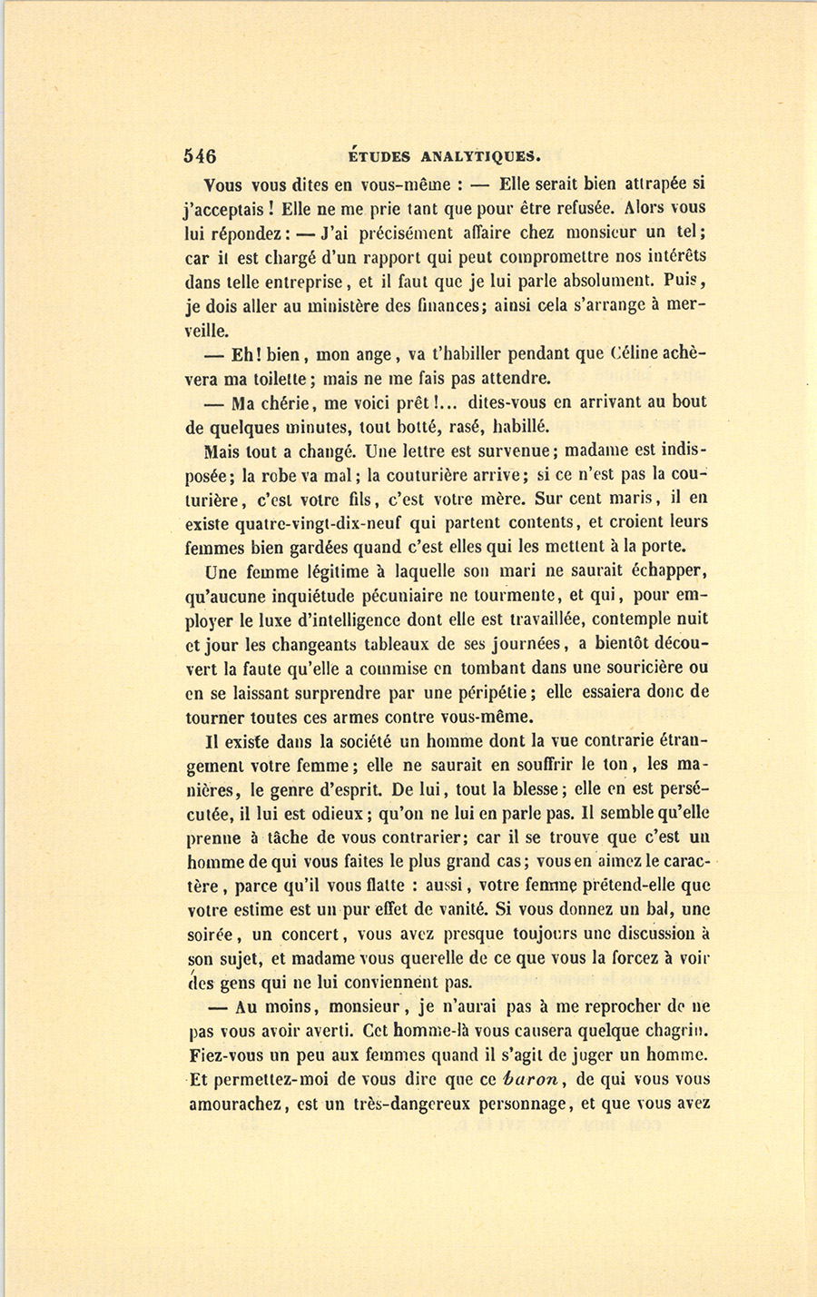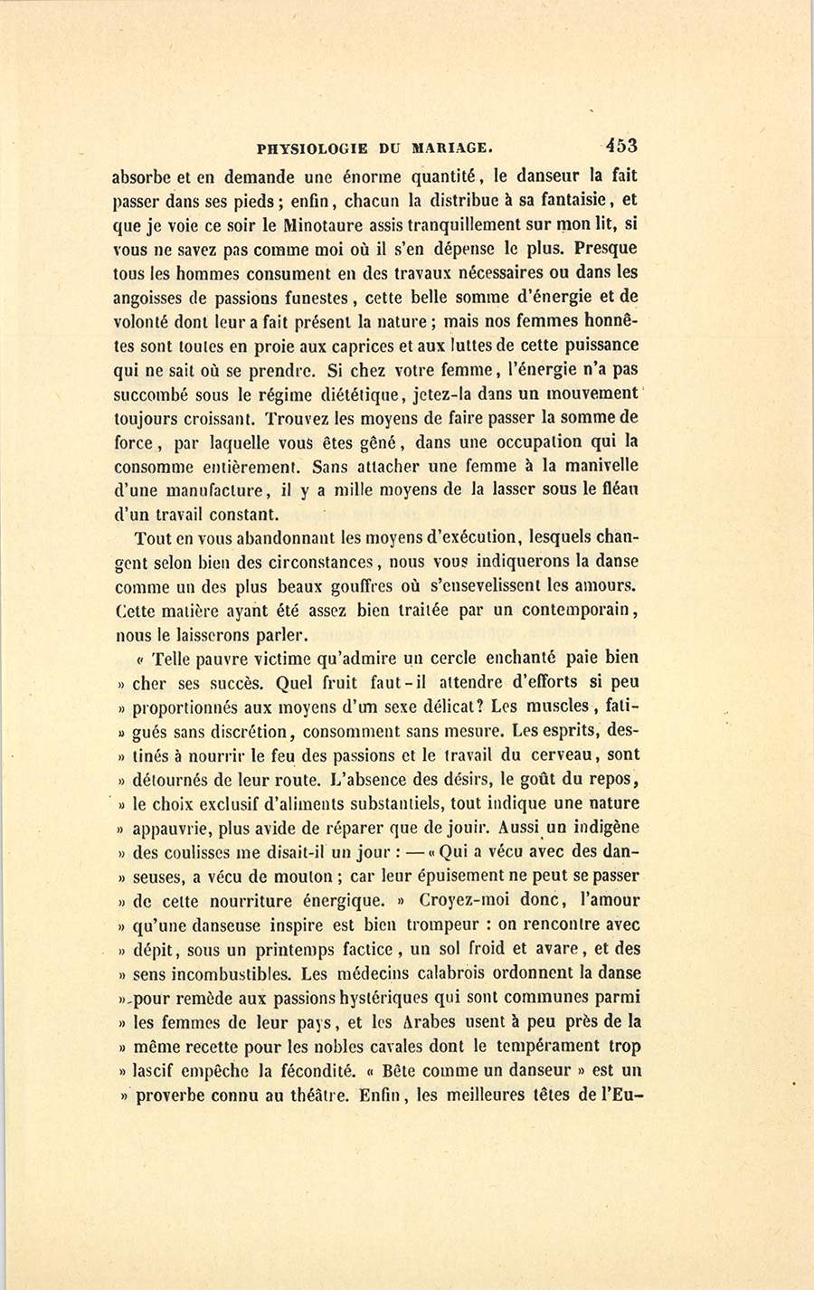 {p. 610} – Monsieur, lui dis-je, ce serait pousser loin le dévouement pour la philosophie éclectique que de consigner vos idées dans mon ouvrage ; car c’est le détruire. Tout y est basé sur l’amour platonique ou sensuel. Dieu me garde de finir mon livre par de tels blasphèmes sociaux ! J’essaierai plutôt de retourner par quelque subtilité pantagruélique à mon troupeau de célibataires et de femmes honnêtes, en m’ingéniant à trouver quelque utilité sociale et raisonnable à leurs passions et à leurs folies. Oh ! oh ! si la paix conjugale nous conduit à des raisonnements si désenchanteurs, si sombres, je connais bien des maris qui préféreraient la guerre.