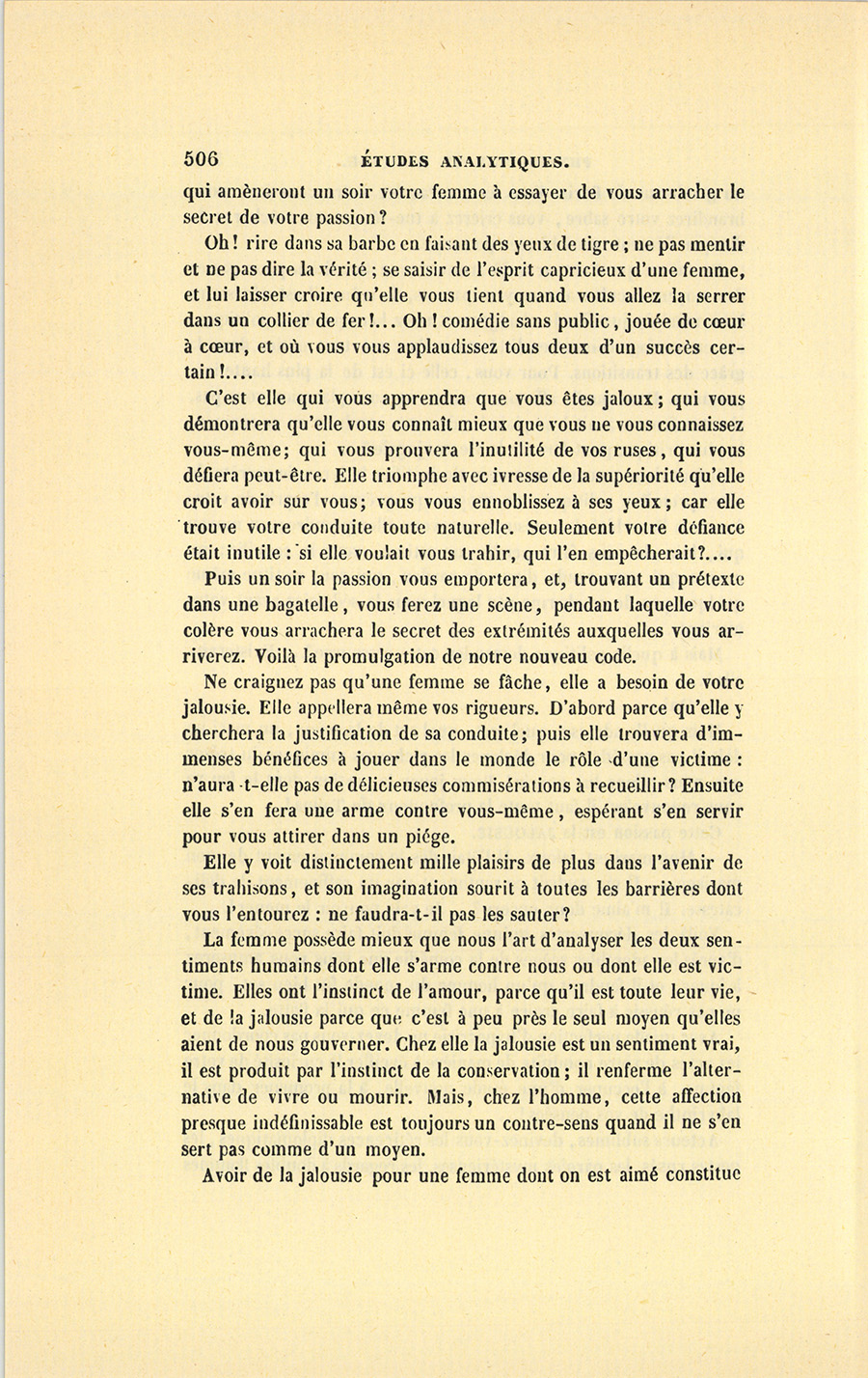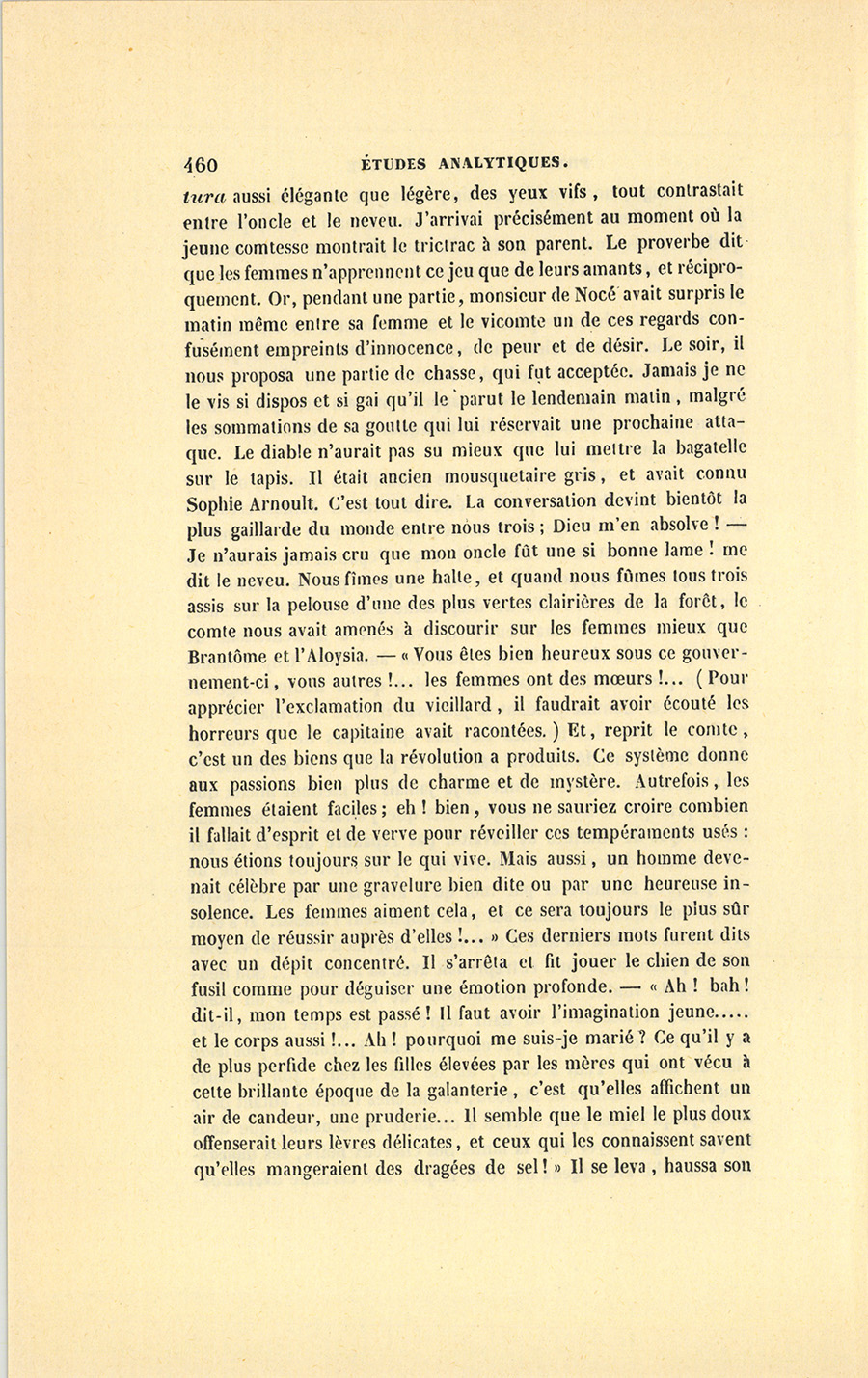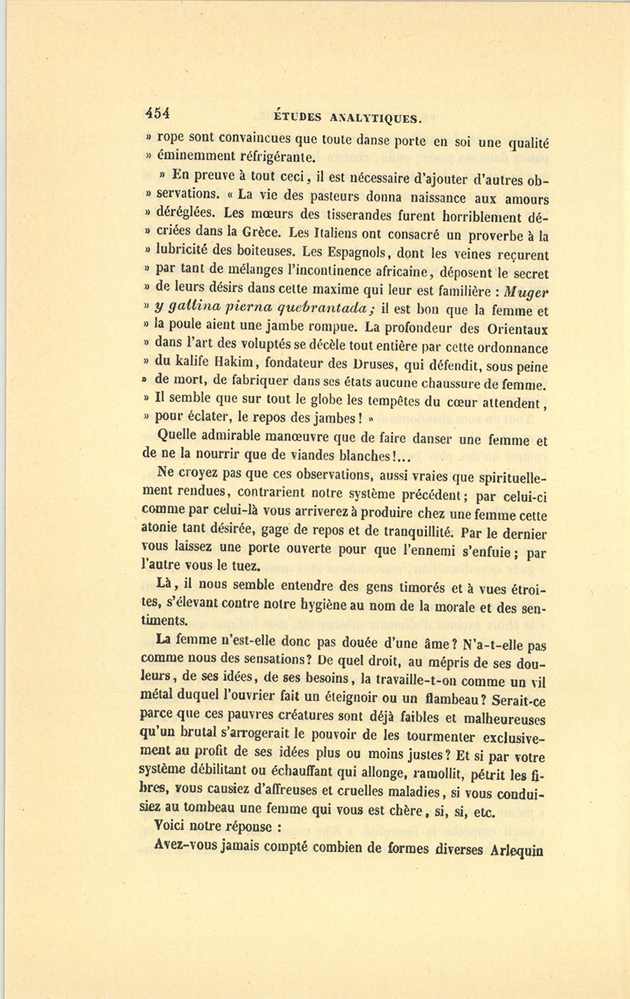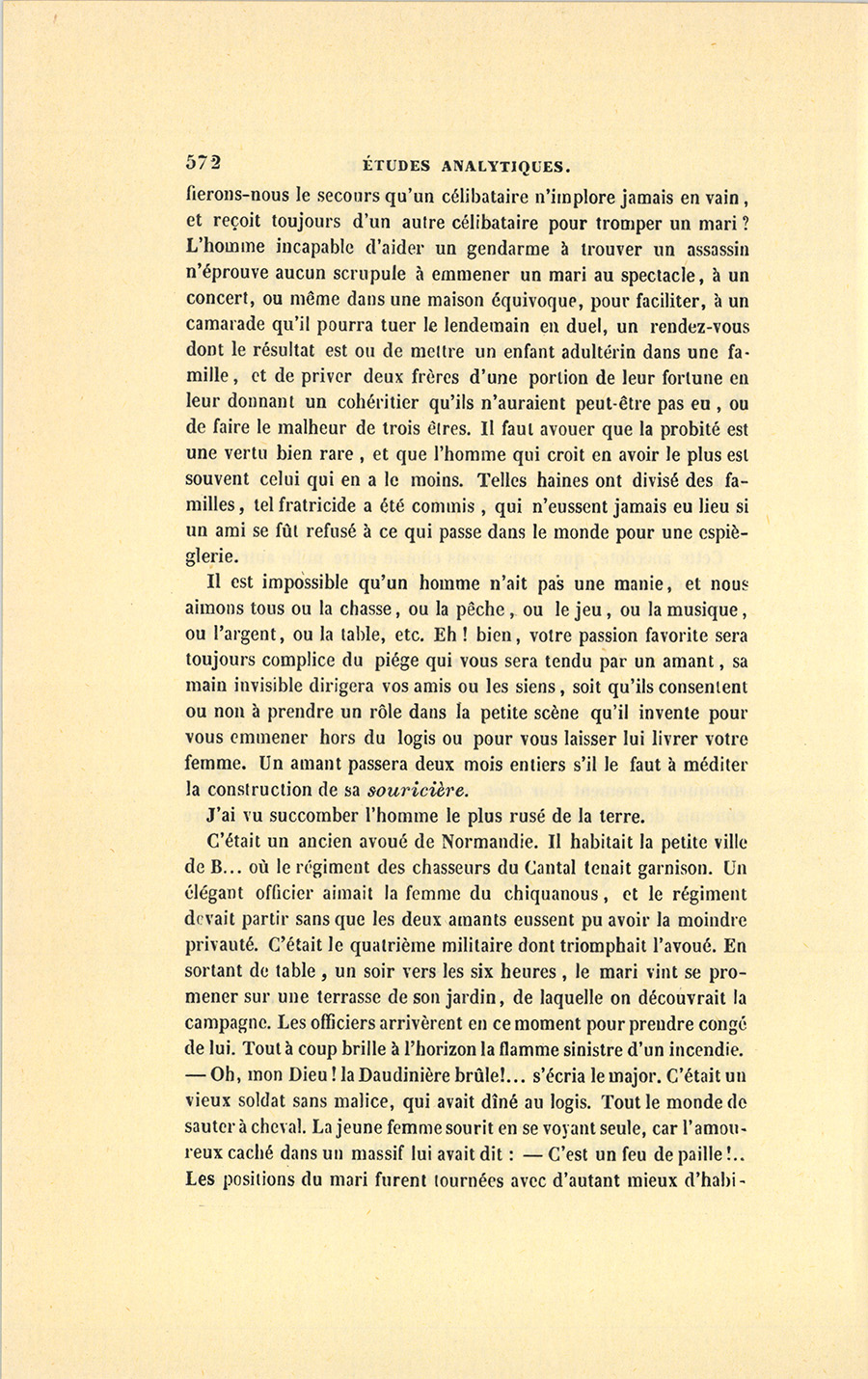 {p. 610} – Monsieur, lui dis-je, ce serait pousser loin le dévouement pour la philosophie éclectique que de consigner vos idées dans mon ouvrage ; car c’est le détruire. Tout y est basé sur l’amour platonique ou sensuel. Dieu me garde de finir mon livre par de tels blasphèmes sociaux ! J’essaierai plutôt de retourner par quelque subtilité pantagruélique à mon troupeau de célibataires et de femmes honnêtes, en m’ingéniant à trouver quelque utilité sociale et raisonnable à leurs passions et à leurs folies. Oh ! oh ! si la paix conjugale nous conduit à des raisonnements si désenchanteurs, si sombres, je connais bien des maris qui préféreraient la guerre.