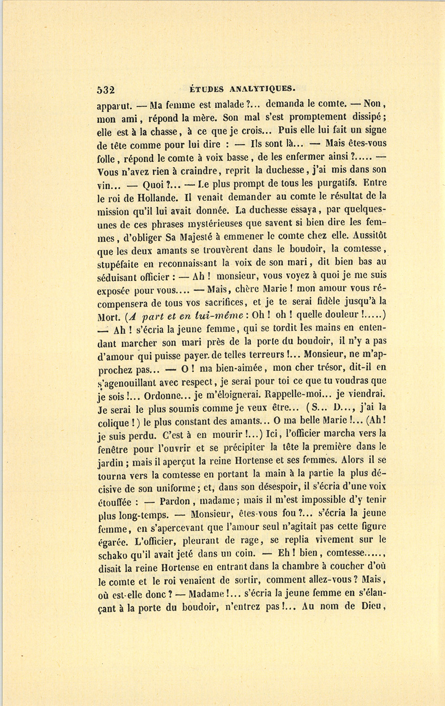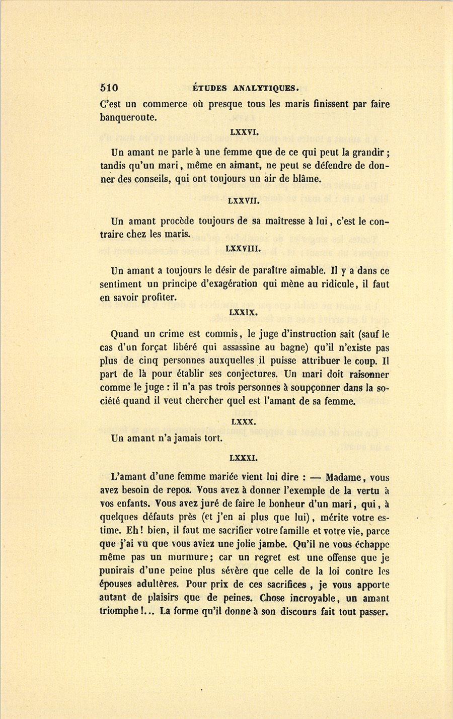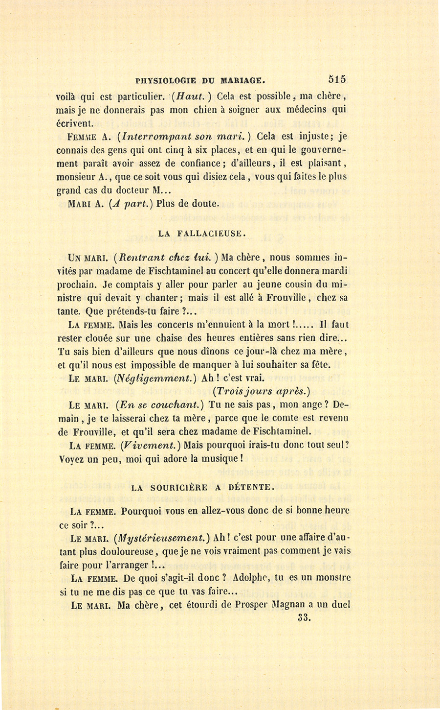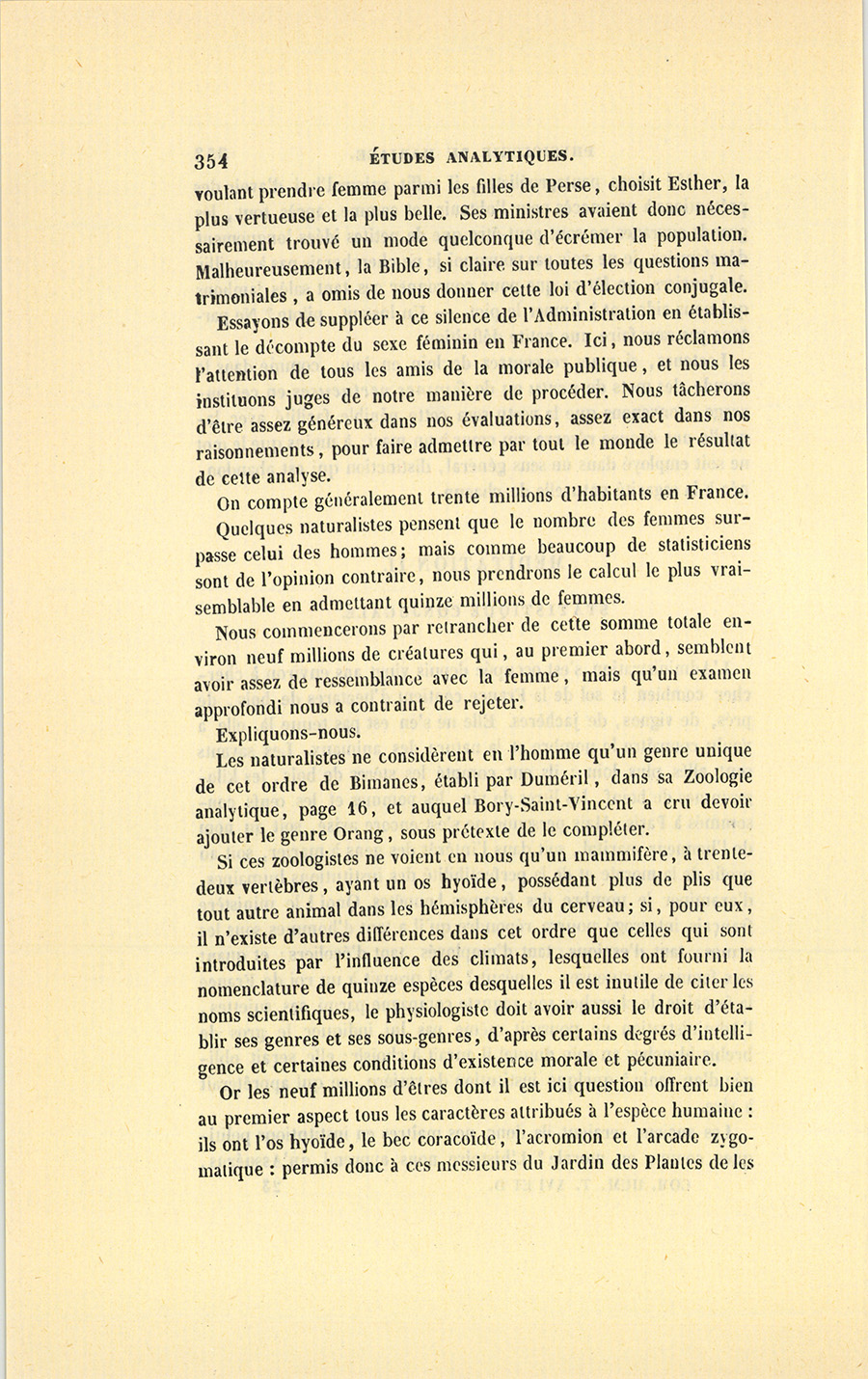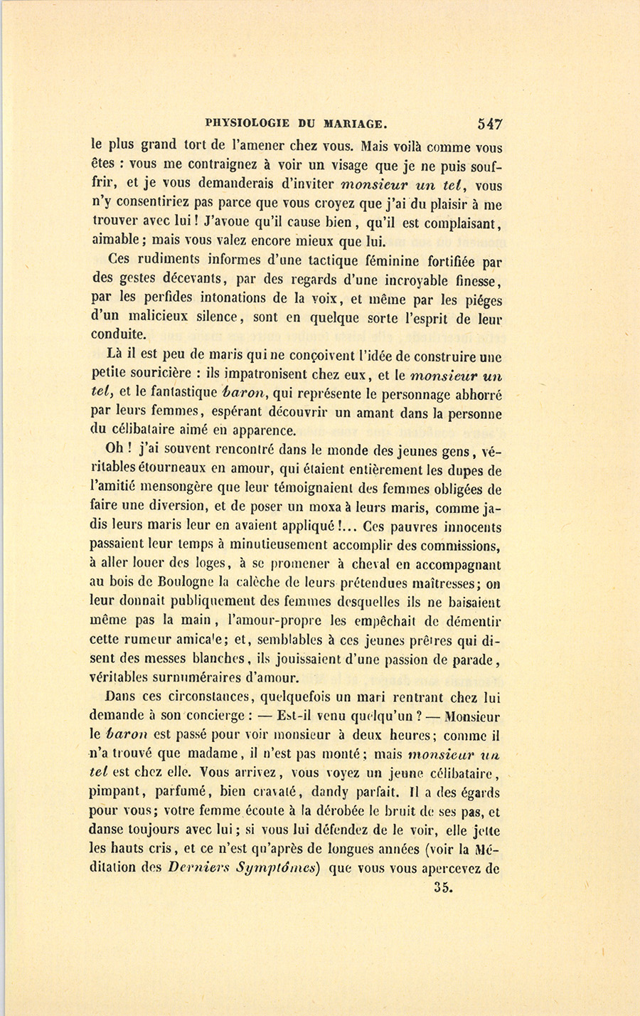 {p. 610} – Monsieur, lui dis-je, ce serait pousser loin le dévouement pour la philosophie éclectique que de consigner vos idées dans mon ouvrage ; car c’est le détruire. Tout y est basé sur l’amour platonique ou sensuel. Dieu me garde de finir mon livre par de tels blasphèmes sociaux ! J’essaierai plutôt de retourner par quelque subtilité pantagruélique à mon troupeau de célibataires et de femmes honnêtes, en m’ingéniant à trouver quelque utilité sociale et raisonnable à leurs passions et à leurs folies. Oh ! oh ! si la paix conjugale nous conduit à des raisonnements si désenchanteurs, si sombres, je connais bien des maris qui préféreraient la guerre.