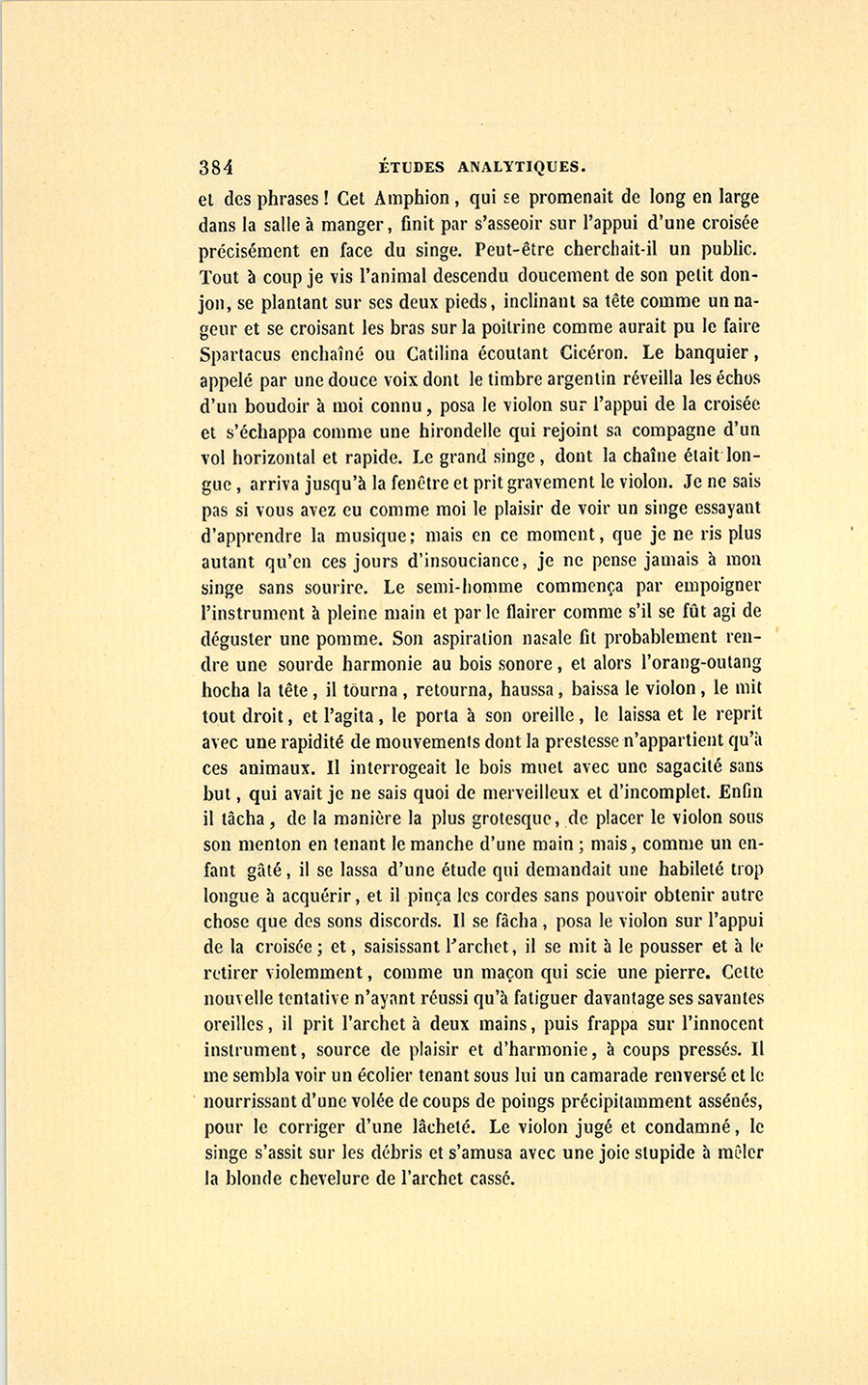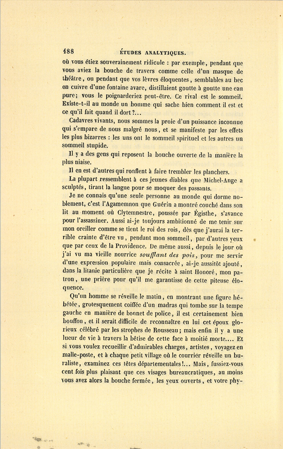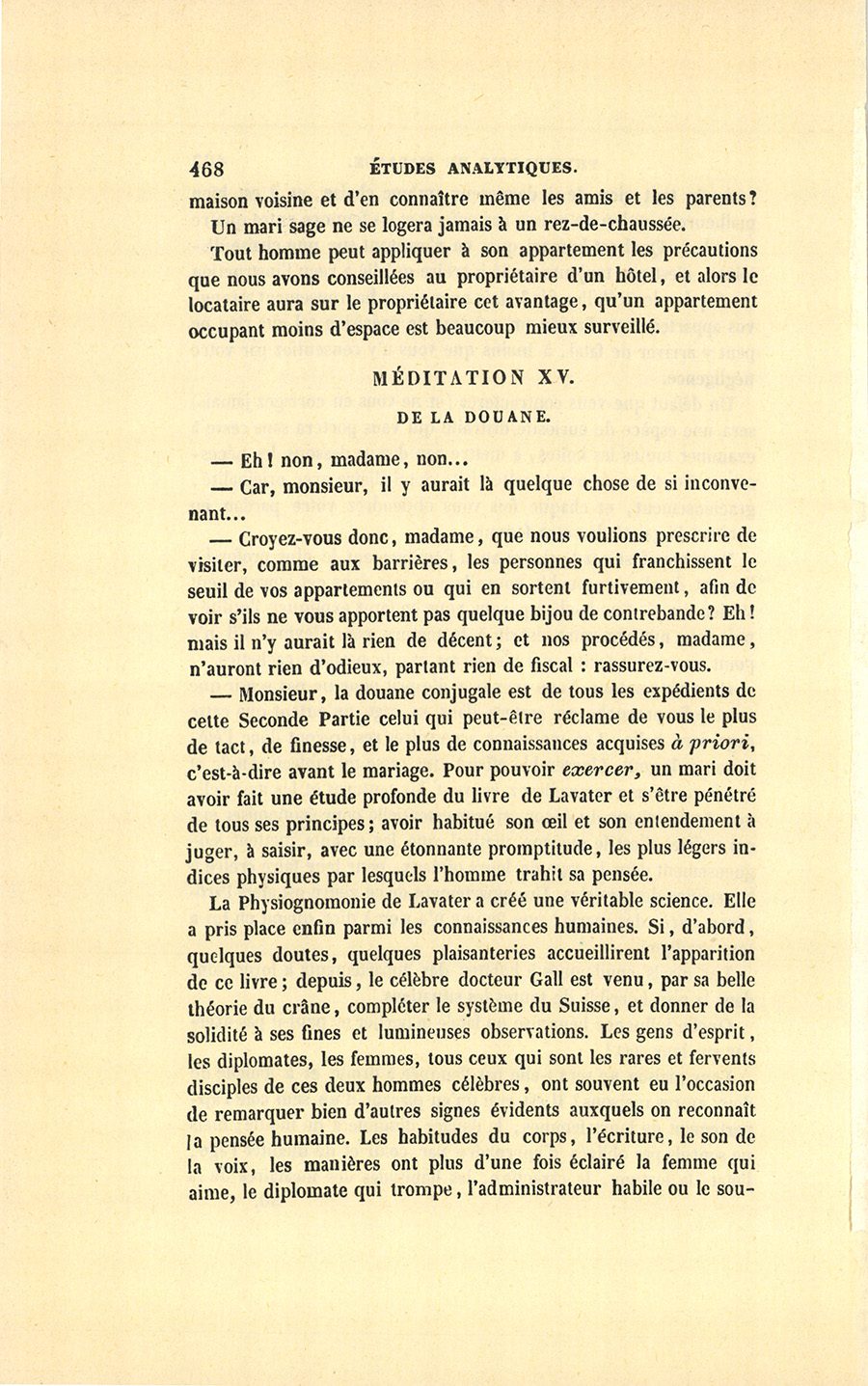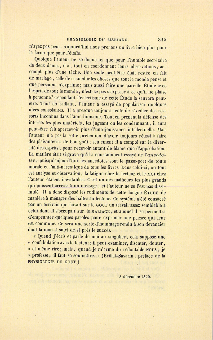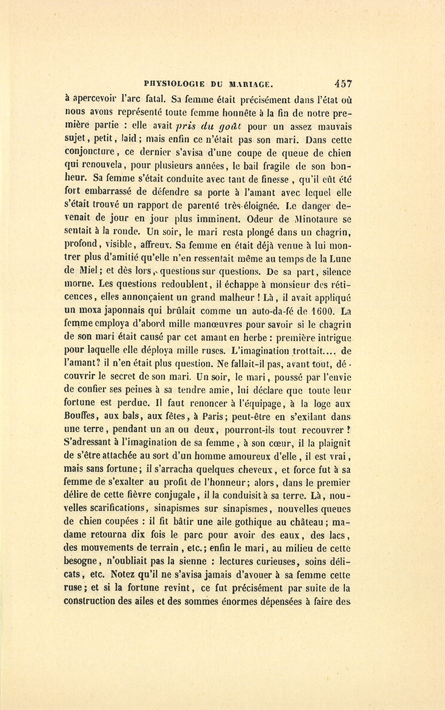 Un jour, en revenant du ministère, après être long-temps demeuré devant la riche et savoureuse bibliothèque de Chevet, balançant entre une somme de cent francs à débourser et les jouissances promises par un pâté de foies gras de Strasbourg, vous êtes stupéfait de trouver le pâté insolemment installé sur le buffet de votre salle à manger. Est-ce en vertu d’une espèce de mirage gastronomique ?… Dans cette incertitude, vous marchez à lui (un pâté est une créature animée) d’un pas ferme, vous semblez hennir en subodorant les truffes dont le parfum traverse les savantes cloisons dorées ; vous vous penchez à deux reprises différentes ; toutes les houppes nerveuses de votre palais ont une âme ; vous savourez les plaisirs d’une véritable fête ; et, dans cette extase, un remords vous poursuivant, vous arrivez chez votre femme.