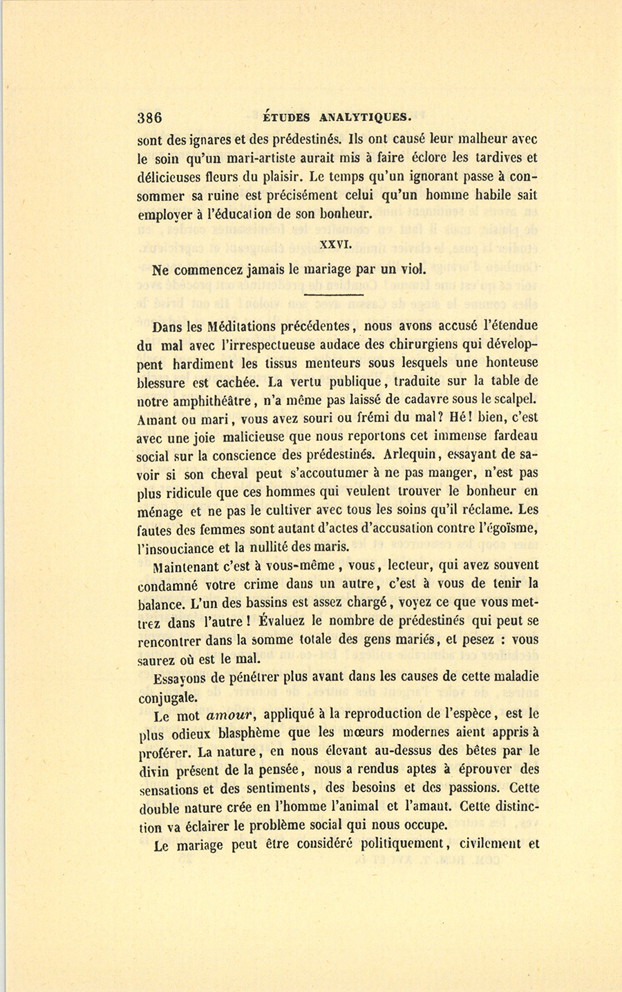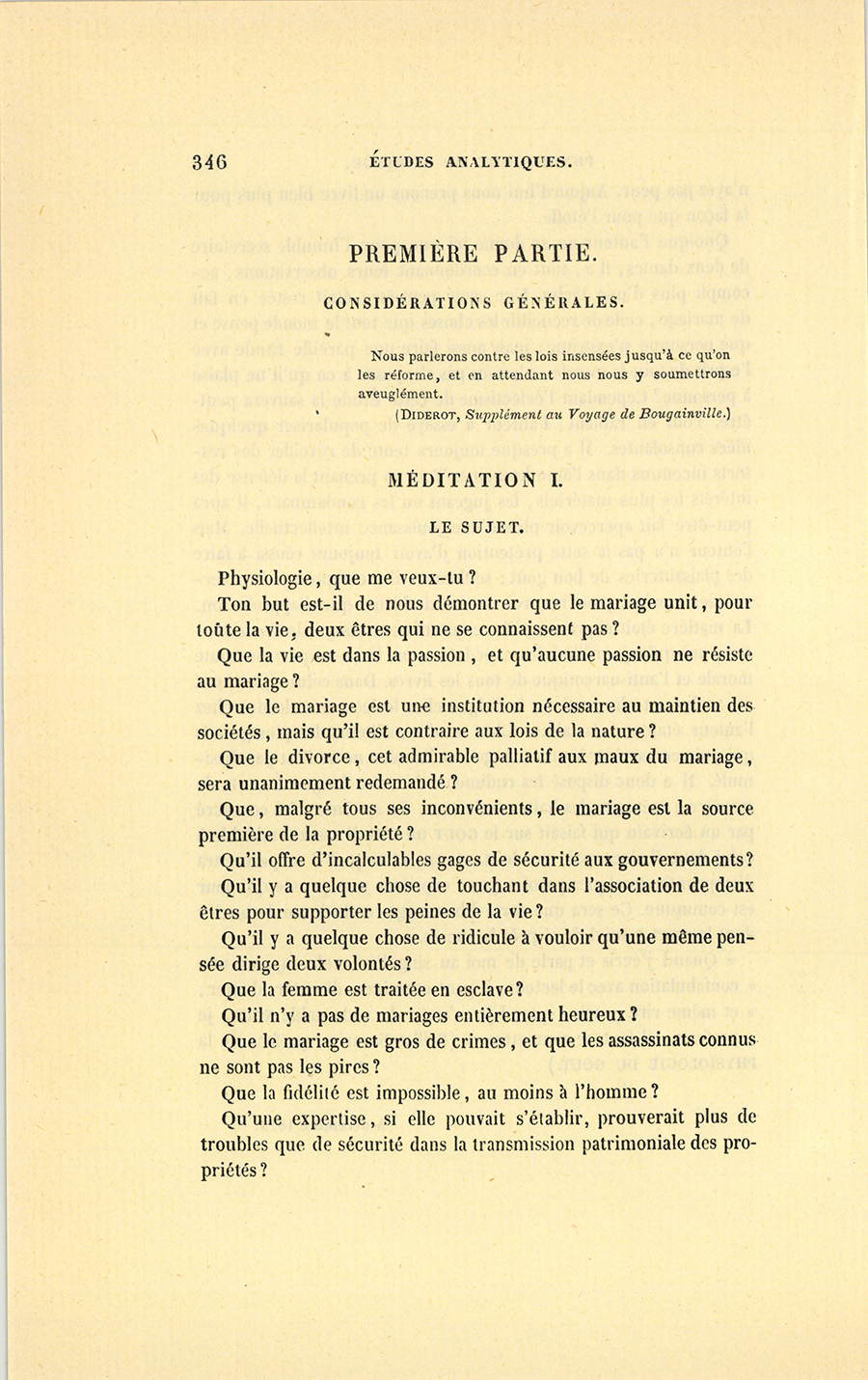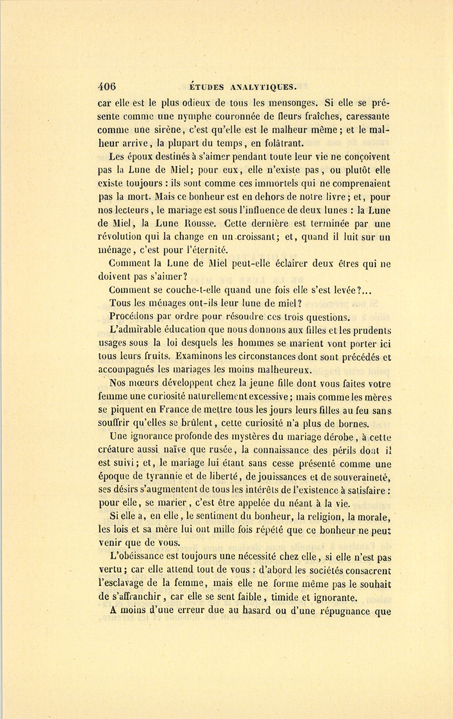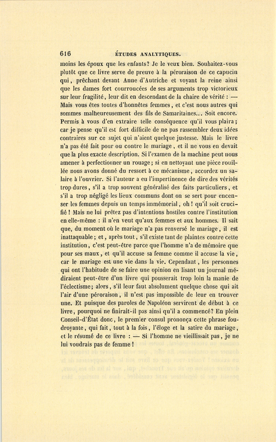 Ici tout est banal comme les pavés d’une rue, vulgaire comme un carrefour. Le mariage est plus connu que Barrabas de la Passion ; toutes les vieilles idées qu’il réveille roulent dans les littératures depuis que le monde est monde, et il n’y a pas d’opinion utile et de projet saugrenu qui ne soient allés trouver un auteur, un imprimeur, un libraire et un lecteur.