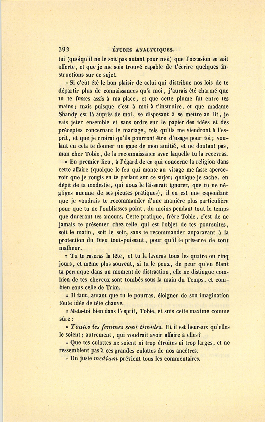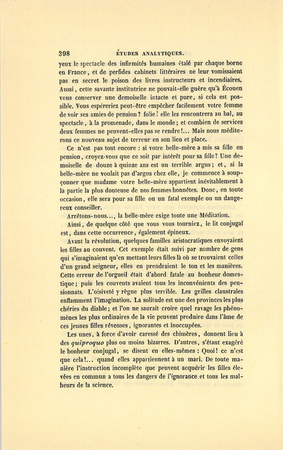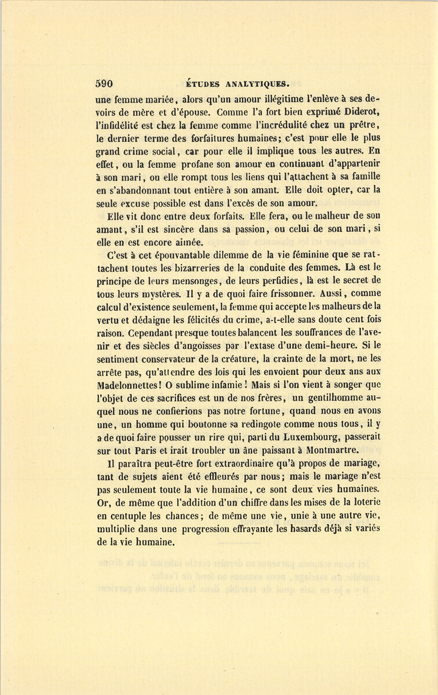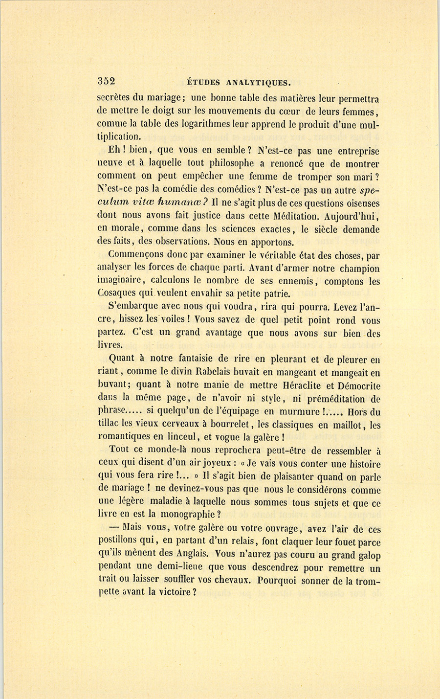 Ici tout est banal comme les pavés d’une rue, vulgaire comme un carrefour. Le mariage est plus connu que Barrabas de la Passion ; toutes les vieilles idées qu’il réveille roulent dans les littératures depuis que le monde est monde, et il n’y a pas d’opinion utile et de projet saugrenu qui ne soient allés trouver un auteur, un imprimeur, un libraire et un lecteur.