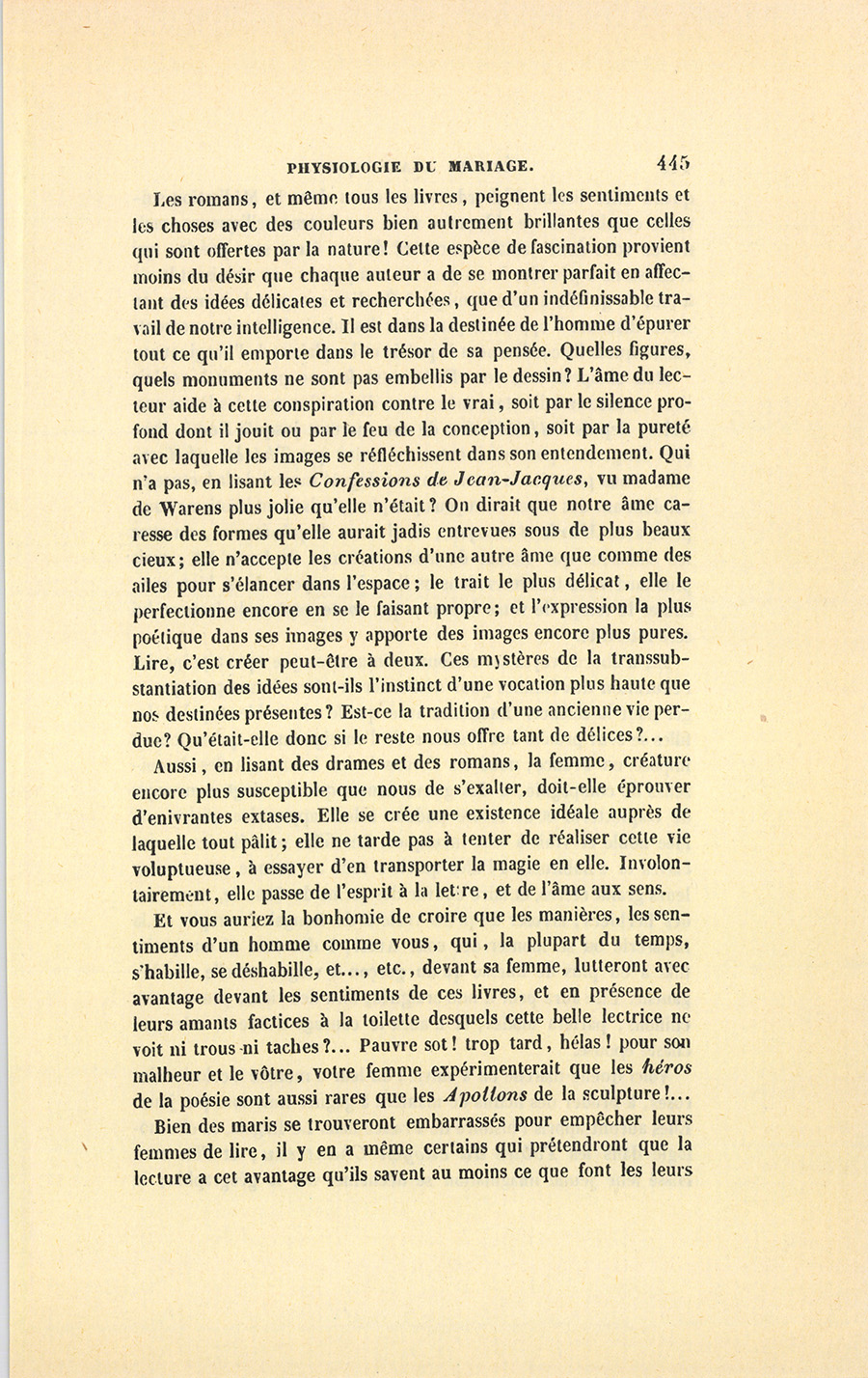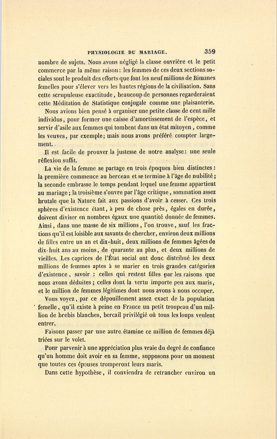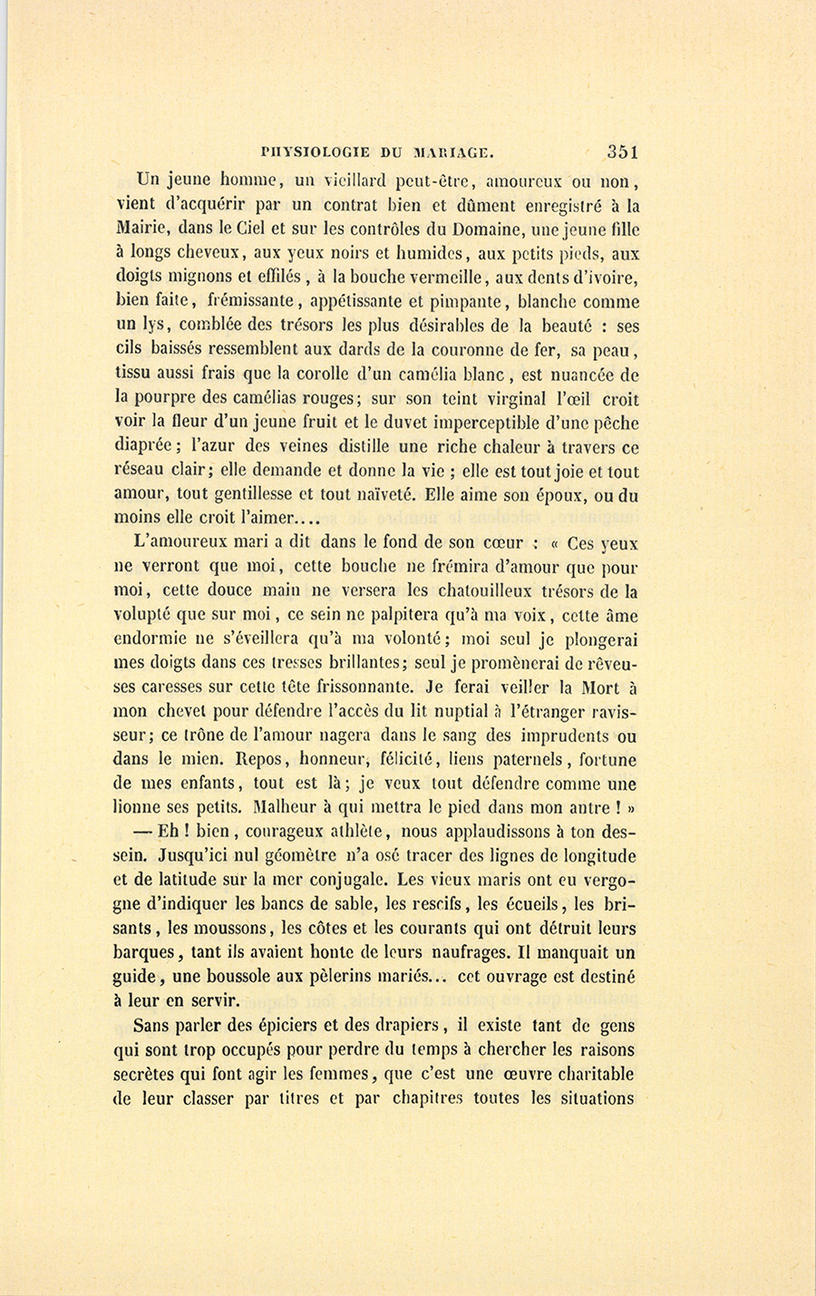 Au dix-neuvième siècle, la Physiologie du Mariage est donc une insignifiante compilation ou l’œuvre d’un niais écrite pour d’autres niais : de vieux prêtres ont pris leurs balances d’or et pesé les moindres scrupules ; de vieux jurisconsultes ont mis leurs lunettes et distingué toutes les espèces ; de vieux médecins ont pris le scalpel et l’ont promené sur toutes les plaies ; de vieux juges ont monté sur leur siége et jugé tous les cas rédhibitoires ; des générations entières ont passé en jetant leur cri de joie ou de douleur ; chaque siècle a lancé son vote dans l’urne ; le Saint-Esprit, les poètes, les écrivains, ont tout enregistré depuis Ève jusqu’à la guerre de Troie, depuis Hélène jusqu’à madame de Maintenon, depuis la femme de Louis XIV jusqu’à la Contemporaine.
