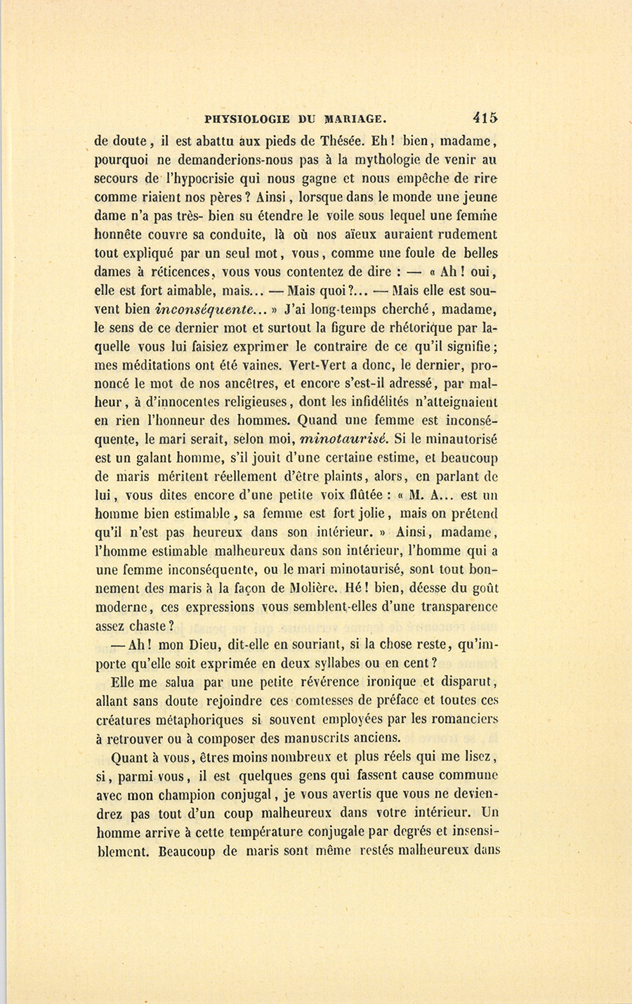 En effet, dans les premiers moments où le minotaure arrive, un homme ressemble à un acteur embarrassé sur un théâtre où il n’a pas l’habitude de se montrer. Il est très-difficile de savoir porter sa sottise avec dignité ; mais cependant les caractères généreux ne sont pas encore tellement rares qu’on ne puisse en trouver un pour notre mari modèle43.