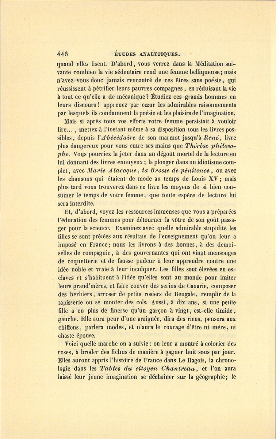 – « Ne vaut-il pas mieux, disait-elle, laisser les choses comme elles sont ? Vont-elles donc si mal ? Il faut croire au mariage comme à l’immortalité de l’âme ; et vous ne faites certainement pas un livre pour vanter le bonheur conjugal. D’ailleurs vous conclurez sans doute d’après un millier de ménages parisiens qui ne sont que des exceptions. Vous trouverez peut-être des maris disposés à vous abandonner leurs femmes ; mais aucun fils ne vous abandonnera sa mère… Quelques personnes blessées par les opinions que vous professerez soupçonneront vos mœurs, calomnieront vos intentions. Enfin, pour toucher aux écrouelles sociales, il faut être roi, ou tout au moins premier consul. »