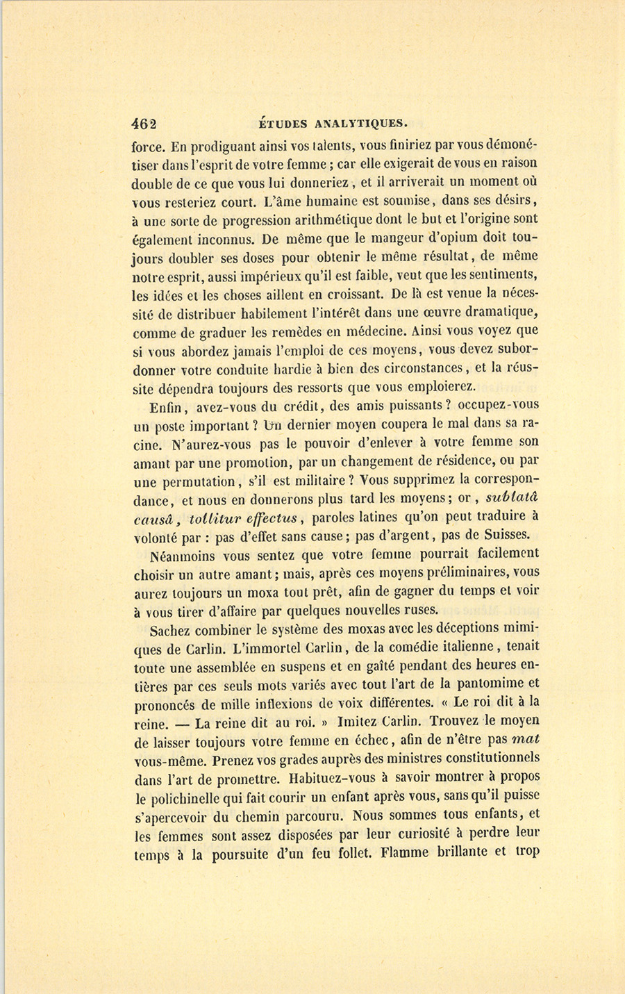 Certain soir, un pauvre mari, retenu au logis par une pluie battante, ou lassé peut-être d’aller passer ses soirées au jeu, au café, dans le monde, ennuyé de tout, se voit contraint après le dîner de suivre sa femme dans la chambre conjugale. Il se plonge dans une bergère et attend sultanesquement son café ; il semble se dire : – Après tout, c’est ma femme !… La syrène apprête elle-même la boisson favorite, elle met un soin particulier à la distiller, la sucre, y goûte, la lui présente ; et, en souriant, elle hasarde, odalisque soumise, une plaisanterie, afin de dérider le front de son maître et seigneur. Jusqu’alors, il avait cru que sa femme était {p. 599} bête ; mais en entendant une saillie aussi fine que celle par laquelle vous l’agacerez, madame, il relève la tête de cette manière particulière aux chiens qui dépistent un lièvre. – Où diable a-t-elle pris cela ?… mais c’est un hasard ! se dit-il en lui-même. Du haut de sa grandeur, il réplique alors par une observation piquante. Madame y riposte, la conversation devient aussi vive qu’intéressante, et ce mari, homme assez supérieur, est tout étonné de trouver l’esprit de sa femme orné des connaissances les plus variées, le mot propre lui arrive avec une merveilleuse facilité ; son tact et sa délicatesse lui font saisir des aperçus d’une nouveauté gracieuse. Ce n’est plus la même femme. Elle remarque l’effet qu’elle produit sur son mari ; et, autant pour se venger de ses dédains, que pour faire admirer l’amant de qui elle tient, pour ainsi dire, les trésors de son esprit, elle s’anime, elle éblouit. Le mari, plus en état qu’un autre d’apprécier une compensation qui doit avoir quelque influence sur son avenir, est amené à penser que les passions des femmes sont peut-être une sorte de culture nécessaire.