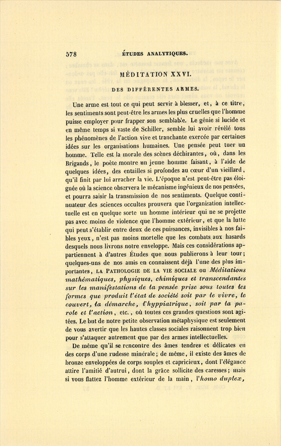 Si l’auteur écrit ici la biographie de son livre, ce n’est par aucune inspiration de fatuité. Il raconte des faits qui pourront servir à l’histoire de la pensée humaine, et qui expliqueront sans doute l’ouvrage même. Il n’est peut-être pas indifférent à certains {p. 344} anatomistes de la pensée de savoir que l’âme est femme. Ainsi, tant que l’auteur s’interdisait de penser au livre qu’il devait faire, le livre se montrait écrit partout. Il en trouvait une page sur le lit d’un malade, une autre sur le canapé d’un boudoir. Les regards des femmes quand elles tournoyaient emportées par une valse, lui jetaient des pensées ; un geste, une parole, fécondaient son cerveau dédaigneux. Le jour où il se dit : – Cet ouvrage, qui m’obsède, se fera !… tout a fui ; et, comme les trois Belges, il releva un squelette, là où il se baissait pour saisir un trésor.