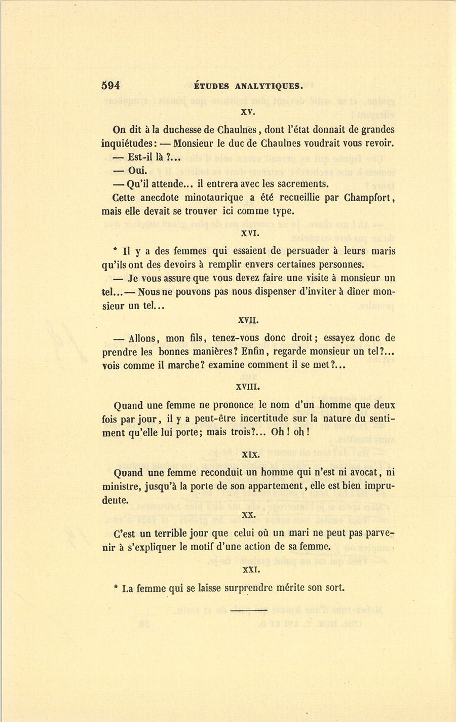 – Avez-vous remarqué, ma chère, que les femmes n’aiment en général que des sots ? – Que dites-vous donc là, duchesse ? et {p. 343} comment accorderez-vous cette remarque avec l’aversion qu’elles ont pour leurs maris ? – (Mais c’est une tyrannie ! se dit l’auteur. Voilà donc maintenant le diable en cornette ?…) – Non, ma chère, je ne plaisante pas ! reprit la duchesse, et il y a de quoi faire frémir pour soi-même, depuis que j’ai contemplé froidement les personnes que j’ai connues autrefois. L’esprit a toujours un brillant qui nous blesse, l’homme qui en a beaucoup nous effraie peut-être, et s’il est fier, il ne sera pas jaloux, il ne saurait donc nous plaire. Enfin nous aimons peut-être mieux élever un homme jusqu’à nous que de monter jusqu’à lui… Le talent a bien des succès à nous faire partager, mais le sot donne des jouissances ; et nous préférons toujours entendre dire : « Voilà un bien bel homme ! » à voir notre amant choisi pour être de l’Institut. – En voilà bien assez, duchesse ! vous m’avez épouvantée.