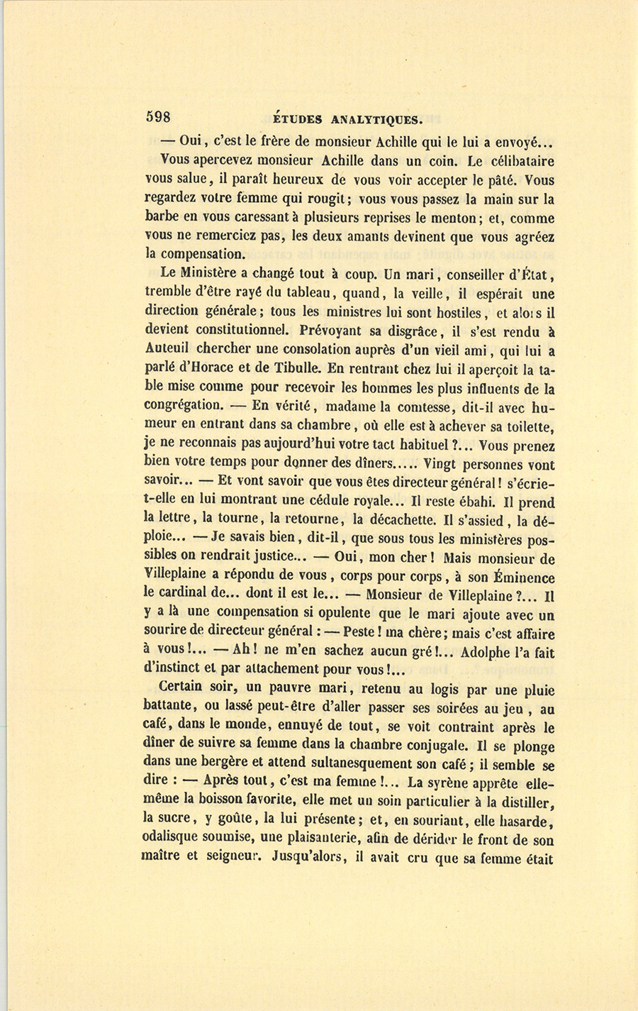 Le Ministère a changé tout à coup. Un mari, conseiller d’État, tremble d’être rayé du tableau, quand, la veille, il espérait une direction générale ; tous les ministres lui sont hostiles, et alors il devient constitutionnel. Prévoyant sa disgrâce, il s’est rendu à Auteuil chercher une consolation auprès d’un vieil ami, qui lui a parlé d’Horace et de Tibulle. En rentrant chez lui il aperçoit la table mise comme pour recevoir les hommes les plus influents de la congrégation. – En vérité, madame la comtesse, dit-il avec humeur en entrant dans sa chambre, où elle est à achever sa toilette, je ne reconnais pas aujourd’hui votre tact habituel ?… Vous prenez bien votre temps pour donner des dîners… Vingt personnes vont savoir… – Et vont savoir que vous êtes directeur général ! s’écrie-t-elle en lui montrant une cédule royale… Il reste ébahi. Il prend la lettre, la tourne, la retourne, la décachette. Il s’assied, la déploie… – Je savais bien, dit-il, que sous tous les ministères possibles on rendrait justice… – Oui, mon cher ! Mais monsieur de Villeplaine a répondu de vous, corps pour corps, à son Éminence le cardinal de… dont il est le… – Monsieur de Villeplaine ?… Il y a là une compensation si opulente que le mari ajoute avec un sourire de directeur général : – Peste ! ma chère ; mais c’est affaire à vous !… – Ah ! ne m’en sachez aucun gré !… Adolphe l’a fait d’instinct et par attachement pour vous !…