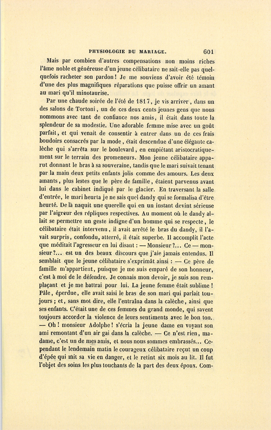 Par une chaude soirée de l’été de 1817, je vis arriver, dans un des salons de Tortoni, un de ces deux cents jeunes gens que nous nommons avec tant de confiance nos amis, il était dans toute la splendeur de sa modestie. Une adorable femme mise avec un goût parfait, et qui venait de consentir à entrer dans un de ces frais boudoirs consacrés par la mode, était descendue d’une élégante calèche qui s’arrêta sur le boulevard, en empiétant aristocratiquement sur le terrain des promeneurs. Mon jeune célibataire apparut donnant le bras à sa souveraine, tandis que le mari suivait tenant par la main deux petits enfants jolis comme des amours. Les deux amants, plus lestes que le père de famille, étaient parvenus avant lui dans le cabinet indiqué par le glacier. En traversant la salle d’entrée, le mari heurta je ne sais quel dandy qui se formalisa d’être heurté. De là naquit une querelle qui en un instant devint sérieuse par l’aigreur des répliques respectives. Au moment où le dandy allait se permettre un geste indigne d’un homme qui se respecte, le célibataire était intervenu, il avait arrêté le bras du dandy, il l’avait surpris, confondu, atterré, il était superbe. Il accomplit l’acte que méditait l’agresseur en lui disant : – Monsieur ?… Ce – monsieur ?… est un des plus beaux44 discours que j’aie jamais entendus. Il semblait que le jeune célibataire s’exprimât ainsi : – Ce père de famille m’appartient, puisque je me suis emparé de son honneur, c’est à moi de le défendre. Je connais mon devoir, je suis son remplaçant et je me battrai pour lui. La jeune femme était sublime ! Pâle, éperdue, elle avait saisi le bras de son mari qui parlait toujours ; et, sans mot dire, elle l’entraîna dans la calèche, ainsi que ses enfants. C’était une de ces femmes du grand monde, qui savent toujours accorder la violence de leurs sentiments avec le bon ton. – Oh ! monsieur Adolphe ! s’écria la jeune dame en voyant son ami remontant d’un air gai dans la calèche. – Ce n’est rien, madame, c’est un de mes amis, et nous nous sommes embrassés… Cependant le lendemain matin le courageux célibataire reçut un coup d’épée qui mit sa vie en danger, et le retint six mois au lit. Il fut l’objet des soins les plus touchants de la part des deux époux. {p. 602} Combien de compensations !… Quelques années après cet événement, un vieil oncle du mari, dont les opinions ne cadraient pas avec celles du jeune ami de la maison, et qui conservait un petit levain de rancune contre lui à propos d’une discussion politique, entreprit de le faire expulser du logis. Le vieillard alla jusqu’à dire à son neveu qu’il fallait opter entre sa succession et le renvoi de cet impertinent célibataire. Alors le respectable négociant, car c’était un agent de change, dit à son oncle : – Ah ! ce n’est pas vous, mon oncle, qui me réduirez à manquer de reconnaissance !… Mais si je le lui disais, ce jeune homme se ferait tuer pour vous !… Il a sauvé mon crédit, il passerait dans le feu pour moi, il me débarrasse de ma femme, il m’attire des clients, il m’a procuré presque toutes les négociations de l’emprunt Villèle… je lui dois la vie, c’est le père de mes enfants… cela ne s’oublie pas !…