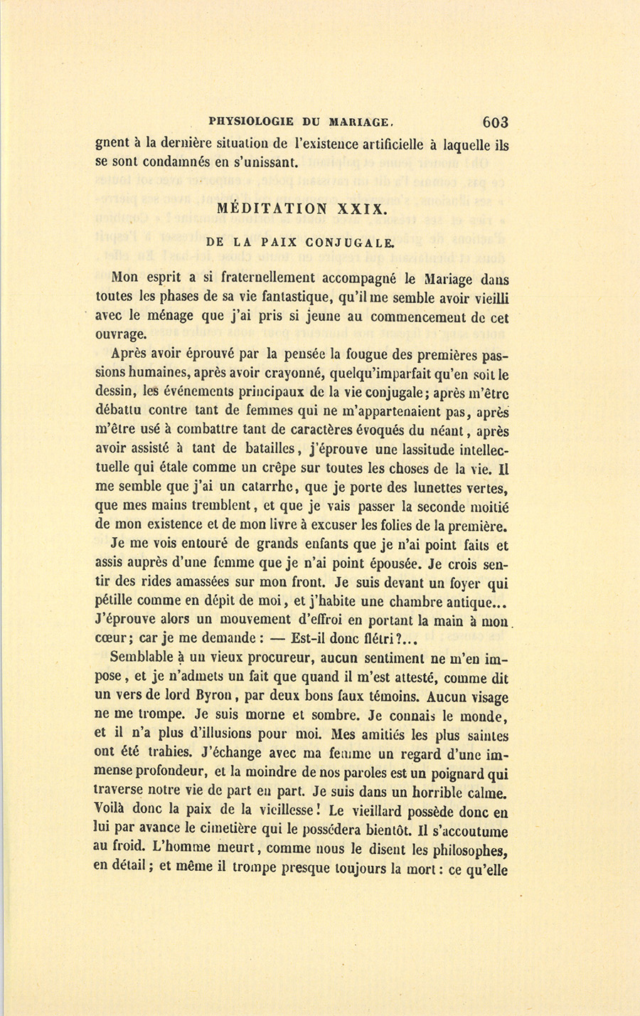 Après avoir éprouvé par la pensée la fougue des premières passions humaines, après avoir crayonné, quelqu’imparfait qu’en soit le dessin, les événements principaux de la vie conjugale ; après m’être débattu contre tant de femmes qui ne m’appartenaient pas, après m’être usé à combattre tant de caractères évoqués du néant, après avoir assisté à tant de batailles, j’éprouve une lassitude intellectuelle qui étale comme un crêpe sur toutes les choses de la vie. Il me semble que j’ai un catarrhe, que je porte des lunettes vertes, que mes mains tremblent, et que je vais passer la seconde moitié de mon existence et de mon livre à excuser les folies de la première.
