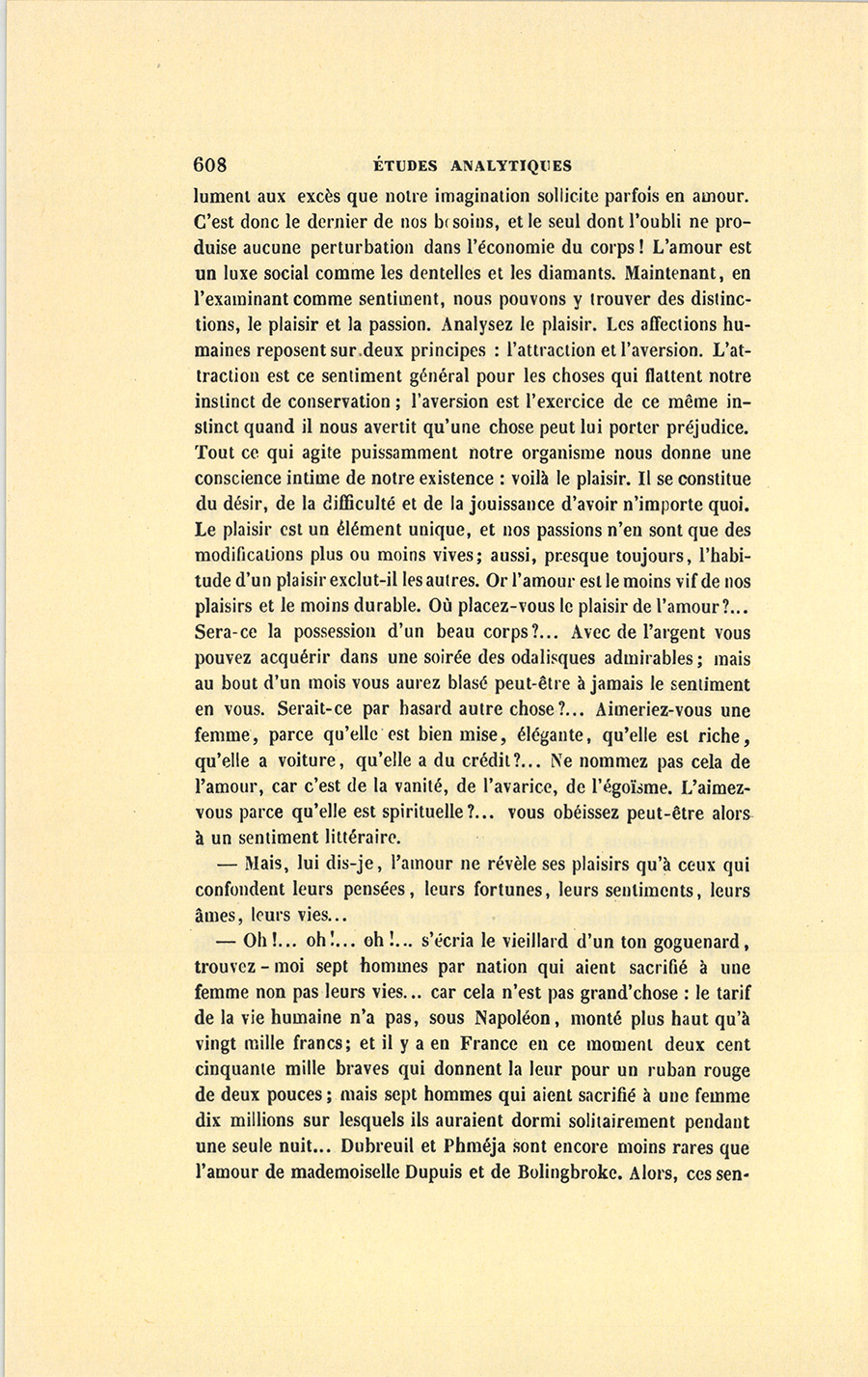 – Considéré comme besoin, dit le vieillard, l’amour se fait sentir le dernier parmi tous les autres, et cesse le premier. Nous sommes amoureux à vingt ans (passez-moi les différences), et nous cessons de l’être à cinquante. Pendant ces vingt années, combien de fois le besoin se ferait-il sentir si nous n’étions pas provoqués par les mœurs incendiaires de nos villes, et par l’habitude que nous avons de vivre en présence, non pas d’une femme, mais des femmes ? Que devons-nous à la conservation de la race ? Peut-être autant d’enfants que nous avons de mamelles, parce que, si l’un meurt, l’autre vivra. Si ces deux enfants étaient toujours fidèlement obtenus, où iraient donc les nations ? Trente millions d’individus sont une population trop forte pour la France, puisque le sol ne suffit pas à sauver plus de dix millions d’êtres de la misère et de la faim. Songez que la Chine en est réduite à jeter ses enfants à l’eau, selon le rapport des voyageurs. Or, deux enfants à faire, voilà tout le mariage. Les plaisirs superflus sont non-seulement du libertinage, mais une perte immense pour l’homme, ainsi que je vous le démontrerai tout à l’heure. Comparez donc à cette pauvreté d’action et de durée l’exigence quotidienne et perpétuelle des autres conditions de notre existence ! La nature nous interroge à toute heure pour nos besoins réels ; et, tout au contraire, elle se refuse {p. 608} absolument aux excès que notre imagination sollicite parfois en amour. C’est donc le dernier de nos besoins, et le seul dont l’oubli ne produise aucune perturbation dans l’économie du corps ! L’amour est un luxe social comme les dentelles et les diamants. Maintenant, en l’examinant comme sentiment, nous pouvons y trouver des distinctions, le plaisir et la passion. Analysez le plaisir. Les affections humaines reposent sur deux principes : l’attraction et l’aversion. L’attraction est ce sentiment général pour les choses qui flattent notre instinct de conservation ; l’aversion est l’exercice de ce même instinct quand il nous avertit qu’une chose peut lui porter préjudice. Tout ce qui agite puissamment notre organisme nous donne une conscience intime de notre existence : voilà le plaisir. Il se constitue du désir, de la difficulté et de la jouissance d’avoir n’importe quoi. Le plaisir est un élément unique, et nos passions n’en sont que des modifications plus ou moins vives ; aussi, presque toujours, l’habitude d’un plaisir exclut-il les autres. Or l’amour est le moins vif de nos plaisirs et le moins durable. Où placez-vous le plaisir de l’amour ?… Sera-ce la possession d’un beau corps ?… Avec de l’argent vous pouvez acquérir dans une soirée des odalisques admirables ; mais au bout d’un mois vous aurez blasé peut-être à jamais le sentiment en vous. Serait-ce par hasard autre chose ?… Aimeriez-vous une femme, parce qu’elle est bien mise, élégante, qu’elle est riche, qu’elle a voiture, qu’elle a du crédit ?… Ne nommez pas cela de l’amour, car c’est de la vanité, de l’avarice, de l’égoïsme. L’aimez-vous parce qu’elle est spirituelle ?… vous obéissez peut-être alors à un sentiment littéraire.